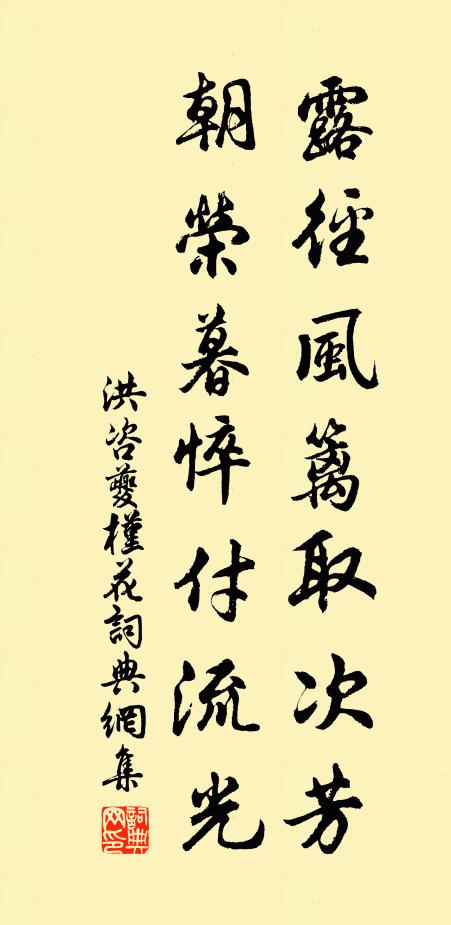 古詩文歷史字典書法欣賞書法字典國語詞典說文解字康熙字典古漢語字典露徑風籬取次芳,朝榮暮悴付流光洪咨夔 《槿花》名句出處出自宋代洪咨夔的《槿花》全文:露徑風籬取次芳,朝榮暮悴付流光。一秋朵朵紅相續,比著人情大段長。名句書法欣賞露徑風籬取次芳,朝榮暮悴付流光書法作品洪咨夔名句,槿花名句名句推薦被凍知不免,但恨太匆忙范成大《重陽後,半月天氣溫麗,忽變奇寒,晦日大雪》閒說河陽政,佳哉副所望張耒《次韻寄趙伯堅二首》芙蓉泣露坡頭見,桂子飄香月下聞虞儔《有懷漢老弟》風流笑伴相逢處,白馬游韁晏幾道《採桑子》江天梅雨畫蕭蕭,送別愁吟白紵謠穆修《送毛得一秀才歸淮上》扶持未可言門戶,老大相看只弟兄趙蕃《寄李舒州二首》荒骨或銜殘鐵露,驚風時掠暮沙旋黃滔《塞下》誰當九原上,鬱郁望佳城沈約《冬節後至丞相第詣世子車中作》相看兩經春張鎡《椶筍詩》無忌獨何人,猶能弭凶慝廖行之《送岳陽陳倅秩滿還朝八首》二乘困墮於空無,眾生執迷於分別釋正覺《偈頌七十八首》衣敝不羞狐貉,氣華正在詩書趙蕃《曾耆英見過題贈六言四首》入門雖較小,中卻是壺天施樞《高園》塵市月無色,醉鄉風亦腥陳著《次韻林國器元夕》至言啟茅塞,予方日孜孜程端蒙《送次卿兄還新安》詩詞推薦和馨果二友見寄韻釋行海〔宋代〕幾度懷歸浙水東,無端又下白雲中。當窗石色寒留雨,出洞猿聲靜帶風。崖底碧煙生暮景,樹頭紅子落晴空。酷憐官舍閒題白居易〔唐代〕職散優閒地,身慵老大時。送春唯有酒,銷日不過棋。祿米獐牙稻,園蔬鴨腳葵。飽餐仍晏起,餘暇弄龜兒。[龜杏花溫庭筠〔唐代〕紅花初綻雪花繁,重疊高低滿小園。正見盛時猶悵望,豈堪開處已繽翻。情為世累詩千首,醉是吾鄉酒一樽。杳杳四月癸已發潯陽館過濂溪飯於杏溪愒清虛庵宿魏了翁〔宋代〕欲識真人千古心,療飢獨有杏成林。豈無世上閒桃李,要使人從實行尋。諸公皆和詩再用韻並屬湛挺之七首趙蕃〔宋代〕投老知何地,此生休問天。未須悲坎軻,聊復寄蹁躚。但覺官如縛,渾忘詩似禪。不堪兒子誦,敢望故人傳。再渡胥口范成大〔宋代〕古來此地快蓬心,天繞明湖日照臨。一雁雲平時隱現,兩山波動對浮沉。衰髯都共荻花老,醉面不如楓葉深。罾戶臘月二日攜家城東觀梅夜歸張栻〔宋代〕前日看花正薄陰,重來晴日更精神。莫教容易飛花片,且放千林自在春。秋懷五首李謙〔宋代〕離離牽牛花,縈蔓繞業棘。秋風一披拂,苒苒弄寒色。物芳時輒改,百歲幾食息。長憂髀肉生,悲歌涕沾臆。夫以因於閒暇採集巴句幸寄孔目五言二十韻伏釋道猷〔宋代〕多幸遭逢處,知交信有恩。偏承相見重,頻沐厚光榮。眷戀常推許,人情每普平。人日重宴大明宮賜彩縷人勝應制沈佺期〔唐代〕拂旦雞鳴仙衛陳,憑高龍首帝城春。千官黼帳杯前壽,百福香奩勝里人。山鳥初來猶怯囀,林花未發已偷新。天文