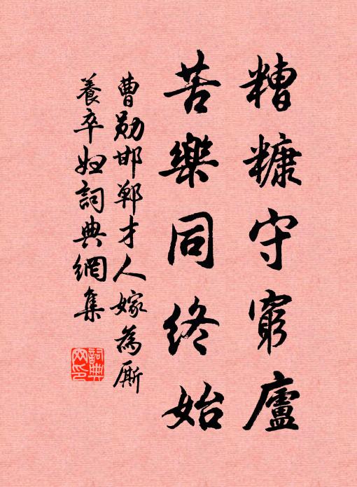 古詩文歷史字典書法欣賞書法字典國語詞典說文解字康熙字典古漢語字典糟糠守窮廬,苦樂同終始曹勛 《邯鄲才人嫁為廝養卒婦》名句出處出自宋代曹勛的《邯鄲才人嫁為廝養卒婦》全文:落葉逐驚風,落花逐流水。漂零無定端,寄託隨所委。朝榮瑤圃中,暮落窮轍里。豈不惡糟糠,豈不原羅綺。羅綺閉深宮,嫉妒交相磨。糟糠守窮廬,苦樂同終始。行藏宜自然,燕巢茅屋底。名句書法欣賞糟糠守窮廬,苦樂同終始書法作品曹勛名句,邯鄲才人嫁為廝養卒婦名句名句推薦自憐蓬逐吹,不得與良游歐陽詹《和嚴長官秋日登太原龍興寺閣野望》五位君臣,殊乖道體釋道寧《偈六十九首》渭水岐山不出兵,欲攜琴劍錦官城陸游《即事》垂簾獨衰疾,擊缶酬金奏崔元翰《清明節郭侍御偶與李侍御、孔校書、王秀才游開化寺臥病》漸老芙蓉,猶自帶霜宜看吳文英《倦尋芳》指顧枯河五十年,龍舟早晚定疏川范成大《汴河》萬億恆沙佛,皆同一性齊釋印肅《李總乾遺詩十四句師於一句之下加頌七句》黃鵠仙翁逝,青衿子姓多王炎《送謝庭玉二首》半春懷抱向誰開王灼《畫堂春》素弦彈不盡,眉峰斗蔡伸《感皇恩》何人祠廟立空山,四皓精靈合往還王禹偁《和仲鹹詩六首之五和題鳴馬廟》是間或小留,不妨月徜徉裘萬頃《送范光伯北行》沙磧人愁月,山城犬吠雲岑參《歲暮磧外寄元撝》寵名本自無心得,婦節從來澈骨清黃庚《和鄭樞山竹夫人韻》不知起胡越,相知風歲寒汪莘《訪孟守》詩詞推薦同諸友山行分袂言別五首程公許〔宋代〕神都旬浹住,大面欠窮探。未盡山中趣,重來賦蔚藍。菩薩蠻·江城烽火連三月李彌遜〔宋代〕江城烽火連三月。不堪對酒長亭別。休作斷腸聲。老來無淚傾。風高帆影疾。目送舟痕碧。錦字幾時來。薰風無雁大夫松徐夤〔唐代〕五樹旌封許歲寒,挽柯攀葉也無端。爭如澗底凌霜節,不受秦皇亂世官。張亞子廟宋祁〔宋代〕偉哉真丈夫,廟食此山隅。生作百夫特,死為南面孤。鹿庖償故約,雷杼驗幽符。潼水無時腐,英名相與俱。戲詠零陵李宗古居士家馴鷓鴣二首黃庭堅〔宋代〕山雌之弟竹雞兄,戶入雕籠便不驚。此鳥為公行不得,報晴報雨總同聲。送舍弟李白〔唐代〕吾家白額駒,遠別臨東道。他日相思一夢君,應得池塘生春草。上茶使鄒郎中孟程公許〔宋代〕廣文官獨冷,博士冗不治。況此侯國泮,贅哉童子師。蕭散非鄭老,文章慚退之。可能冰雪地,一借春風吹。賀新郎(三用韻寄舊宮怨)何夢桂〔宋代〕更靜鍾初定。卷珠簾、人人獨立,怨懷難忍。欲撥金猊添沉水,病力厭厭不任。任蝶粉、蜂黃消盡。亭北海棠還開友人婚楊氏催妝賈島〔唐代〕不知今夕是何夕,催促陽台近鏡台。誰道芙蓉水中種,青銅鏡里一枝開。暗室丘葵〔宋代〕一幾善惡未分時,善本無為莫偽為。暗室休言人不見,此心才動鬼神知。