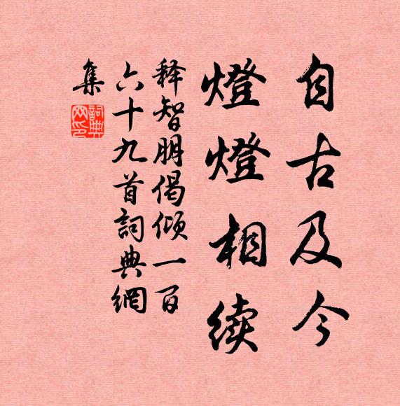 古詩文歷史字典書法欣賞書法字典國語詞典說文解字康熙字典古漢語字典自古及今,燈燈相續釋智朋 《偈傾一百六十九首》名句出處出自宋代釋智朋的《偈傾一百六十九首》全文:自古及今,燈燈相續。匝地普天,燈燈無間。助發實相義,今朝正月半。釋智朋詩詞大全名句書法欣賞自古及今,燈燈相續書法作品釋智朋名句,偈傾一百六十九首名句名句推薦觀時見物理,主敬得天真邵雍《觸觀物》寶雞道上冰雪晚,金雁江邊梅柳春賀鑄《送周元通昆仲官蜀》雲胡逐頹運,澆浮散其貞黎廷瑞《雜詩三首》高密非逢世,才堪學掾為方回《送劉元鼎》俗客避白眼,傲歌舞紅裳黃庭堅《觀秘閣蘇子美題壁及中人張侯家墨跡十九紙率》朝為白雪花,暮為浮萍草吳龍翰《離怨》為語觸宮圍,沈香亭里,瞋謫仙人劉克莊《木蘭花慢(壽王實之)》贏得東歸訪丘壑,約君同上釣魚舟樓鑰《秋日懷國仲觀》靜者習靜厭紛喧,游者趨歡窮旦暮毛滂《題雷峰塔南山小景》商山有遺廟,郭謂太古風劉克莊《蒙仲以二畫壽予生朝各題一詩》且憑東北風,持寄嶺頭雲王安石《定林寺》胡為趣召節,日日晨昏星曾幾《還守台州次陸務觀贈行韻》高歌誦唐虞,諸子有矜式陳深《送沈彥楚》須知有慾不為剛,血氣乘之反類狂張九成《論語絕句一百首》脫落章句卑,統宗而會元陳文蔚《寄題微州李君博文閣》詩詞推薦和趙制乾二絕句釋寶曇〔宋代〕今年賢弟去貪佛,平日阿兄真愛山。肯使道肥詩則瘦,王孫人物未斕斑。偈傾一百六十九首釋智朋〔宋代〕提折明星腳鐺,各明星出只手明星。釋迦不先,彌勒不後。妙用臨機,如盤珠走。鼓腹笑復歌,明星南看北斗。六九日次韻邢子友傅察〔宋代〕側身西望涕沾翰, * 丹萸又滿欄。偏插定應憐我還,從游誰復盡親歡。年過騎省悲秋易,貧似司空乞酒人。何日簡趙真休張煒〔宋代〕曾向詩壇奪錦袍,至今湖海誦風騷。何如放下渾無事,句不驚人意更高。菩薩蠻(同飲晁伯如家,席上和韓無咎韻)趙彥端〔宋代〕雪中梅艷風前竹。詩緣漸與情緣熟。醉眼眩成花。惱人生臉霞。巫雲將楚雨。只恐翩然去。我有合歡杯。為君聊挽再用前韻趙善括〔宋代〕我是忘機士,初非學二疏。瓮醅常得醉,瓶粟任無餘。天下眾生病,山中四壁虛。昔年芻豢口,今日伴鍾魚。得趙昌甫寄予及子遹詩陸游〔宋代〕去國雙蓬鬢,還山一鹿車。壯慚稽古淺,老悔養生疏。俗態慵開眼,高吟獨起予。青燈對餘子,並為問何如。山中方岳〔宋代〕莫怪山翁老更迂,竹庵終日一團蒲。萬言萬當不如默,百技百窮同是愚。往事自驚天大膽,近詩空捻雪成須。未憂江上遣心蘇泂〔宋代〕風帆等駿馬,突出不受羈。群山望如豆,轉盼羅窗扉。頃居長安城,小駟驅以馳。塵埃困煩促,滯留費憂思。不知田翁嘆於濆〔唐代〕手植千樹桑,文杏作中梁。頻年徭役重,盡屬富家郎。富家田業廣,用此買金章。昨日門前過,軒車滿垂楊。歸來