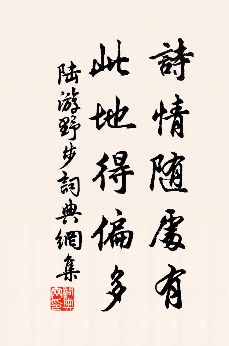 古詩文歷史字典書法欣賞書法字典國語詞典說文解字康熙字典古漢語字典詩情隨處有,此地得偏多陸游 《野步》名句出處出自宋代陸游的《野步》全文:堤上淡黃柳,水中花白鵝。詩情隨處有,此地得偏多。陸游詩詞大全名句書法欣賞詩情隨處有,此地得偏多書法作品陸游名句,野步名句名句推薦將謂今生,會合終無計趙令畤《蝶戀花》梁珪分楚牧鮑照《從臨海王上荊初發新渚詩》既與世不合,當令人事疎徐照《貧居》草得風光動,虹因雨氣成孟浩然《和張明府登鹿門作》世變茫茫不可期,珊瑚作婢搗黃糜方回《俳體戲書二首》胸中忿畜者,甕盎成項領郭印《夔州》蠻夷奉琛貢,月窟東扶桑李流謙《代上閬中章使君》嗟予景薄崦嵫矣,臨履淵冰尚凜然劉克莊《和興化趙令君二首》石榴花蹙宮羅樣,荔子枝翻蜀錦紅吳儆《贈吳令君》倒橐得千錢,從人買釣船陸游《雜興》廢寺林溪上,頹垣倚亂峰杜牧《池州廢林泉寺》六關天樣險,莫遣賊飛能劉克莊《寄左次魏二首》莫學班超投筆,縱得封侯萬里,憔悴老邊州辛棄疾《水調歌頭·落日古城角》竹聲滿道院,山光入書樓胡瑗《石壁》紫芝奕奕浮香氣,碧草纖纖沒燒痕汪元量《商山廟》詩詞推薦送從子淵葬樓鑰〔宋代〕晨起霜如雪,天寒水欲冰。引舟拖急瀨,扶杖歷危層。北阮苦多事,二疎俄喪朋。山阿埋白璧,悲慟不能勝。送仇仁近持山村圖求屋貲方回〔宋代〕浪多年二十,是事弗如之。老我初登第,聞君早解詩。風霜懸齒頰,錦繡簇肝脾。才是通漫刺,誰非獻屈卮。貴人春日小園即事十首方回〔宋代〕傍宅荒山幾許長,蕘夫芸子縱牛羊。何當盡與栽桃李,疊石周遭築短牆。朱喬年風傅茂見訪劉子翬〔宋代〕眼食咍台時對床。山林情話政可樂,手談逼剝屢爭局,只恐雲路雙鵰翔。又寄王都官宋祁〔宋代〕倦把菱花照病容,蕭蕭斑鬢作衰翁。虞翻到骨終無媚,阮籍逢途但有窮。敢望君恩收墜屨,決須私計付冥鴻。銜盃思歸示兒輩陸游〔宋代〕睡味甜如蜜,人情冷似漿。流年垂及耄,客子固多傷。興發雞豚社,心闌翰墨場。吾兒姑力穡,莫羨笏堆床。邁陂塘李治〔唐代〕雁雙雙,正分汾水,回頭生死殊路天長地久相思債,何似眼前俱去!摧勁羽,倘萬一幽冥,卻有重逢處詩翁感遇。山房陸游〔宋代〕擾擾人間歲月移,山房幾度換茅茨。身游與世相忘地,詩到令人不愛時。老鶴初來未丹頂,稚松親種已虯枝。東塗泉石軒初秋乘涼小荷池上楊萬里〔宋代〕芙蕖落片自成舡,吹泊高荷傘柄邊。泊了又離離又泊,看他走遍水中天。題文丞相吟嘯集李謹思〔宋代〕南人不識兩膝貴,曲折百態卑且勞。斯人護膝不護頭,故以頸血沾君刀。蟠胸孤憤擘不碎,殺氣千丈纏旌旄。援桴