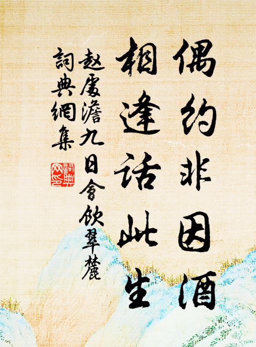 古詩文歷史字典書法欣賞書法字典國語詞典說文解字康熙字典古漢語字典偶約非因酒,相逢話此生趙處澹 《九日會飲翠麓》名句出處出自宋代趙處澹的《九日會飲翠麓》全文:山亭對佳客,秋老暮煙橫。鳥下江如畫,潮回浪有聲。竹光添麓潤,詩思入門清。偶約非因酒,相逢話此生。趙處澹詩詞大全名句書法欣賞偶約非因酒,相逢話此生書法作品趙處澹名句,九日會飲翠麓名句名句推薦怎奈向而今,雨誤雲乖石孝友《滿庭芳(次范倅憶洛陽梅)》江流去不窮,山色凌秋旻權德輿《嚴陵釣台下作》嘗聞膠漆固,亦曰金蘭如釋文珦《言交》疊翠影低珠幰重,洗妝人倦玉容真陳造《縣圃酴醾》潭潭深院鐍扃牢,闕日濕雲作鬱陶曾國藩《丁未六月七日考試漢教習試院作二首》今日看雲意,依依入帝鄉李商隱《商於》鶴識小溪路,鍾聞上界天徐夢發《龜山禱雨》有書莫焚稿,無恨豈傷弓杜豐《送胡季昭謫象郡》月中有桂樹,無翼難上天權德輿《古興》暫愒即弱水,款關必清都張嵲《癸亥生日前一日讀神仙李清傳作》願傳飛仙術,一洗侷促悲,被襟閬風觀,濯發扶桑池陳與義《北征》日聞暝蠃譏狂率,目送鯤鵬簉紫清陳造《苦雨再次前韻》夫子昔相魯,侵疆自齊歸文天祥《自汶陽至鄆》小智好自私,小德常自足楊時《枕上》數年侍從立丹墀,掌誥長慚格調卑王禹偁《和安邑劉宰君見贈》詩詞推薦離山陽張舜民〔宋代〕日日東南去,空勞北望魂。孤帆轉城角,返照入船門。強飯甘魚菜,隨方學語言。蛙聲不忍聽,為似故山村。十月十四夜月終夜如晝陸游〔宋代〕月從海東來,徑尺熔銀盤,西行到峨眉,玉宇萬里寬。幽人耿不寐,弄影清夜闌。五城十二樓,縹緲香霧間,不知和刑部成員外秋夜寓直寄台省知己岑參〔唐代〕列宿光三署,仙郎直五宵。時衣天子賜,廚膳大官調。長樂鍾應近,明光漏不遙。黃門持被覆,侍女捧香燒。筆為過明智寺舒岳祥〔宋代〕每過明智寺,涉寺在山前。老衲分雲坐,山猿抱子眠。岩花紅雜雨,野水綠平田。火後傷心處,青山響杜鵑。維摩居士贊釋慧遠〔宋代〕到處毀僧罵佛,知佗有官無官。善現屢遭呵責,瞿曇也被勢謾。只有文珠不肯,吃氣出來理問。遮漢自知無理,當催梅林景熙〔宋代〕參橫月落幾相思,第一春風向此期。乘興竹筇霜後路,寄聲籬落水邊枝。禁中鼓絕花奴老,海上宮深鳥使遲。獨抱元蘇二公祠曹豳〔宋代〕兩公千載士,出處不須齊。好事趙明府,合祠元瀼溪。清芬蘭馥馥,往事草萋萋。新額人瞻仰,知君手自題。和樓大防韻吳芾〔宋代〕嗟余本何人,累然居海嶠。家世業為農,有田在岩窔。春到耦妻耕,寒來從母漂。屋角日誅茅,杖頭時荷蓧。迨冠游寶掌山寺方鳳〔宋代〕茲辰欲有適,軒車偶來駸。劚苔北村南,荒竹晴窗陰。接語未及久,相邀指叢林。澗行任詰曲,岩眺經嶔崯。於時有懷子肅讀其詩卷因成數語趙蕃〔宋代〕退之以文鳴,餘事尤長詩。名家賈孟流,未必逾於斯。淵明工五言,亦有歸來辭。乃知意到處,百發無一虧。孫侯