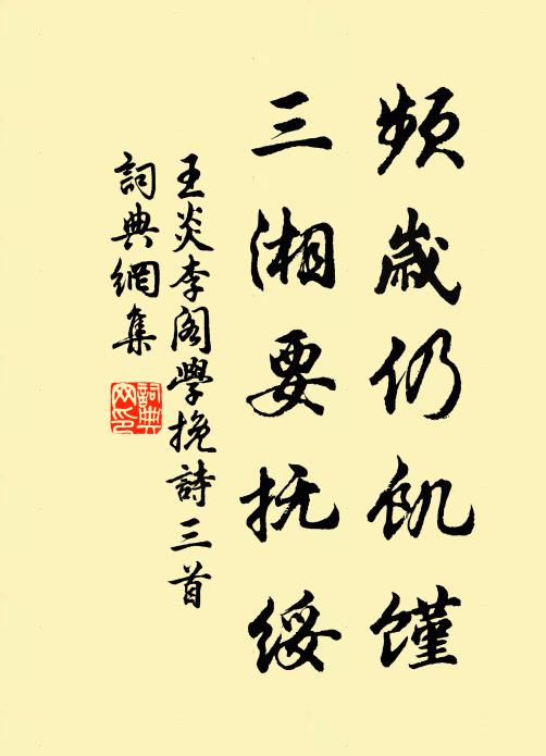 古詩文歷史字典書法欣賞書法字典國語詞典說文解字康熙字典古漢語字典頻歲仍饑饉,三湘要撫綏王炎 《李閣學輓詩三首》名句出處出自宋代王炎的《李閣學輓詩三首》全文:頻歲仍饑饉,三湘要撫綏。分憂承帝命,遺愛結民思。自有欒公社,何須叔子碑。若書耆舊傳,清德不磷緇。名句書法欣賞頻歲仍饑饉,三湘要撫綏書法作品王炎名句,李閣學輓詩三首名句名句推薦笙歌一曲思凝絕,金鈿再拜光低昂白居易《九日宴集,醉題郡樓,兼呈周、殷二判官》動斡運參羅斗柄隨侯善淵《沁園春》洗玉空明,浮珠沆瀣,人靜籟沈波息周密《齊天樂·清溪數點芙蓉雨》哀歌行欲絕,丹旐雨斑斑黃庭堅《樂壽縣君呂氏輓詞二首》冠纓塵已滿,未敢濯滄浪王禹偁《官成武主簿作五首》鳳銜燈照蕊珠筵,韻雙琯、鈞聲已奏仲殊《步蟾宮》有義曾分客,無偷不禁兒陳舜俞《山中詠橘長詠》如日之光,光照無方釋祖欽《道可道者》誅其姑息人,戢彼因循吏張舜民《送羅正之年兄出使二浙》生長天垂力,孤懸有作奇陳宓《亭上茅寄生》如今老將雖無勇,憶拔蟊弧尚激昂強至《秋試甫期輒成短篇呈馬公節裴進士光世》寵服降從丹鳳闕,禪房歸掩赤城霞黃宗旦《送僧歸護國寺》何名半峰亭,堯峰路之半蔣堂《再題半峰亭》了知空洞元無物,須信清明自有神仇遠《集虛書院》糢糊滓塵土,剝蝕遭晴霖袁說友《遂寧府庫古銅物》詩詞推薦次李校書韻嘲閣下紅梅項安世〔宋代〕托跡千花冀可曹,冰姿何敢露秋毫。只隨婢子希紅藥,肯信仙家有碧桃。照影日華烘玉頰,承恩衢勺醉香醪。自拋贈歐陽明府杜荀鶴〔唐代〕賢宰宰斯邑,政聞閭裡間。都緣民訟少,長覺吏徒閒。帆落樽前浦,鐘鳴枕上山。回舟卻惆悵,數宿釣魚灣。無訟堂阮閱〔宋代〕欲為袁人弭謗聲,因將無訟榜堂名。他時茇舍棠休剪,近日環扉草已生。自是索瘢求大察,卻疑束矢聽難明。要知和伍武仲歐陽鈇〔宋代〕未知一歲於此水,幾回照影慚棲棲。失身竟墮管城計,錯路不為田舍兒。玉燭新(和方時父,並懷孫季蕃)趙以夫〔宋代〕寒寬一雁落。正萬里相思,被渠驚覺。春風字字吹香雪,喚起西湖盟約。當時醉處,仿佛記、青樓珠箔。又不是,相思曲戴叔倫〔唐代〕高樓重重閉明月,腸斷仙郎隔年別。紫蕭橫笛寂無聲,獨向瑤窗坐愁絕。魚沈雁杳天涯路,始信人間別離苦。恨滿次韻蘇公督兩歐陽詩陳師道〔宋代〕吟聲正可候蟲鳴,酒面猶須作老兵。豈有文章妨要務,孰知詩律自前生。向來懷璧真成罪,未必含光不屢驚。血指車中作陸游〔宋代〕秋天近霜霰,吳地少風麈。時駕小車出,始知閒客真。新交孰傾蓋?往事漫沾巾。處處皆堪隱,桃源莫問津。米盡鄭剛中〔宋代〕米賤今年不論錢,雀鼠饜飫人留殘。青蚨不過百枚去,可得明珠一斗還。共如客寄已淹久,羞澀囊中無可看。今朝贈魏野釋宇昭〔宋代〕別業唯栽竹,多間亦好奇。試泉尋寺遠,買鶴到家遲。藥就全離母,詩高祇教兒。未能終住此,共有海山期。