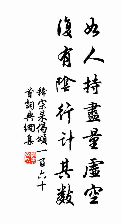 古詩文歷史字典書法欣賞書法字典國語詞典說文解字康熙字典古漢語字典如人持儘量虛空,復有陰行計其數釋宗杲 《偈頌一百六十首》名句出處出自宋代釋宗杲的《偈頌一百六十首》全文:如人持儘量虛空,復有陰行計其數。虛空邊際不可得,吾君壽量亦如是。釋宗杲詩詞大全名句書法欣賞如人持儘量虛空,復有陰行計其數書法作品釋宗杲名句,偈頌一百六十首名句名句推薦紅袖高摟臨大道沈祖棻《蝶戀花》仰德心如是,清風不我傳李鹹用《望仰山憶玄泰上人》說與妻孥貧自好,相看一笑有春暉陳著《次單君范袖來汪西皋所譔詠秋十章以示因和之》吳猛幽閨毓彩鸞,飛瓊相約下人寰許月卿六《次韻胡同年女》雲低翠帳,煙銷素被,簽動重幔張先《塞垣春》狀元宰相平生事,雅意中原願執鞭許月卿《和趙資相》坐見萋萋芳草綠韓翃《和高平朱(一作米)參軍思歸作》閉門著辨誣,其事已合轍岳珂《予控免不獲命恭讀詔書聖訓有朕正欲為卿直前》幽居人世外,久厭市朝喧李德裕《春暮思平泉雜詠二十首書樓晴望》移床解衣帶,坐任清風吹白居易《池畔閒坐,兼呈侍中》調知白雪陽春別,香到黃花晚節聞李曾伯《挽別大參二首》戲衫脫了無羈束,縱見三公手懶叉劉克莊《疥癬二首》一瓢誰合飲,高士觀中居張鎡《名新釀曰白鷗波以一尊送佑聖觀劉高士》午夜橫眠看星斗,玉柄搖搖似招手張埴《寄黃秀峰》咳唾落江東,江東兩眼中陳師道《登鳳凰山懷子瞻》詩詞推薦示丁都院釋崇岳〔宋代〕三千條法為今時,一性圓明要自知。會得自知知底事,人間何處不光輝。清涼寺孫應時〔宋代〕勝絕清涼寺,低迷德慶堂。崇阿納遐景,遺貴想前王。豪傑兵戈後,風流翰墨場。憑欄意何極,歸鳥度斜陽。句姜夔〔宋代〕中興無限艱難意,日暮湖平力士歸。嘉禾百詠樂郊亭張堯同〔宋代〕竹下清風好,時來掛幅巾。待逢田叟問,知是樂郊人。次韻道輔丈荊州吟四首吳則禮〔宋代〕田園歲晚欲榛蕪,短褐蒼顏與世疏。華屋徒驚棲萬卷,傷心投老已捐書。句羅椅〔宋代〕華裾客子袖文過。jm全宋詩卷三二九一送劉元發歸鄱陽次其韻王之道〔宋代〕杖藜千里訪茅茨,來赴當年一笑期。白髮我徒悲老大,青山君尚記艱危。夜聽高論因忘寐,晝味新詩可療飢。冬日和趙養正春日游魏園王之道〔宋代〕藜杖芒鞋信腳行,宿雲披絮雨初晴。溪邊草色青氈合,竹外山光翠蓋橫。弱柳弄閒無限思,小桃含笑不勝情。清明馬嵬二首黃滔〔唐代〕鐵馬嘶風一渡河,淚珠零便作驚波。鳴泉亦感上皇意,流下隴頭嗚咽多。龍腦移香鳳輦留,可能千古永悠悠。夜台和江上觀潮蔡襄〔宋代〕地卷天回出海東,人間何事可爭雄。千年浪說鴟夷怒,一信全疑渤澥空。寂靜最宜聞夜枕,崢嶸須待駕秋風。尋思