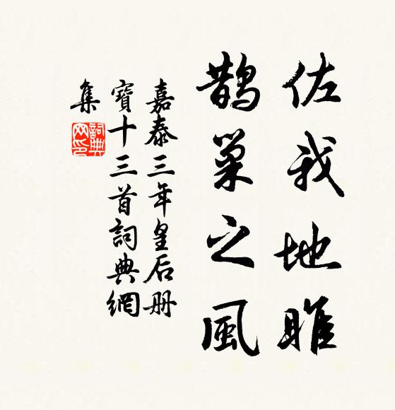 古詩文歷史字典書法欣賞書法字典國語詞典說文解字康熙字典古漢語字典佐我地雎,鵲巢之風佚名 《嘉泰三年皇后冊寶十三首》名句出處出自宋代佚名的《嘉泰三年皇后冊寶十三首》全文:婦榮於室,通籍禁中。班列有次,車服有容。佐我地雎,鵲巢之風。被之僮僮,曷不肅雍。佚名詩詞大全名句書法欣賞佐我地雎,鵲巢之風書法作品佚名名句,嘉泰三年皇后冊寶十三首名句名句推薦梅林樓閣上嵯峨,淺淥浮澌亦自波李處權《雪後赴徐氏招呈德孺》並花排綵樹,分月送遊人宋祁《擬明月逐人來》徐看血汗沫,透出青連錢蒲壽宬《神駿歌送趙委順就漕》道是閒人沒動績,一枝樵斧一漁蘘楊萬里《醉吟二首》猶嗟石橋畔,凡聖路岐分楊侃《送梵才上人歸天台》飢餐蘭菊枝枝月,醉灑雲煙句句霜楊萬里《送廬陵宰趙村老》更辦歸裝攟珠玉,一時人物各詩人陳造《陳主管招飲》從來幾許如君貌,不肯如君墜玉樓汪遵《綠珠》百尺江上起,東風吹酒香陸龜蒙《奉和襲美酒中十詠酒樓》經時駐歸棹,日夕對平川高適《漣上題樊氏水亭》能來西疇清坐一榻橫,長飢亦不轑釜雲無羹晁補之《依韻和子充雜言》君細推,今古幾人知白樸《【中呂】陽春曲_知幾知榮知》高風邈難樣,離抱曷其救韓維《答蘇子美見寄》山色忽相送,江流不作聲孫應時《道中寄同舍》落成鼓吹震百里,意氣欲壓秦山川陸游《題郭太尉金州第中至喜堂》詩詞推薦歲暮書事十二首張耒〔宋代〕陳葉不肯墮,凍醪凝未融。寒林晴有影,霜日冷無風。許國片心壯,勞生雙鬢蓬。功名任愚智,萬事古今同。蔽月山房王守仁〔明代〕山近月遠覺月小,便道此山大於月。若有人眼大如天,當見山高月更闊。相州郡樓贈高秘丞四錫〔宋代〕年來歸興憶皇州,頻向花時倚郡樓。南陌春光芳樹遠,西郊山色晚雲浮。國家無事邊陲靜,風俗還淳禮讓修。吟得漁具詩釣車陸龜蒙〔唐代〕溪上持只輪,溪邊指茅屋。閒乘風水便,敢議朱丹轂。高多倚衡懼,下有折軸速。曷若載逍遙,歸來臥雲族。高宗郊祀前廟朝享太廟三十首真宗〔宋代〕穆穆英宗,持盈守城。世德作求,是纉是承。齊家睦族,偃武恢文。於牙清酤,酌之欣欣。句夏侯嘉正〔宋代〕兩制誠堪美,青雲侍玉輿。吉之南門外見木芙蓉爛開曾豐〔宋代〕小春催出傾城色,笑倚牆頭若招客。芬芳猶帯秋風殘,婀娜豈宜江路側。詩眼驚紅狂欲呼,熟看似細又似粗。花神八聲甘州朱雍〔宋代〕聽琤琤漏永,洗銀林、梅英半寒收。正蟾輝舒粉,雲容縷色,切近妝樓。人在東風佇立,悄悄獨凝眸。多少橫斜影性情吟邵雍〔宋代〕踐形治性,踐跡治情。賢人踐跡。聖人踐形。踏莎行柴元彪〔宋代〕淺柳平蕪,亂煙疏雨。雁聲叫徹蘆花渚。亭前落葉又西風,斷送離懷無著處。切切歸期,盈盈尺素。斷魂正在西興