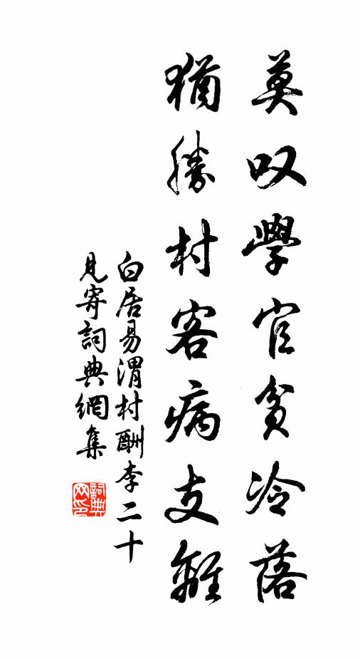 古詩文歷史字典書法欣賞書法字典國語詞典說文解字康熙字典古漢語字典莫嘆學官貧冷落,猶勝村客病支離白居易 《渭村酬李二十見寄》名句出處出自唐代白居易的《渭村酬李二十見寄》全文:百里音書何太遲?暮秋把得暮春詩。柳條綠日君相憶,梨葉紅時我始知。莫嘆學官貧冷落,猶勝村客病支離。形容意緒遙看取,不似華陽觀里時。名句書法欣賞莫嘆學官貧冷落,猶勝村客病支離書法作品白居易名句,渭村酬李二十見寄名句名句推薦退公求靜獨臨川,揚子江南二月天徐鉉《京口江際弄水》提挈何狼籍,奔趨適詐狂王冕《自崔鎮至濟州人情風俗可嘆三十韻》如何一代多人傑,稽首稱藩鼻不酸華岳《寄楊渭夫》萬古招行人,誰與賞心會王銍《送王道元運判致政歸潛皖》向六時勤顧,三更不睡,呼男呼女,採取回倉王玠《沁園春 耕》乘查信斷,搘機人去,誤了橋邊訊息魏了翁《鵲橋仙(七夕之明日載酒李彭州炁家即席賦)》泠泠徹夜,誰是知音者納蘭性德《清平樂·彈琴峽題壁》可惜飛龍臥荒櫪,閒看翠翮落虛弦王灼《次韻晁子與》秋能揠而春,紅可幻以白洪咨夔《馬城詩寄趙耤令》忍愧讀終篇,喜驚改肝脾王令《謝李常伯》山南山北有幽囀,樹底樹頭惟落英吳則禮《同曾公卷出南城》寵秩拜春坊,歸休識慮長蔣堂《贈陳虞卿》梨笑清都月,蜂游紫殿春元稹《蟲豸詩。蛒蜂(三首)》金傍朱扉此帝居,舊遊恍似夢清都劉克莊《夢與尤木石論史感舊七絕句》幸遇清朝有良鑒,退身爭忍似方乾王正已《贈廖融》詩詞推薦初著刺史緋答友人見贈白居易〔唐代〕故人安慰善為辭,五十專城道未遲。徒使花袍紅似火,其如蓬鬢白成絲?且貪薄俸君應惜,不稱衰容我自知。銀印偶見官舍梅花作劉翼〔宋代〕晝倚籃輿餞一杯,殷勤別語到簾幃。那知此夜成長往,書屋無人月掩扉。山末劉過〔宋代〕山末疏紅尾尾霞,晚煙叢薄是人家。移船更喜吹香好,枸橘藥開媚淺沙。理髮袁說友〔宋代〕揀發亭移晝,臨風手獨搔。愁添絲幾縷,老怯鬢雙毛。自嘆頭顱薄,空懷膽氣豪。年華莫相逼,疏櫛已細繅。訪陳復齋寺丞於私第戴復古〔宋代〕以時為出處,真有古人風。奉母易為孝,事君難盡忠。閒居非傲世,直氣尚摩空。語及朝廷事,乾坤萬感中。頌證道歌證道歌釋印肅〔宋代〕住相布施生天福,不用贊龜並買卜。分毫不贈自家修,如影隨形皆具足。書事周緒〔宋代〕北客樂馳驅,髀肉渾不生。輕風入馬蹄,一瞬萬里平。朝髮長安都,暮抵受降城。陰山聞鬼哭,征人晝夜行。黃塵句吳耕〔宋代〕釣龍台古臨滄海,浴鳳池高入紫煙。贈顧梅山雷苦齋〔宋代〕攜手河梁送子卿,池塘青草夢中生。武林今有梅山老,五字才高筆代耕。江城子韓淲〔宋代〕雪消霜入小溪舟。試浮游。上山頭。薄薄寒煙,依舊未全收。問道梅花開也未,吟不盡,一春愁。襟懷如此老還休