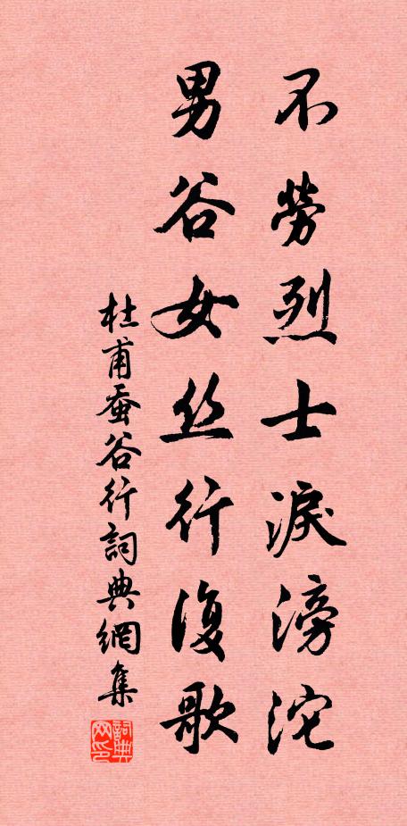 古詩文歷史字典書法欣賞書法字典國語詞典說文解字康熙字典古漢語字典不勞烈士淚滂沱,男谷女絲行復歌杜甫 《蠶谷行》名句出處出自唐代杜甫的《蠶谷行》全文:天下郡國向萬城,無有一城無甲兵。焉得鑄甲作農器,一寸荒田牛得耕。牛盡耕,蠶亦成。不勞烈士淚滂沱,男谷女絲行復歌。名句書法欣賞不勞烈士淚滂沱,男谷女絲行復歌書法作品杜甫名句,蠶谷行名句名句推薦遙知倚廬處,流淚漬蒼苔晁公溯《寄李仁甫》松鶴算,珪璋德管鑒《滿江紅(寄壽宋子淵,宋生朝先餘一日)》不識而今我向子諲《點絳唇(代棲隱曇老)》宮妝爭捧黃金注曹勛《菩薩蠻(和賀子忱)》持此欲求交,滿目都倀倀郭印《和樊直夫兼簡允南》來時似覺秋猶熱,去日忽驚秋已深吳芾《久欲乞歸未得一日蒙恩放歸不勝欣喜塗中得十》泠然禦寇車,為君駐戶牖曹勛《和錢處和扇車》掃清六合塵,景象回閶闔程公許《擬古二章》蒲葵那可比,徒用隔炎氛張莒《元日望含元殿御扇開合(大曆十三年吏部試)》城中殊未有梅看,莫是冬暄欠淺寒楊萬里《曉炊黃竹莊三首》燕客思遼水庾信《擬詠懷詩 三》華途不須移步到,憂國憂君心日老李流謙《送蘇給事出知太平州》雲影漸隨風力退李彌遜《蝶戀花(游南山過陳公立後亭作)》我意豈如是,願參天地功陸龜蒙《素絲》寧人之功,是履是踐岳珂《英宗皇帝寧字御漢體書贊》詩詞推薦偈頌十五首釋法薰〔宋代〕夫子不識字,達磨不會禪。御樓看射獵,不是刈茅田。題終南山隱者室齊己〔唐代〕終南山北面,直下是長安。自掃青苔室,閒奇支白石看。風吹窗樹老,日曬竇雲乾。時向圭峰宿,僧房瀑布寒。句林傑〔唐代〕金盤摘下掛朱顆,紅殼開時飲玉漿。雜述林泳〔宋代〕竺仟論五百劫,蒙叟夸八千春。但聞堯舜氏作,誰識羲黃上人。效李商隱張耒〔宋代〕夜深傳警報更籌,霜桂月華寒未收。昨夜雨昏今日朗,一番風雨一番愁。驛樓韓偓〔唐代〕流雲溶溶水悠悠,故鄉千里空回頭。三更猶憑闌乾月,淚滿關山孤驛樓。送嚴維赴河南充嚴中丞幕府劉長卿〔唐代〕久別耶溪客,來乘使者軒。用才榮入幕,扶病喜同樽。山屐留何處,江帆去獨翻。暮情辭鏡水,秋夢識雲門。蓮府東窗遣興陸游〔宋代〕巷陌過從少,園林景物新。群魚時戲藻,馴雉每依人。映戶槐陰密,堆盤麥餌珍。殘春又陳跡,憮事一傷神!祁國正獻公輓歌三首司馬光〔宋代〕先子同烏府,知音誠皦然。脫縗來拜伏,撫首辱哀憐。迨此泉扃掩,空悲塵綱牽。無由懷酒絮,撇涕望新阡。三聖殿陳良翰〔宋代〕巨鎮標閩越,靈蹤肇晉齊。空壇仙一去,古洞佛雙棲。化石龜猶在,燒丹井已迷。塵襟誰復悟,惟聽曉猿啼。