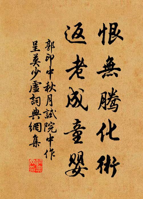 古詩文歷史字典書法欣賞書法字典國語詞典說文解字康熙字典古漢語字典恨無騰化術,返老成童嬰郭印 《中秋月試院中作呈莫少虛》名句出處出自宋代郭印的《中秋月試院中作呈莫少虛》全文:月色本無別,殊觀空世情。今宵雲四卷,冰蟾照寰瀛。無端坐文闈,兀若翳雙睛。窺牖偶一見,始驗陰陽並。孤光何自來,遡日以為明。三五魄既絕,輪郭自充盈。循環到今夕,逢金氣轉清。乃知造物意,微妙不可名。伊余稟賦初,二曜同流行。呼吸即寒暑,乾坤屹崢嶸。隋珠彈高鳥,惜哉輕此生。恨無騰化術,返老成童嬰。要須驗羲易,觀象研其精。聖處儻心悟,超然合混成。名句書法欣賞恨無騰化術,返老成童嬰書法作品郭印名句,中秋月試院中作呈莫少虛名句名句推薦可堪高頁病,無賴晚花香晁說之《秋陰》五既邁斯仁陸雲《答顧秀才詩》君如竹林有雋子,我類犬子睎相如趙蕃《次韻斯遠夜歸自溪南之作》五行幽機暢,三蕃妙鍵開蘇味道《和武三思於天中寺尋復禮上人之作》東堂質疑匙啟鑰,西廂坐講水赴壑葉適《送林孔英》登高峰兮俯幽谷,心悴悴兮念群木元結《演興四首訟木魅》應是仙娥宴歸去,醉來掉下玉搔頭江奎《茉莉花》樓壓重湖實壯哉,樓前圖畫若天開方回《煙雨樓》五斗自慚腰不折,四方安得口能糊黃庚《寄峽山胡府判》丁令飛升去,千年始一歸王銍《徐師川典祀廬山延真觀用送駒父韻餞別四首》多少飛花悠揚,送征輪南陌李壁《好事近(餞交代勸酒)》不見昭昭端的處,分明全體是如何陳普《一線天》知笑屠龍誤,時須畫鶩成陳造《次韻趙帥四首》澄潭百丈清無淤,將往思我立踟躇蘇轍《四月二十八日新熱寄仇池》沙禽古水閒相趁,悞入疏簾靜卻回何異《題環翠閣》詩詞推薦冠丁謂〔宋代〕盛禮尊元服,嘉名重進賢。窮奢譏鵔鵲,極品貴貂蟬。就列峨章甫,瞻顏仰邃延。誰知遠遊制,寵錫自高天。失調名吳德遠〔宋代〕過平康巷陌綺羅叢。贏得佳人,妙舞艷歌,爭勸金鍾。鷓鴣天曾覿〔宋代〕每上春泥向曉乾。花間幽鳥舞姍姍。年華不管人將老,門外東風依舊寒。投簪易,息機難。鹿門歸路不曾關。羨君春盡後園閒步邵雍〔宋代〕綠樹成陰日,黃鶯對語時。小渠初瀲灩,新竹正參差。倚杖疔吟久,攜童引步遲。好風知我意,故故向人吹。韓非徐鈞〔宋代〕見書恨不見斯人,見後翻令 * 身。畢竟立心多慘刻,少恩莫怨虎狼秦。吳徐盛孫元晏〔唐代〕欲把江山鼎足分,邢真銜冊到江南。當時將相誰堪重,徐盛將軍最不甘。和秋房題半湖樓二首朱繼芳〔宋代〕天目飛來第幾峰,峰前著屋貯虛空。濕雲低亞鉤欄角,缺月斜窺戶牖中。一水東西添柳岸,兩山南北欠樵風。住家鷓鴣天(閨思)嚴仁〔宋代〕多病春來事事慵。偶因撲蝶到庭中。落紅萬疊花經雨,斜碧千條柳因風。深院宇,小簾櫳。幾年離別恰相逢。擎觴擬乙巳南郊慶成二首楊萬里〔宋代〕上瑞今年特地奇,大田多稼與雲齊。星沈折木天街北,波靜崑崙渤澥西。帝在紫壇神在次,穹如蒼蓋月如珪。一人對酒姜特立〔宋代〕老態日日增,歡意時時改。唯有對壺觴,依然此心在。