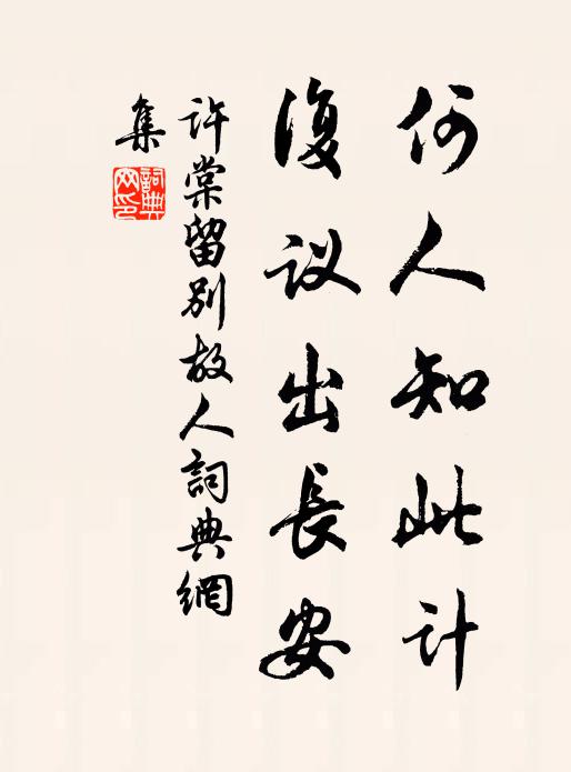 古詩文歷史字典書法欣賞書法字典國語詞典說文解字康熙字典古漢語字典何人知此計,複議出長安許棠 《留別故人》名句出處出自唐代許棠的《留別故人》全文:殊立本不偶,非唯今所難。無門閒共老,盡日泣相看。鳥畏聞鶗鴂,花慚背牡丹。何人知此計,複議出長安。許棠詩詞大全名句書法欣賞何人知此計,複議出長安書法作品許棠名句,留別故人名句名句推薦此中有佳興,不醉定自非黃庭堅《次韻寄李六弟濟南郡城橋亭之詩》誰雲碧海三山島,別是朱明一洞天鄭玠《丹灶》天以高名鍾是月,人於季孟得其間項安世《代作五首》夜氣與僧話,凜凜冰壺清陳造《宿雲岩山》用拂腥膻和九榖沈約《梁三朝雅樂歌 需雅 三》早禾玉粒自天瀉,村北村南喧地碓陸游《秋詞》薄宦偶然來左蜀,孤云何事在南燕劉兼《寄滑州文秀大師》草草杯盤還促席王之道《歸朝歡》公子醉未起,美人爭探春孟郊《長安早春》胡無人,漢道昌李白《胡無人》往年兵興錫齎多,官會頒行姑濟急劉學箕《夏雨嘆》此會是何人,其名野奎越魏野《夏夜與魏野陳越會宿河亭聯句三十韻》適來衰懶畏賓士,忽見飛蓬平地起戴表元《孫使君飛蓬亭》殊不知東山老人,慣得其便釋心月《頌古十六首》且喜東君有訊息,隔香應不怕疏籬華岳《春閨雜詠梅》詩詞推薦沁園春舒頔〔元代〕多少閒情,桃源問蹊,柯山看棋。把杏花春雨,從頭吟了,木犀秋月,開戶邀之。氣捲風雲,眼空江海,萬古從前覽鏡沈佺期〔唐代〕霏霏日搖蕙,騷騷風灑蓮。時芳固相奪,俗態豈恆堅。恍忽夜川里,蹉跎朝鏡前。紅顏與壯志,太息此流年。虎洞陸游〔宋代〕空山秋高木葉黃,茫茫百草凋秋霜。逶迤深谷白晝靜,群鴉競噪眾鳥翔。洞中有虎何猛烈,牙如利刀爪如鐵。奮髯儀賢堂馬之純〔宋代〕鶴髮龐眉四老人,鶉衣躡履一何貧。堂中論事君心喜,寺里譚經眾說新。蜀傑仉{黼甫換顓去頁}皆古字,甪黃園贈別崔五白居易〔唐代〕朝送南去客,暮迎北來賓。孰雲當大路,少遇心所親。勞者念息肩,熱者思濯身。何如愁獨日,忽見平生人。平生枯柏王洋〔宋代〕齋前兩柏樹,其大皆十圍。我初營屋時,正與兩柏期。其一傍北亭,其一近南籬。相去十步間,當夏無炎曦。我翁有感三首張耒〔宋代〕古今不殊途,掩卷獨長想。炎爐與死灰,相去如反掌。彼昏誠不知,一醉富莫量。那知道旁殍,曾是厭杯盎。一金烏夜啼 戒洗面丘處機〔元代〕嗚呼俗態,行樂恣胸襟。蓋論人情,華世度光陰。陰陽反覆,天地有浮沉。福謝殃來,悲痛怎生禁。統年才過,腸和尉遲贊善病中見寄徐鉉〔唐代〕仙郎移病暑天過,卻似冥鴻避罻羅。晝夢乍驚風動竹,夜吟時覺露沾莎。情親稍喜貧居近,性懶猶嫌上直多。望苑鷓鴣天(不寐)辛棄疾〔宋代〕老病那堪歲月侵。霎時光景值千金。一生不負溪山債,百藥難治書史淫。隨巧拙,任浮沈。人無同處面如心。不妨