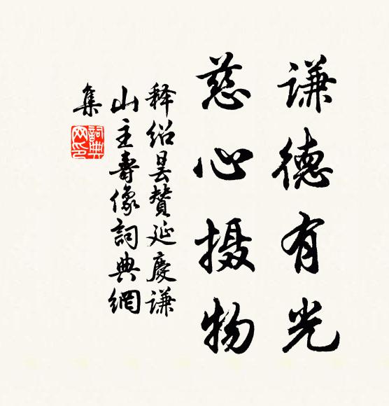 古詩文歷史字典書法欣賞書法字典國語詞典說文解字康熙字典古漢語字典謙德有光,慈心攝物釋紹曇 《贊延慶謙山主壽像》名句出處出自宋代釋紹曇的《贊延慶謙山主壽像》全文:謙德有光,慈心攝物。等冤親不與較量,混塵俗初無間隔。熙熙外氣融冰谷之春,汪汪乎胸吞雲夢之澤。樂羲皇世,含飴弄孫。下陳蕃榻,倒屐迎客。眼睛頭燁燁光明幢,腳跟下塵塵清泰國。卜隣陋巷,慕孔聖人獲麟作傳之風規。摵碎明珠,有郁山主騎驢過橋之標格。誠所謂入廛垂手,我自調心。繼百世凜然,見古道之顏色。名句書法欣賞謙德有光,慈心攝物書法作品釋紹曇名句,贊延慶謙山主壽像名句名句推薦朗月照簾幌,清夜有餘姿張漸《郎月行》其在今茲則還報王事,秣馬脂車與離長安之日鄭剛中《答江虞仲機宜歸語》自古東明陪出日,祗今南極是前星范成大《東宮壽詩》載重道遠兮,予欲行而誰與王令《我思古人答焦千之伯強》檐遮暖日桃夭瘦,鳥踏風枝竹影閒卷剛中《庚辛二月二十二日宿齋省中》漕河水入漢江流,逆浪吹鄰上比州項安世《楊侍郎》竹斑悲帝女,草綠怨王孫許渾《送友人歸荊楚》要當斗僧清,未足當韓豪蘇軾《讀孟郊詩二首》閱世紛如起滅漚,可須金羽較沈浮方回《次韻仁近客興二首》野人初向深崖得,蹋著雲根風雨黑四錫《琢玉歌》寒窗燈盡月斜暉,佩馬朝天獨掩扉許渾《臥病(時在京都)》誰雲好晚保用好,為我殷勤送一杯史鑄《晚菊》不論夾道壺漿滿,洛筍河魴次第來陸游《追憶征西幕中舊事》平外斜通駱,深中遠認褒崔覲《興元》杜子五兄弟,詞林俱上頭葉適《贈杜幼高》詩詞推薦題吳仲遠遊淮送行詩卷方回〔宋代〕昔有大丈夫,萬里事遠遊。遠遊何所極,飄若孤雲浮。歐冶淬利劍,造父翼華輈。東睇薄瀛島,西顧羞昆丘。長嘯贊虎丘先師釋曇華〔宋代〕老漢從來無禪,一味心中含毒。此毒時復現前,渾家大小不穆。異口同音呪詛,至今活陷地獄。一名臨濟正宗,一閏八月二十五日菊有黃花園中粲然奪目九日不蘇轍〔宋代〕年年九日憂無菊,今歲床空未有糟。世事何嘗似人意,天公端解惱吾曹。金龜解去瓶應滿,玉液傾殘氣尚豪。門外羨僧薛瑩〔唐代〕處世曾無著,生前事盡非。一瓶兼一衲,南北去如歸。春閨陳允平〔宋代〕終日懷人倚翠闌,別長愁寬釧金寬。顰眉鈿葉拋鴛甃,彈淚燈花落鳳盤。梅粉有香供夜雨,柳絲無力受春寒。階前郡齋書懷寄江南白尹,兼簡分司崔賓客劉禹錫〔唐代〕謾讀圖書三十車,年年為郡老天涯。一生不得文章力,百口空為飽暖家。綺季衣冠稱鬢面,吳公政事副詞華。還思夏雲王禹偁〔宋代〕嵯峨高鎖夕陽紅,斜入吟窗秀色濃。六里青山長滿眼,不勞雲片學奇峰。念奴嬌 憶仲良劉因〔元代〕中原形勢,壯東南、夢裡譙城秋色。萬水千山收拾就,一片空梁落月。煙雨松楸,風塵淚眼,滴盡青青血。平生不新夏歌李賀〔唐代〕曉木千籠真蠟彩,落蕊枯香數分在。陰枝拳芽卷縹茸,長風回氣扶蔥蘢。野家麥畦上新壟,長畛徘徊桑柘重。刺香奉和聖制送張說巡邊蘇晉〔唐代〕方漢比周年,興王合在宣。亟聞降虜拜,復睹出師篇。祈父萬邦式,英猷三略傳。算車申夏政,茇舍啟戎田。嚴問