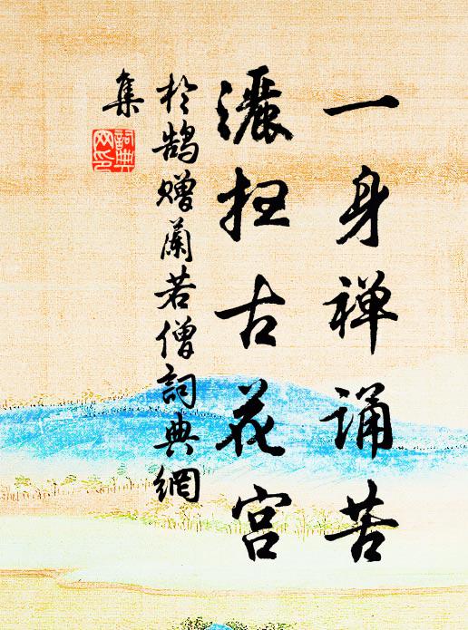古詩文歷史字典書法欣賞書法字典國語詞典說文解字康熙字典古漢語字典一身禪誦苦,灑掃古花宮於鵠 《贈蘭若僧》名句出處出自唐代於鵠的《贈蘭若僧》全文:一身禪誦苦,灑掃古花宮。靜室門常閉,深蘿月不通。懸燈喬木上,鳴磬亂幡中。附入高僧傳,長稱二遠公。於鵠詩詞大全名句書法欣賞一身禪誦苦,灑掃古花宮書法作品於鵠名句,贈蘭若僧名句名句推薦昨夜扁舟京口,今朝馬首長安蘇軾《西江月·送別》生世何用早,我已後此翁陳師道《觀兗文忠公家六一堂圖書》更衣換酒珠璣委方千里《還京樂》待得歸鞍到時,只怕春深姜夔《一萼紅》歲晚故山寒,地爐可煨芋陸游《讀何斯舉黃州秋居雜詠次其韻》君恩閔衰病,歸駕行將鞭蘇轍《送楊孟容朝奉西歸》金壇疏俗宇,玉洞侶仙群王勃《山居晚眺贈王道士》溪雲自為催詩黑,忙殺條桑窈窕娘高翥《山行即事二首》自是精神凌雪月,不妨風骨飽冰霜李曾伯《又和梅韻》不上黃花南北望,豈知春色滿神州令狐楚《漢苑行》憑君約史筆,書作西來目梅堯臣《送范景仁學士歸蜀焚黃》香街鼓絕暝煙深,簷近孤釭射宿禽楊億《冬夜》春卿拾材白日下,擲置黃金解龍馬李賀《送沈亞之歌並序》衰懷久灰槁,習氣尚饞貪蘇軾《立春日小集呈李端叔》擊之還有聲,分明含太古釋鹹潤《五泄山三學院十題石鼓》詩詞推薦病中聞伯量相訪寄之二首裘萬頃〔宋代〕高人在城郭,應酬頗紛如。憶我煙霞枉,遺我一紙書。雨余窗戶涼,蛩聲滿階除。相過有成言,何時命巾車。聞裴李二舍人拜綸閣白居易〔唐代〕鳳池後面新秋月,龍闕前頭薄暮山。 浣溪沙 次韻禮院孟子周僉院秋夜曲二疊虞集〔元代〕天闊秋高 * 長。浮塵消盡霧蒼茫。澄澄孤月轉危牆。金井有聲惟墜露,玉階無色乍疑霜。不聞人語只吟*。詠道中所見釋紹嵩〔宋代〕倚杖寒山暮,高杉韻細颸。歸舟藏別蒲,落日映荒陂。碧澗流紅葉,黃猿領白兒。石橋南畔路,岑渚復幽奇。跋蕭彥毓梅坡詩集楊萬里〔宋代〕西昌有客學南昌,衣缽真傳怏閣旁。坡底詩人梅底醉,花為句子蕊為章。想渠蹋月枝枝瘦,贈我盈編字字香。若畫買舟至九里松游三天竺喻良能〔宋代〕解維凌皺玉,輟棹理孤筇。游遍三天竺,行窮九里松。泉聲依石細,山色共秋濃。佳處吾能識,幽岩倚秀峰。周晦叔所宅之左一坡隱然而高有竹萬個架小軒史彌寧〔宋代〕竹根碧澗落寒聲,竹外雙溪抵鏡明。滿袖天風吟不徹,坡頭直有放多清。留題龍華僧院放懷閣魯君錫〔宋代〕公餘閒步山陰寺,小閣臨崖面竹開。我欲放懷□□□,故鄉訊息未曾來。游鍾山題八功德水庵壁陳序〔宋代〕十年塵土暗衣巾,亂走江鄉一病身。西第將軍成底事,北朝開府是何人。和顏長官百詠貧女朱繼芳〔宋代〕問天氣巧看銅儀,再拜雙星恨不隨。塵世未知天上事,隔河相望一年期。