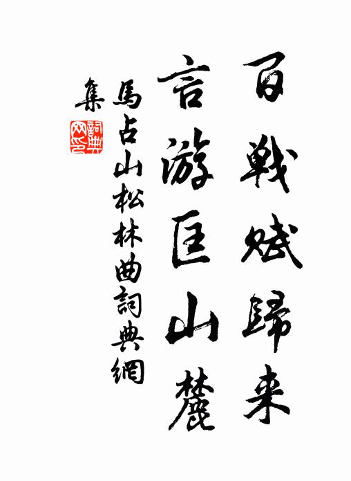 古詩文歷史字典書法欣賞書法字典國語詞典說文解字康熙字典古漢語字典百戰賦歸來,言游匡山麓馬占山 《松林曲》名句出處出自近現代馬占山的《松林曲》全文:百戰賦歸來,言游匡山麓。愛此 崎山,狀如於菟伏。摩挲舒長嘯,狂飆振林木。國難今方殷,國讎猶未復。禹跡遍荊榛,恐汝眠難熟。何當奮爪牙,萬里飛食肉。名句書法欣賞百戰賦歸來,言游匡山麓書法作品馬占山名句,松林曲名句名句推薦一勞堪定國,萬里即長城張說《奉和聖制送王晙巡邊應制》芒鞋也似雙鳧快,漁艇真如一葉浮陸游《行飯至湖桑堰東小市》不妨飲酒復垂釣,君但能來相往還王維《答張五弟》嘆逝頹波速,緘詞麗曲春武元衡《和楊三舍人晚秋與崔二舍人張秘監苗考功…因以繼和》天若有情容我訴王之道《蝶戀花》最苦三冬冰雪,難當萬里風塵丘處機《玉爐三澗雪 景金本注云,六首本名西江月》靜讀古人書,閒釣清渭濱白居易《詠拙》太白明如李,東方三丈高司馬光《早朝書事》東籬采采萬疊金,西疇更刈千頃秔劉學箕《與政仲端夫敬叟季仙至舊圃采采芙蓉金菊之妙》不知獨何急,下如有人推楊萬里《六月十六日夜南溪望月》秦國金陵王氣全,一龍正道始東遷崔塗《東晉》想登金閣望,東北極兵鋒齊己《送靈公上人游五台》世間何地非危機,曷不長守西山飢方岳《三禽言》寵榮連雨露,先後比蕭曹姚合《和鄭相演楊尚書蜀中唱和詩》村北村南布穀忙,村前村後稻花香。方向《詠儋耳二首》詩詞推薦送遲赴登封丞蘇轍〔宋代〕昔我過嵩陽,秋高日重九。晨邀同行客,共舉登高酒。藤鞋生胼胝,一覽河山富。封壇土消盡,中夜捫星斗。下山木犀白玉蟾〔宋代〕雨送炎官印,風宣白帝麻。欲知秋面目,細看木犀花。讀唐詩周南〔宋代〕一般生態幾人描,砑盡吳箋禿盡毫。卻是晚唐工狀物,手調煙露染天膏。謁詩僧慧益不遇李復〔宋代〕晝公昔在雲門寺,曾笑陳丘久不歸。草坐 * 今不見,獨來林下釣寒磯。頌古四首釋清旦〔宋代〕世尊拈花,迦葉微花。天際二輪,更相互照。若能截斷老瞿曇,閉目黃河只一跳。和開元余兄儒術誤身陳普〔宋代〕安得茅茨美化流,弦歌多著武城游。文章久矣經天地,孝悌非徒淑黨州。惟有命焉軻不謂,貧非病也憲何羞。曼相介亭餞楊傑次公蘇軾〔宋代〕籃輿西出登山門,嘉與我友尋仙村。丹青明滅風篁嶺,環佩空響桃花源。前朝欲上已蠟屐,黑雲白雨如傾盆。今晨登當塗凌歊台吳龍翰〔宋代〕高台突兀玉千尋,尚想當年翠輦臨。坐守夕陽移半塔,我吟未了讓蟬吟。晚秋北園二首宋祁〔宋代〕寂寥台榭使君家,日涉中園到日斜。林下歸心紛似葉,菊前衰鬢晚於花。支離粟飽寧無愧,漫漶書成未足夸。猶有鷓鴣天晏幾道〔宋代〕碧藕花開水殿涼。萬年枝外轉紅陽。昇平歌管隨天仗,祥瑞封章滿御床。金掌露,玉爐香。歲華方共聖恩長。皇州