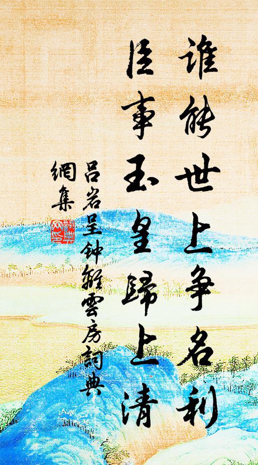 古詩文歷史字典書法欣賞書法字典國語詞典說文解字康熙字典古漢語字典誰能世上爭名利,臣事玉皇歸上清呂岩 《呈鍾離雲房》名句出處出自唐代呂岩的《呈鍾離雲房》全文:生在儒家遇太平,懸纓重滯布衣輕。誰能世上爭名利,臣事玉皇歸上清。呂岩詩詞大全名句書法欣賞誰能世上爭名利,臣事玉皇歸上清書法作品呂岩名句,呈鍾離雲房名句名句推薦聖主憂賢勤召對,諸公祖道羨登仙劉克莊《送鄧侍郎》貞松但如故,高標在煙雲章雲心《古意十四首》指窮火巳傳,豈待得薪炳晁補之《飲酒二十首同蘇翰林先生次韻追和陶淵明十三》白雲那忍閒歸岫,紫燕空慚漫累巢吳可《寄米元暉》響深澗,思啼猿權德輿《雜言賦得風送崔秀才歸白田限三五七七言》一年銜別怨,七夕始言歸杜審言《奉和七夕侍宴兩儀殿應制》殘鶯喜向內前囀,病鶴猶能月下鳴朱長文《次韻俞子文南軒雨後》洛下日初長,江南春欲半白居易《南池早春有懷》哀哉露筋女,萬古讎不復歐陽修《憎蚊》早晚東歸來下峽,穩乘船舫過瞿唐白居易《登西樓憶行簡》周宣方歌境土復,吉甫已賦明哲詩劉宰《傲將軍歌贈周叔子馬帥》不學劉琨舞,先歌漢祖風李隆基《巡省途次上黨舊宮賦》碧水連天無限思,欄桿無奈帶斜陽杜范《和陽字韻》傲物外、澄澄寥廓王吉昌《解愁》寒潮吞別浦,老木慘蒼煙陸游《秋冬之交雜賦》詩詞推薦簡艮齋曾豐〔宋代〕廣東漕臣重,本朝名士多。梁題年月古,壁記姓名訛。畫象初何補,濂溪自不磨。聞名猶起敬,況睹大冠峨。垂虹亭王安石〔宋代〕坐覺塵襟一夕空,人間似得羽翰通。暮天窈窈山銜日,爽氣駸駸客御風。草木韻沉高下外,星河影落有無中。飄然踏莎行韓絳〔宋代〕嵩嶠雲高,洛川波暖。舉頭喬木森無斷。□□□雨絕風塵,小橋頻過春渠滿。□□離宮,□棱斗煥。萬家羅綺多游紅荳蔻花范成大〔宋代〕綠葉焦心展,紅苞竹籜披。貫珠垂寶珞,剪彩倒鸞枝。且入花欄品,休論藥裹宜。南方草木床,為爾首題詩。送衛雄下第歸同州李端〔唐代〕不才先上第,詞客卻空還。邊地行人少,平蕪盡日閒。一蟬陂樹里,眾火隴雲間。羨汝歸茅屋,書窗見遠山。題竹張嵲〔宋代〕山磎犖确霧冥冥,瘦筍初從石罅生。開圖細想經過地,記得南山步晚晴。送詹彥迪秘校之越梅堯臣〔宋代〕夙懷山水心,夢寐向東越。聞為會稽行,獨此羨明發。渡江信春潮,泊館食野蕨。平時異梁鴻,但泛鏡湖月。粉蝶兒佚名〔宋代〕欲識還丹,認取自家宗祖。便不計、當初來處。是誰人,椿胎骨,誰人*塑捉住。這一靈性,元來是鉛結聚。既已六言吾首贈李相士景春劉克莊〔宋代〕少年勿議宿士,阿瞞自是相師。蒙叟馘黃項槁,桓郎眼小聲雌。酬令狐相公使宅別齋初栽桂樹見懷之作劉禹錫〔唐代〕清淮南岸家山樹,黑水東邊第一栽。影近畫梁迎曉日,香隨綠酒入金杯。根留本土依江潤,葉起寒棱映月開。早晚