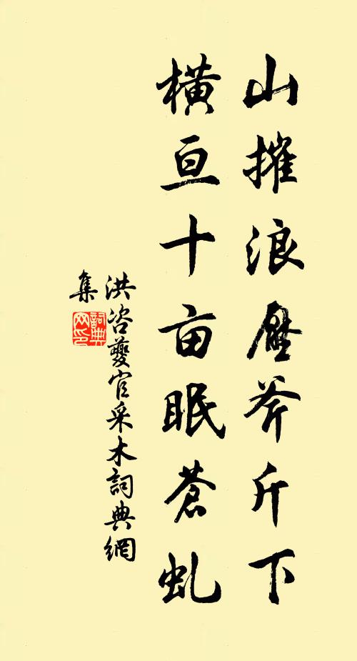 古詩文歷史字典書法欣賞書法字典國語詞典說文解字康熙字典古漢語字典山摧浪壓斧斤下,橫亘十畝眠蒼虬洪咨夔 《官采木》名句出處出自宋代洪咨夔的《官采木》全文:深山風雨幾百秋,直乾雲漢大蔽牛。輪囷離奇不尺度,一旦出應天家搜。山摧浪壓斧斤下,橫亘十畝眠蒼虬。白頭地主坐嘆息,物囿於數吾何尤。為言此殆有天幸,如拔莘渭歸商周。棟樑未央坐萬乘,柱石明堂朝諸侯。老翁聞語囅然起致祝,切莫去作昭陽梳洗樓。名句書法欣賞山摧浪壓斧斤下,橫亘十畝眠蒼虬書法作品洪咨夔名句,官采木名句名句推薦煮淡蔬勝肉,燃枯草帶硝方回《喜劉元煇再至用前韻二首》魚戲動新荷周邦彥《鶴沖天(溧水長壽鄉作)》傾身犯火宅,顧自以為戲陳與義《同叔易於觀我齋分韻得自字》息交屏妻子,此語不須驚晁補之《再次韻文潛病起》兒報床頭春瓮熟,人間萬事轉悠悠陸游《閉戶》獨坐長松是阿誰,再三招手起來遲王季友《觀於舍人壁畫山水》問途快閣得寬恩,舟轉風移日未昏呂祖儉《送汪時法歸金華》猶存火後書,罕識卷中字李謹思《寄進士熊退齋》今歲今宵盡,日日日從東畔出釋惟一《偈頌四首》暗香疏影名千古,冷艷孤光雪幾梢易士達《和梅花韻》花鳥無情,也訴離愁苦陳德武《蝶戀花》神嗜而顧,有來宴娛周麟之《景靈宮樂章尚書徹饌吉安之曲》名山長錶冠東南,一柱屹然天與參陸卿《游洞霄》月照宮城紅樹芳,綠窗燈影在雕梁張祜《阿鴇湯》賦稟但隨升斗祿,姓名常後百千人王洋《次苹字韻即事》詩詞推薦處暑後風雨仇遠〔宋代〕疾風驅急雨,殘暑掃除空。因識炎涼態,都來頃刻中。紙窗嫌有隙,紈扇笑無功。兒讀秋聲賦,令人憶醉翁。南歌子洪适〔宋代〕雲拂山腰過,風吹雨點來。田園好處有池台。記著相逢時節、海棠開。蝴蝶那無夢,鴛鴦亦有媒。藏鉤解佩兩三杯和鄭微之曾鞏〔宋代〕故人容下榻,清宴得傳杯。地秀偏宜竹,天寒未見梅。雲林千嶂出,煙艇一帆開。且醉休言別,歸期信召催。和劉後村梅花百詠方蒙仲〔宋代〕懷中黃敕墨猶新,曾尾群賢步玉津。惆悵看花成昨夢,大輸今歲賞梅人。舟過安仁五首楊萬里〔宋代〕南風作雨北風休,豈是春雲得自由。只者天時過湖得,長年報導不須愁。耐重釋梵琮〔宋代〕坐斷孤危未肯休,荷擔傑閣與層樓。柦翁活計丘山重,得力全歸頂{左寧右頁}頭。憶王孫王丹桂〔元代〕逍遙坦蕩絕憂愁。管甚流年春復秋。露地安眠放白牛。晚煙收。一曲頌古一百則釋正覺〔宋代〕夜壑藏舟,澄源著棹。龍魚未知水為命,折箸不妨聊一攪。玄沙師,小塘老,函蓋箭鋒,探竿影草。潛縮也老龜巢山行趙立〔宋代〕愛殺瀟湘境,山行知幾重。風清秋思重,雲淡曉陰濃。隔水時呼艇,經崖自策筇。岩扃聊問訊,把酒欠從容。暮過山村賈島〔唐代〕數里聞寒水,山家少四鄰。怪禽啼曠野,落日恐行人。初月未終夕,邊烽不過秦。蕭條桑柘外,煙火漸相親。