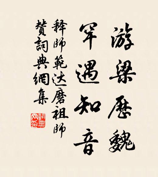 古詩文歷史字典書法欣賞書法字典國語詞典說文解字康熙字典古漢語字典游梁歷魏,罕遇知音釋師範 《達磨祖師贊》名句出處出自宋代釋師範的《達磨祖師贊》全文:大破六宗,單傳一心。游梁歷魏,罕遇知音。少室九年空面壁,誰向同霜夜月沉沉。釋師範詩詞大全名句書法欣賞游梁歷魏,罕遇知音書法作品釋師範名句,達磨祖師贊名句名句推薦錦瑟年華,夢中猶記艷游處張炎《台城路(遷居)》往時屢費曾郎酒,作意澆潑昭亭春吳則禮《曾公卷育陳子南昭亭詩因次韻》公今呼不應,浮議果何傷劉克莊《挽王簡卿侍郎三首》歲歲持杯,天地同難老韓淲《點絳唇(尋瑤草)》仁端驗發見,精微試控尋張栻《再用前韻》未教落素混冰池,且看輕黃綴雪枝晁補之《謝王立之送蠟梅五首》徒矜昔日工,乃忘後世拙宋祁《擬杜工部九成宮》月里暗香,水邊疏影,淡妝宜瘦,玉骨禁寒葛立方《風流子》轉換無休無歇,騰今古、更易形骸馬鈺《滿庭芳 骷髏樣》與君媾新歡曹丕《猛虎行》我行四方,稻麥黍稷蘇轍《和子瞻次韻陶淵明勸農詩》生後至和嘉佑時,老身猶及見淳熙劉克莊《立春七首》此處誰能聽,遙知獨有君張籍《和周贊善聞子規》決雲中斷開青天,噫!劍與我俱變化歸黃泉韓愈《利劍》縱使六陰塞戶,無欠亦無餘釋可湘《偈頌一百零九首》詩詞推薦次韻公權燈花朱長文〔唐代〕蘭膏未耗結花新,花自無情喜在人。生向輕籠先得地,開從細焰別裝春。飛蛾雖繞光難掩,夢蝶初回色尚勻。更待夜起有感方回〔宋代〕古人所願為,莫若言事官。前後五百輩,風節何索然。士所甚榮者,草詔登金鑾。繆妄或預選,文章何足傳。又如出郊李流謙〔宋代〕頗愛晚涼出,適當秋霽初。豐年田父語,喬木野人廬。畦稻根根直,池荷葉葉疎。冷官無事業,歸舍了殘書。皇后閣端午帖子夏竦〔宋代〕千門朱索迎嘉祉,九禁椒塗納美祥。虔奉黼帷承渥惠,慶隆禖石美祥新。子魚論戰左丘明〔先秦〕二十有二年春,公伐邾,取須句。夏,宋公、衛侯、許男、滕子伐鄭。秋,八月丁未,及邾人戰於升陘。冬,十有句孫升〔宋代〕梁台歌吹余衰草,湓浦琵琶悵晚風。淵禪人之乳峰釋智愚〔宋代〕淵默雷聲善發機,鈍根難下頂門椎。青霜黃葉壓窮野,急急歸來見隱之。孤鴻篇戴叔倫〔唐代〕江上雙飛鴻,飲啄行相隨。翔風一何厲,中道傷其雌。顧影明月下,哀鳴聲正悲。已無矰繳患,豈乏稻粱資。嗈嗈題蘆雁屏洪邁〔宋代〕征鴻坐何事,天遣南北飛。蕭然如旅人,無情自相依。孤葦吹欲折,秋風不勝威。冥冥一孤騫,空費弋者機。寒聲中秋無月,宿青弋江,曉行新寒楊萬里〔宋代〕新寒催我索衣裘,涼雨淒雲摠是愁。耐冷素娥今老去,夜來桂殿罷中秋。