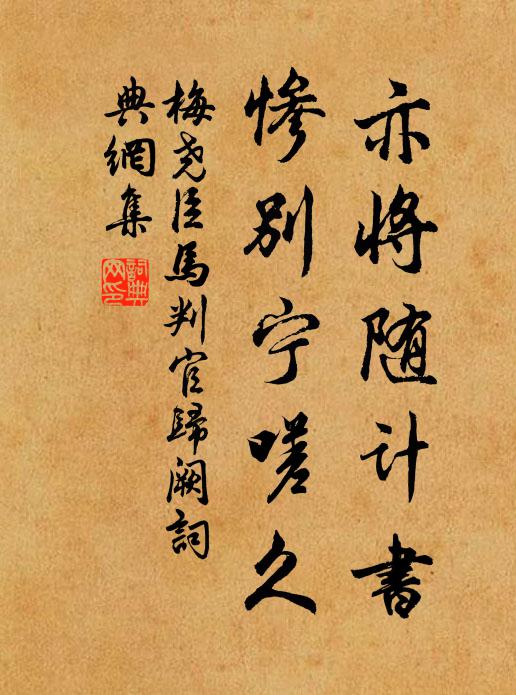 古詩文歷史字典書法欣賞書法字典國語詞典說文解字康熙字典古漢語字典亦將隨計書,慘別寧嗟久梅堯臣 《馬判官歸闕》名句出處出自宋代梅堯臣的《馬判官歸闕》全文:與君歸洛陽,仕宦頗相偶。荏苒遷歲時,徘徊樂文酒。今歸已及瓜,為贈聊折柳。亦將隨計書,慘別寧嗟久。名句書法欣賞亦將隨計書,慘別寧嗟久書法作品梅堯臣名句,馬判官歸闕名句名句推薦上而軋漢周,俯命騷以仆趙孟堅《為倉使吳荊溪先生壽》比看中郎醉庾信《奉和趙王詩》因循桑下成三宿,解後花時更一來陳造《題傅商卿家壁二首》犀斜宿草多,惆悵餘一紀陳藻《林若愚七十》扶持秀士蛟逢雨,糾察貪夫草遇霜楊公遠《三用韻奉酬》布字改銀鉤薛道衡《和許給事善心戲場轉韻詩》此身西復東,何計此相逢項斯《漢南遇友人》起來獨倚西樓角楊冠卿《憶秦娥》大溪逢侍郎,拆洗心胸清葉適《王簡卿侍郎以詩贈王孟同王成叟之侄也輒亦繼》上高坡細搜修練王哲《換骨骰》自從筮仕來,六命三登科白居易《答故人》逸興難拘縛,尋詩屐破苔趙友直《山中即景四首》猶憐兼國命,鸞誥濕金泥鄧剡《挽文魁母齊魏國夫人三首》十里驛亭楊柳樹元好問《漁家傲》此身陷入釅寒中,血脈歸心迓谷風唐寅《無題》詩詞推薦休暇東齋韋應物〔唐代〕由來束帶士,請謁無朝暮。公暇及私身,何能獨閒步。摘葉愛芳在,捫竹憐粉污。岸幘偃東齋,夏天清曉露。懷仙有恨晁說之〔宋代〕有恨將何遣,軒車盡俊髦。官非十女婿,政鄙小兒曹。歲暮客悰急,塗窮馬力勞。故山真可戀,築室更增高。同周湛二上人游西湖之北山天竺晚歸得十絕釋紹嵩〔宋代〕閒來湖上立移時,獨愧憑欄負碧漪。西寺木魚東寺鼓,而今總入老夫詩。和虞守釣台四首姜特立〔宋代〕龍袞羊裘孰重輕,當時俱是一書生。相忘道術仍忘勢,超出人間萬古情。偶書邵雍〔宋代〕賢德之人,所居之處。如芝如蘭,使人愛慕。兇惡之人,所居之處。如虎如狼,使人怕怖。和朋溪探梅韻易士達〔宋代〕錦囊分付與溪奴,江路尋幽屬野夫。暖信已傳春到未,暗香還動月明無。妝因底事偏清雅,態為何人轉瘠癯。惹起丁年王安石〔宋代〕丁年結客盛游從,宛洛氈車處處逢。吟盡物華愁筆老,醉消春色愛醅濃。壚間寂寞相如病,鍛處荒涼叔夜慵。早晚覽聶長孺蘄春罷歸舟中詩筆宋祁〔宋代〕姑山羽客冰為骨,金掌仙人露代餐。化作妙辭真扣玉,寫成初藁剩驚鸞。心隨零雨濛濛密,恨過清溪曲曲寒。此秘求黃家紫竹杖蘇轍〔宋代〕曾家紫竹君家種,曾園竹與荒藤共。藤驕竹瘁如畏人,不似君家竹森聳。我來買宅非為宅,愛此風梢時一弄。磨刀八月初一日方回〔宋代〕秋風幾日尚無詩,政坐炎歊轉赫曦。閒被貧為魔攬撓,病須涼當藥醫治。薄田董獲收新粟,老圃開包獻巨梨。顧此