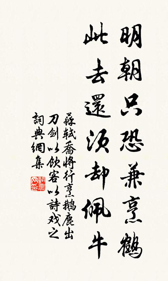 古詩文歷史字典書法欣賞國語詞典查字典說文解字康熙字典古漢語字典明朝只恐兼烹鶴,此去還須卻佩牛蘇軾 《喬將行烹鵝鹿出刀劍以飲客以詩戲之》名句出處出自宋代蘇軾的《喬將行烹鵝鹿出刀劍以飲客以詩戲之》全文:破匣哀鳴出素虬,倦看鶂鶂聽呦呦。明朝只恐兼烹鶴,此去還須卻佩牛。便可先呼報恩子,不妨仍帶醉鄉侯。他年萬騎歸應好,奈有移文在故丘。蘇軾詩詞大全名句書法欣賞明朝只恐兼烹鶴,此去還須卻佩牛書法作品參考注釋明朝 〈方〉∶明天烹鶴比喻殺風景的事。 宋 蘇軾 《喬將行烹鵝鹿出刀劍以飲客以詩戲之》:“明朝只恐兼烹鶴,此去還須卻佩牛。”參見“ 煮鶴燒琴 ”。蘇軾名句,喬將行烹鵝鹿出刀劍以飲客以詩戲之名句名句推薦一笑謂花神,差爾何顓蒙袁燮《鳳仙花》洞府修真客,衡陽念舊居李隆基《送道士薛季昌還山》皂隸忽鼎貴,王侯或橫死方回《李寅之招飲同登九江城》幾處別巢悲去燕,十年回首送歸鴻趙嘏《浙東贈李副使員外》何當共攜被,重此聽秋聲趙蕃《同成父弟訪王亢宗遇周欽止同過圓通看竹二首》怎生真得、歡娛效雲雨楊 * 《解蹀躞》我覯之子,袞衣繡裳佚名《九罭》眼看西湖不暫來,簿書無算撥還開蘇轍《次韻子瞻望湖樓上五絕》岳陽樓上三更後,自倚欄乾看月明蘇泂《登樓》攜劍到人間,偶相逢、依然青眼張孝祥《驀山溪》爾來三十載,感事一汍瀾范祖禹《寄題蒲氏清風閣》積翠迸一瀑,紅霞碧霧開貫休《別性空禪師》金膏徒騁妙,石髓莫矜良梁鍠《省試方士進恆春草》百年過半,玉堂人、久矣隔雲泥張可久《木蘭花慢 得會稽友人書》使君霤宇大,下庇千萬賢王洋《送章季萬戶部》詩詞推薦以詩句詠梅一枝風物便清和方蒙仲〔宋代〕儘是矜風日,誰能耐雪霜。難中見工巧,黑常勝青皇。詠史詩袁宏〔魏晉〕周昌梗槩臣。辭達不為訥。汲黯社稷器。棟樑表天骨。陸賈厭解紛。時與酒檮杌。婉轉將相門。一言和平勃。趨舍螢強至〔宋代〕幸藉炎蒸力,因遷腐草蹤。清宵能自照,暗室肯相容。雨巷幽光晦,風簾亂點重。臨書方汝賴,惟恐有鳴蛬。登樂遊園望白居易〔唐代〕獨上樂遊園,四望天日曛。東北何靄靄,宮闕入煙雲。愛此高處立,忽如遺垢氛。耳目暫清曠,懷抱郁不伸。下視高宗皇帝輓詞·其一洪芻〔宋代〕寶曆中興業,於今六十年。洗光暘穀日,鍊補女媧天。大業超東漢,皇恩暢北燕。聖謨誰可頌,會有筆如椽。句彭止〔宋代〕可憐蹤跡似流萍。送福州監郡陳殿丞張方平〔宋代〕七閩一都會,乃是無諸城。海近氣物異,山遙風候清。宦遊過鄉美,君祿及親榮。去去倚門念,溪船歸棹輕。選冠子佚名〔宋代〕庾嶺煙光,江南風景,冷落歲寒庭院。疏林萬木凍折,孤根獨犯,曉霜回暖。萼點胭脂,粉凝芳葉,依稀幾枝初綻觀身陸游〔宋代〕欲去浮華累,先觀老病身。濁醪何負汝,淡飯最宜人。意氣隨年往,工夫媿日新。只將閒送老,虛作太平民。感懷陸游〔宋代〕平生喜裁花,賴以娛寂寞。小園財一畝,粲粲萬跗萼。典衣買紫桂,輟食致紅藥。阡眠香草茂,掩苒煙柳弱。踏雨