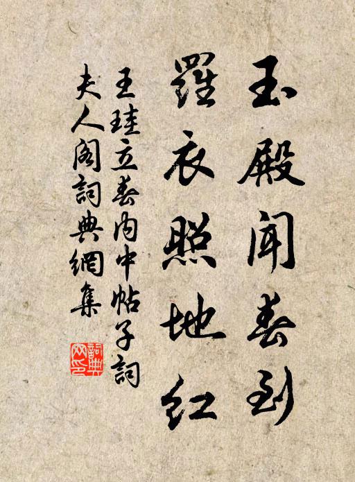 古詩文歷史字典書法欣賞書法字典國語詞典說文解字康熙字典古漢語字典玉殿聞春到,羅衣照地紅王珪 《立春內中帖子詞夫人閣》名句出處出自唐代王珪的《立春內中帖子詞夫人閣》全文:玉殿聞春到,羅衣照地紅。君恩深漢帝,不惜舞東風。王珪詩詞大全名句書法欣賞玉殿聞春到,羅衣照地紅書法作品王珪名句,立春內中帖子詞夫人閣名句名句推薦眉宇有餘妍賀鑄《南鄉子》錦字無憑南雁杳,美人家在長幹道邵瑞彭《蝶戀花·十二樓前生碧草》從今穩入林深處,塗炭何緣行污冠陳著《次韻弟觀授學陳子得家》久不反兮水維緩劉徹《瓠子歌》三方鯨浪涌,一島虎頭孤陳造《定海四首》何時一杯酒,重與季鷹傾孟浩然《永嘉別張子容》天青青,泉泠泠盧仝《思君吟寄□□生》秋深撥草天台路,靈骨要尋親父母釋紹曇《觀知客歸葬親求語》漁翁亦被機心誤,眼暗汀邊結釣鉤司空圖《攜仙籙九首》襄陽有佳山,名著無如峴裴煜《峴山》筍輿沖雪過溪橋,流水方東未晚潮樓鑰《環村踏雪》東風送兄來,下馬逼三鼓曾幾《喜天游二十一兄至毫社時同叔夏十六兄作》斷碑仆地蒼蘚沒,滿庭落葉秋風起蔡如松《九侯山神詩》可人無俗韻,之子故清門孫應時《答陳子序庠見貽》舜沒蒼梧野,鳳歸丹穴岑元稹《桐花》詩詞推薦登二妃廟吳均〔南北朝〕朝雲亂人目,帝女湘川宿。折菡巫山下,采荇洞庭腹。故以輕薄好,千里命艫舳。何事非相思,江上葳蕤竹。頌古八首釋師一〔宋代〕岩頭婆子鐵肝心,擊碎乾坤覓賞音。眨上眉毛如下薦,岳陽惡浪轉增深。秋曉登山方岳〔宋代〕發興在丘林,其如老見尋。身余持蟹後,腳負看山心。秋色蒼崖暝,曉籬黃葉深。惟應負苓者,來往古松陰。真定懷古陳孚〔元代〕千里桑麻綠蔭城,萬家燈火管弦清。恆山北走見雲氣,滹水西來聞雁聲。主父故宮秋草合,尉陀荒冢莫煙平。開元定風波·重陽蘇軾〔宋代〕與客攜壺上翠微,江涵秋影雁初飛,塵世難逢開口笑,年少,菊花須插滿頭歸。酩酊但酬佳節了,雲嶠,登臨不用請緣老住持象耳山有詩次韻晁公溯〔宋代〕朦朧兩眼著玄花,認取空中起滅華。我是官曹老龐蘊,終無瞎棒與盲枷。哭匊田詩老舒岳祥〔宋代〕尋源自永嘉,清響黜浮葩。一字不犯古,五言真到家。思幽多掩抑,情至重咨嗟。欲擬徵君誄,天寒日又斜。黃亭夜雨陸游〔宋代〕未到名山夢已新,千峰拔地玉嶙峋。黃亭一夜風吹雨,似為遊人洗俗塵。武陵春日王建〔唐代〕尋春何事卻悲涼,春到他鄉憶故鄉。秦女洞桃欹澗碧,楚王堤柳舞煙黃。波濤入夢家山遠,名利關身客路長。不似句釋惠崇〔宋代〕掩門青檜老,山寺白髭長。