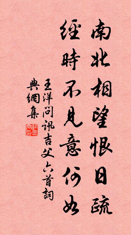 古詩文歷史字典書法欣賞書法字典國語詞典說文解字康熙字典古漢語字典南北相望恨日疏,經時不見意何如王洋 《問訊吉父六首》名句出處出自宋代王洋的《問訊吉父六首》全文:南北相望恨日疏,經時不見意何如。喜聞高閣扶衰杖,竹院秋光漸破除。名句書法欣賞南北相望恨日疏,經時不見意何如書法作品王洋名句,問訊吉父六首名句名句推薦閉目常閒坐,低頭每靜思白居易《不與老為期》老僧一何賢,為我拂清簟韓維《游福聖院呈審言諸君》試評能自照,孰愈莫勝衣趙蕃《晨起行菜》次子病學醫,三折乃粗曉蘇軾《將至廣州用過韻寄邁迨二子》雲收麥壟,水足秋田釋紹曇《偈頌一百零四首》不才甘作耕岩叟,有志宜為結駟翁朱長文《次韻俞子文感事》念足又願足佚名《歸田樂》中夜起長嘆,慷慨商聲謳蘇軾《送宋君用游輦下》東風須惹春雲住吳文英《絳都春·余往來清華池館六年賦詠屢矣感昔傷今益不堪懷》數聲鍾里飯,雙影樹間茶喻鳧《夏日龍翔寺居即事寄崔侍御》官大寵深難得暇,林泉懷舊是偷閒丁謂《虎丘》名士江西少,廣文胸次高曾豐《隆興貢院呈彭國壽》象筆鸞箋閒卻張輯《花自落(寓謁金門)》雖抗塵土容,耿耿水壺在陳棣《棲軒偶成呈同僚》乍冷乍陰將禁火,自開自掩不關扉梅堯臣《和劉原甫復雨寄永叔》詩詞推薦寄程可久丈趙蕃〔宋代〕聞道書少隨老,書遂為安國書居。逢人書難問似,近況復何如。此士猶松徑,何人在石渠。儒林有韓孟,待詔自嚴答陳公美四首蘇洵〔宋代〕公孫昔放逐,牧羊滄海濱。勉強聽鄉里,垂老西遊秦。自顧未為壯,徒為久辛勤。君子豈必隱,孔孟皆旅人。化州化州郡守〔宋代〕羅川帶郭古南州,陵水環城小庾樓。雲淡青林無過雁,雨涵丹荔集鳴鳩。叨榮銅竹三經夏,勸課農桑屢有秋。好趁題院詩侯道華〔唐代〕帖里大還丹,多年色不移。前宵盜吃卻,今日碧空飛。慚愧深珍重,珍重鄧天師。他年煉得藥,留著與內芝。吾師渡淮作吳融〔唐代〕紅杏花時辭漢苑,黃梅雨里上淮船。雨迎花送長如此,辜負東風十四年。府舍月游韋應物〔唐代〕官舍耿深夜,佳月喜同游。橫河俱半落,泛露忽驚秋。散彩疏群樹,分規澄素流。心期與浩景,蒼蒼殊未收。樞相游吳園再用前韻李流謙〔宋代〕等閒驅雪作晴天,夾道從公立萬弮。白甚自矜梅淡竚,青加稍覺麥芊綿。不知今夕真何夕,共說明年是好年。舐鼎李兩山侍郎仲氏儒而醫解後會稽索詩識別林景熙〔宋代〕我懷兩山翁,夙抱經濟略。曾驅部使車,所至問民瘼。昆陽斗大州,漁吏久竭澤。三尺行風霆,四知厲冰櫱。公餘和顏長官百詠農桑朱繼芳〔宋代〕帶得雞豚趁曉虛,荒村牢落數家居。一家幸是田園主,留與兒孫寫契書。送馮溫往河外薛能〔唐代〕琴劍事行裝,河關出北方。秦音盡河內,魏畫自黎陽。野日村苗熟,秋霜館葉黃。風沙問船處,應得立清漳。