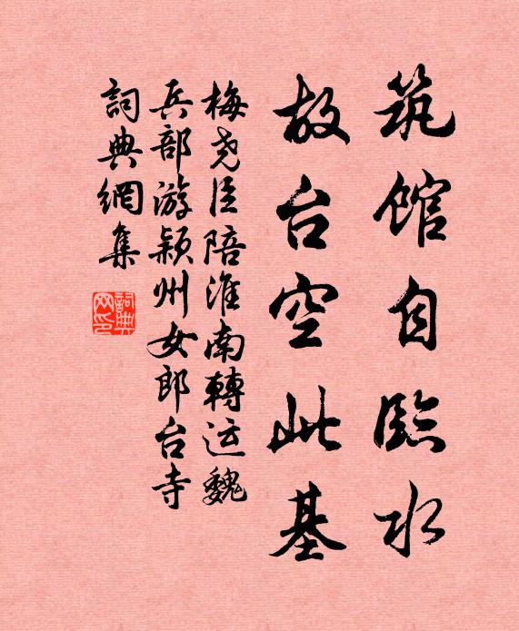 古詩文歷史字典書法欣賞書法字典國語詞典說文解字康熙字典古漢語字典築館自臨水,故台空此基梅堯臣 《陪淮南轉運魏兵部游穎州女郎台寺》名句出處出自宋代梅堯臣的《陪淮南轉運魏兵部游穎州女郎台寺》全文:舊傳媯氏女,將適楚人時。築館自臨水,故台空此基。因為楚宮媵,來與使車期。樓上望湖上,煙林晚蔽虧。名句書法欣賞築館自臨水,故台空此基書法作品梅堯臣名句,陪淮南轉運魏兵部游穎州女郎台寺名句名句推薦遍尋幽勝了,湘水泛清澄齊己《送人游武陵湘中》高談付梁羅,蘇軾《端午游真如遲適遠從子由在酒局》邊兵索衣食,此物同泥土姚合《莊居野行》欲把阿元輕輩行,古今俗子喜相誣陳造《再次韻四首》霸業淒涼一炬休,鑄金為像亦狂謀方信孺《劉氏銅像》河水之濁有日清,世亂當復見太平吳芾《九日感懷》鳥烏噪猿啼談不二,松風澗水真玄泄雲陽子《滿江紅 嗚鶴餘音卷一》凌波仙子香魂散,此地是誰招此許有壬《玉燭新 題李伯瞻一香圖次韻》欲為全德古君子,莫棄忠規甘謅曲袁燮《他山之石》共夸君賜,初拆臣封蘇軾《行香子(茶詞)》笑賭乾坤看兩龍,淮陰目動即雌雄楊萬里《讀子房傳》西風吹葉滿庭寒,蘗子無言鼻自酸唐寅《秋風懷歸圖》筆端可挽千鈞弩,胸次如登百尺樓方回《次韻謝周兄見訪》極寒春透紗窗碧梅窗《菩薩蠻(春閨)》因病不舉酒,況當朱明天曾幾《盛夏東軒偶成五首》詩詞推薦懷素上人草書歌竇冀〔唐代〕狂僧揮翰狂且逸,獨任天機摧格律。龍虎慚因點畫生,雷霆卻避鋒芒疾。魚箋絹素豈不貴,只嫌侷促兒童戲。粉壁喜雨四首四張耒〔宋代〕隙地秋日曉,寂無鄰里音。惟有草根蟲,風前咽復吟。悲歌者誰子,徂年驚苦心。青燈夜齋靜,微溫生薄衾。送李君上洞天鄧肅〔宋代〕北風於喁萬竅號,落雪紛紛燖鵠毛。好向高堂護帷幕,新醪入臉殷春桃。居士何為囂不顧,叩戶長歌辭我去。行行次韻任道雪中同游東皋之作黃庭堅〔宋代〕四海方嗷嗷,我奔走獨勞。停舟近北渚,扶杖步東皋。霜落瘦石骨,水漲腐溪毛。更有山陰興,能無秦復陶。端硯銘鄭魁〔宋代〕仙翁種玉芝,耕得紫玻璃。磨出海鯨血,聲成天馬蹄。潤應通月窟,洗合就雲溪。常恐魍魎奪,山行亦自摧。春晚書懷陸游〔宋代〕老客天涯心尚孩,惜春直欲挽春回。長繩縱系斜陽住,右手難移故國來。暑近蚊雷先隱轔,雨前螘垤正崔嵬。茹芝玉麟堂會諸司觀牡丹酴醾三絕范成大〔宋代〕洛園姚魏碧雲愁,風物江東亦上游。憶起遨頭八年夢,彭州花檻滿西樓。書石牛溪旁大石上黃庭堅〔宋代〕鬱郁窈窈天官宅,諸峰排霄帝不隔。六時謁天開關鑰,我身金華牧羊客。羊眠野草我世閒,高真眾靈思我還。石盆偈公六十五首釋鹹傑〔宋代〕有句無句,發藤倚樹。石裂崖崩,毒蛇當路。樹倒藤枯,悉哩蘇嚧。次韻杜安行嘉陵春日書事十首郭印〔宋代〕公退幽齋坐,悠然對碧岑。吹香花拂拂,圍翠竹森森。蝶散紅芳歇,鶯藏綠樹深。吾心清似水,塵境勿相侵。
