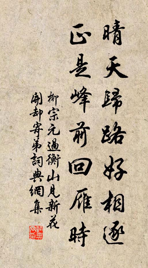古詩文歷史字典書法欣賞書法字典國語詞典說文解字康熙字典古漢語字典晴天歸路好相逐,正是峰前回雁時柳宗元 《過衡山見新花開卻寄弟》名句出處出自唐代柳宗元的《過衡山見新花開卻寄弟》全文:故國名園久別離,今朝楚樹發南枝。晴天歸路好相逐,正是峰前回雁時。柳宗元詩詞大全名句書法欣賞晴天歸路好相逐,正是峰前回雁時書法作品柳宗元名句,過衡山見新花開卻寄弟名句名句推薦白雲留永日,黃葉減餘年劉長卿《初到碧澗招明契上人》天遣人間作仇敵,只緣黑白太分明黃公度《和宋永兄圍棋青字韻因成五絕》閒伴白雲收桂子,每尋流水劚桐孫翁洮《和方乾題李頻莊》青史世家它日事,新阡宿草倍沾巾蘇轍《王仲儀尚書輓詞》毛竹千叢蔽野亭,曉猨驚後亂峰青劉筠《懷舊居》風流貴公子,火急效原嘗胡寅《用明有攜酒賞梅之約久而未至復和以督之》杖藜芒履謝塵境,已甘老去棲林泉王詵《子瞻再和前篇非惟格韻高絕而語意鄧重相與甚》春風無先後,爛漫爭紅白歐陽修《留題鎮陽潭園》新兼帶插嚴天仗,夙展韜鈐衛帝營曹勛《和陳御帶見貽》清賞有今日,題壁記來初王旭《水調歌頭 和張都運李氏柳塘賞荷韻》山園寧厭小,閒地只如馨喻良能《陳彥山寄示新詩次韻奉酬》彼雖速亡我,我故自存存曾豐《陸川尉吳子實死於李接之難》細讀石屏記,多君才思清戴復古《斗山子王深父作石屏記為老夫書其文甚佳采記》絲金縷玉幡兒趙師俠《柳梢青(祭戶立春)》且當除諷渴,未暇怯樵痁晁補之《和關彥遠雪》詩詞推薦次韻徐庭珍春日雜言十首陳棣〔宋代〕燕雀經營競短檐,未容蝶夢到花前。吾生幾閱春榮謝,自嘆如蠶已再眠。送宮人入道韋應物〔唐代〕舍寵求仙畏色衰,辭天素麵立天墀。金丹擬駐千年貌,寶鏡休勻八字眉。公主與收珠翠後,君王看戴角冠時。從來句諶祜〔宋代〕夢猶平昔醒來別,憶到兒童事轉長。偶成雜意四首衛博〔宋代〕長松栽萬年,必在千仞巔。卑哉蓬蒿間,斥鷃無高鶱。如何一杯水,活此橫海鱣。誰能激滄溟,為子摶青天。浣溪沙 早行李齊賢〔元代〕旅枕生寒夜慘淒。半庭明月露淒迷。疲僮夢語馬頻嘶。人世幾時能少壯,宦遊何處計東西。起來聊欲舞荒雞。憶王孫 詠柳善住〔元代〕一株閒伴霜陵橋。斜倚東風學舞腰。遊子尋春駿馬驕。欲魂銷。和雨春雪施樞〔宋代〕臘里霏微未許多,春來舞片卻交叉。混成天地皆同色,點染園林盡著花。岸跡雲凝迷去鷺,屋頭煙暖見飢鴉。東風頌古四十五首釋如珙〔宋代〕只將乍入來伸請,一到叢林志便高。吃粥了也洗缽去,宗師不用更忉忉。郴江百詠並序山陰堂阮閱〔宋代〕修竹蒼蒼似剡川,浮觴可繼永和年。不知誰有羲之筆,欲寫蘭亭第二篇。次韻陳詩郎謝送牡丹方岳〔宋代〕手劚蒼苔玉一欄,山家初見眼猶寒。移根莫厭凡紅紫,只做春風一樣看。