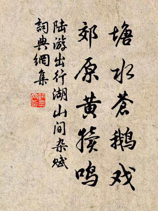 古詩文歷史字典書法欣賞書法字典國語詞典說文解字康熙字典古漢語字典塘水蒼鵝戲,郊原黃犢鳴陸游 《出行湖山間雜賦》名句出處出自宋代陸游的《出行湖山間雜賦》全文:老入新年健,春逢小雨晴。偶因尋酒去,又作繞村行。塘水蒼鵝戲,郊原黃犢鳴。閒身有樂事,倚杖看農耕。陸游詩詞大全名句書法欣賞塘水蒼鵝戲,郊原黃犢鳴書法作品陸游名句,出行湖山間雜賦名句名句推薦如何一夜音容隔,便有紛紛說夢魂趙文《傷逝三首》白髮可憐老,青雲多故人戴復古《代書寄韓履善右司趙庶可寺簿》先生學道尤溫恭,皎然明月來窗櫳蔡戡《題端約喜神詩》錯向五陵陵上望,幾回月、幾回秋劉辰翁《唐多令》緹屏晝戰聲華接,還羨糾曹名盛吳存《摸魚兒 送周君崇錄判》竹樹一堤如有礙,乾坤萬象自無窮葉隆禮《煙雨樓》田園頃失計,資用深相迫劉長卿《送元八游汝南》我已困摧辱,壯心如濕灰賀鑄《寄杜仲觀》尋花迷白雪,看柳拆青絲獨孤良弼《上巳接清明游宴》先君暗裡應傾倒,方信流長源更深虞儔《遊宦十年於外歸自浙東睹西山先塋周圍林木氣》徒悲千載魂李白《古風其四十三》窮穴何山出,遮蠻上國寧李洞《終南山二十韻》古來建大廈,所貴楹桷崇項安世《隆中次吳襄陽韻二首》作祥只解誰飢腹,催老偏工欺短髭楊萬里《次東坡先生用六一先生雪詩律令龜字二十韻舊》百年都合付薰酣元好問《臨江仙 孟津河山亭同欽叔賦,因寄希顏兄》詩詞推薦春日王禹偁〔宋代〕門冷官閒似死灰,人言今日是春來。猶殘舊錫銀幡勝,且向山州當酒杯。夜坐陸游〔宋代〕山城意象自蕭然,況是高齋作雪天。漸暗玉蟲寒有燼,欲殘金鴨暖無煙。衰容病後如添歲,遙夜冬來抵過年。安得西江月·堂上謀臣尊俎劉過〔宋代〕堂上謀臣尊俎,邊頭將士干戈。天時地利與人和。燕可伐歟曰可。今日樓台鼎鼐,明年帶礪山河。大家齊唱大風歌送郡守張宗丞蕭元之〔宋代〕淚落鄉邦事,民痍久未瘳。官收隨畝券,人上運糧舟。寇起征方急,年飢糴未休。更聞來取楮,何以應需求。沁園春(庚子登鳳凰台,和壁間韻)李曾伯〔宋代〕漫浪江頭,三聽秋砧,一登故台。望煙蕪莽蒼,令人目斷,風檣掀舞,何日眉開。把酒新亭,圍棋別墅,老氣當時酹江月侯善淵〔元代〕一天清翠,混陽和微密,寂寥無物。致靜頤心開上竅,通化靈明虛谷。育養元神,真人出現,放曠無拘束。皇天道挽鹽官縣丞何公喻良能〔宋代〕先子生辛未,齊年見此翁。從容六紀內,隱約古人風。教子從書積,延賓畏酒空。階前桃杏色,依舊入簾紅。春日利登〔宋代〕雨過苔猶濕,風來戶半開。閒花忽落盡,啼鳥自飛來。滿庭芳 己卯七月十一日得穎吳景奎〔元代〕露洗新秋,天浮灝氣,桐孫初長庭隅。繃裁紅錦,門左記垂弧。白髮萱親笑道,於今見、四葉喜榮敷。天台路,吾短歌行曹丕〔魏晉〕仰瞻帷幕,俯察几筵。其物如故,其人不存。神靈倏忽,棄我遐遷。靡瞻靡恃,泣涕連連。呦呦游鹿,草草鳴麑。