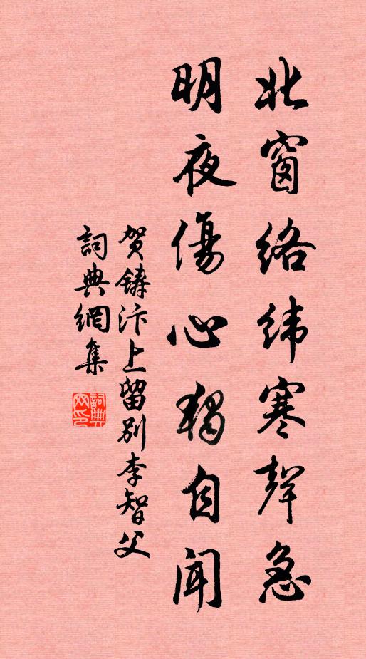 古詩文歷史字典書法欣賞書法字典國語詞典說文解字康熙字典古漢語字典北窗絡緯寒聲急,明夜傷心獨自聞賀鑄 《汴上留別李智父》名句出處出自宋代賀鑄的《汴上留別李智父》全文:一馬西投汴水濱,自驚秋鬢帶塵紛。秋風盡日吹黃葉,心事經年寄白雲。去矣尺書勤訪我,醉來樽酒強酬君。北窗絡緯寒聲急,明夜傷心獨自聞。名句書法欣賞北窗絡緯寒聲急,明夜傷心獨自聞書法作品賀鑄名句,汴上留別李智父名句名句推薦中都價重無錢買,京兆書遲怪路迂周邦彥《天啟惠酥》晚志重長生鮑照《代升天行》行將親愛別,戀此西澗曲韋應物《始除尚書郎,別善福精舍》加之炭上猶晏然,相顧未知亡族禍司馬光《和王介甫烘虱》聽雞行曉月,嘆雉過春山魏野《送蕭咨下第西歸》舊別情何限,重逢意豁然張栻《和定叟送行韻》高帝開江左,如天有太陽劉克莊《畫笥有二粉頭各題一絕》去歲登美第,策名在公車陸長源《酬孟十二新居見寄》勝友二三成草草,只憐有酒無茱吳澄《臨江仙 九日,舟泊安慶城下,晚歇臨江水驛》一自青山冥漠後,何人來道柳花香任希夷《白下亭》能消屐幾鞆,盍早謀究竟張鎡《衰疾幾半月梅已空杏花亦爛漫矣忽往一觀成古》直令韓彭處,奚所施善謀梅堯臣《依韻和丁元珍寄張聖民及序》歸雁不將書北去,行雲長伴日西沉賀鑄《春懷有寄代同行作》乘我廟堂運,坐使干戈戢劉希夷《將軍行》再同飲、花前酒,莫都忘、今夜夜深張炎《戀繡衾》詩詞推薦樂壽閣林季仲〔宋代〕看山玩水適吾情,此語從來誤後生。喚起萬端因好樂,靜觀一理本圓成。與人不競春長在,對物無心境自清。更就城南春會蔡襄〔宋代〕陰雲薄薄地無塵,清曉城南集畫輪。睢苑即時裁雪霰,潁川連夜聚星辰。山眉帖漢晴光擬,鶯舌尋風碎語真。芳草關山五首孔武仲〔宋代〕北地樵蘇寸草空,不如燒炭此山中。良材合抱隨斤斧,豈顧區區櫟與楓。任仲微閱世亭張耒〔宋代〕志士抱奇策,常苦不得伸。及其利害出,倏已亡其人。今古同此恨,愚智竟誰分。哀哉老任公,英魄久已淪。惟余碧牡丹(焦成馬上口占)晁補之〔宋代〕漸老閒情減。春山事、撩心眼。似血桃花,似雪梨花相間。望極雅川,陽焰迷歸雁。征鞍方長坂。正魂亂。舊事如官廨涼夕醉成董嗣杲〔宋代〕湓江城裡九江驛,今作分司主人宅。我脫富池榷茶責,借住寬閒忘主客。移栽廬山竹半百,障得西廂斜日赤。西風金陵雜興二百首蘇泂〔宋代〕旋結穹廬作露亭,疏枝闌入更輕盈。今年客思撩人甚,欲共梅花笑不成。次韻答叔原會寂照房呈稚川黃庭堅〔宋代〕客愁非一種,歷亂如蜜房。食甘念慈母,衣綻懷孟光。我家猶北門,王子渺湖湘。寄書無雁來,衰草漫寒塘。故人邊庭送別張蠙〔唐代〕一生雖達理,遠別亦相悲。白髮無修處,青松有老時。暮煙傳戍起,寒日隔沙垂。若是長安去,何難定後期。四月望再游西湖十首陳造〔宋代〕杖挑初日闖雲關,忽報充師早下山。煮茗譚詩有賢子,免教題鳳悵空還。