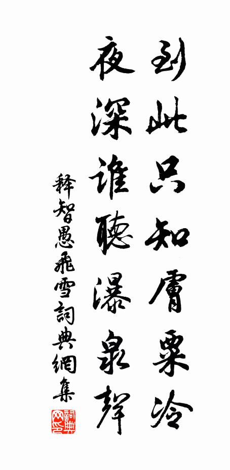 古詩文歷史字典書法欣賞書法字典國語詞典說文解字康熙字典古漢語字典到此只知膚粟冷,夜深誰聽瀑泉聲釋智愚 《飛雪》名句出處出自宋代釋智愚的《飛雪》全文:黑風袞袞六花輕,天列陰岩勢欲傾。到此只知膚粟冷,夜深誰聽瀑泉聲。釋智愚詩詞大全名句書法欣賞到此只知膚粟冷,夜深誰聽瀑泉聲書法作品釋智愚名句,飛雪名句名句推薦靈茅歲久香猶發,丹井功成水自閒張鎡《題臨川道中玉虛觀》他年結詩社,未嫌後從公陳造《贈楊伯時》邦國系污隆,匪獨承家要陳三立《袁伯夔母唐太夫人八十壽詩》祖奠兼排遮道帳,影祠別寫憩棠碑戴栩《挽林知縣朝奉詞》遺蹟猶存賀公宅,豐碑新敞越王祠魏了翁《八月七日被命上會稽沿途所歷拙於省記為韻語》路繞南登岸,情搖北上旗張九齡《道逢北使題贈京邑親知》側身度岩隈,盤盤復回回劉子翬《夢仙謠》紛敷碧樹陰,眄睞心所親柳宗元《種白蘘荷》冥冥青山道,叢木含古煙文同《青山道》湖州太守諸儒長,可獨進賢無上賞晁補之《用寄成季韻呈魯直》想殺南台御史,笑殺南州孺子,何事此淹留黎廷瑞《水調歌頭(寄奧屯竹庵察副留金陵約游揚州不果)》孤帆夜別瀟湘雨,廣陌春期鄠杜花許渾《別劉秀才(一作留別裴秀才)》況乃胡未滅,控帶莽悠悠杜甫《送韋十六評事充同谷郡防禦判官》浮屠老子流,營營盈市廛歐陽修《偶書》虛室對搖落,晤言無與群權德輿《感寓》詩詞推薦季秋侍宴中闕與諸公憩學士院作宋庠〔宋代〕冠劍中休會禁扃,暫欹孤枕拂雲屏。漢臣責重非真醉,楚客秋高恨獨醒。寶墨喜窺前賜榜,華絛猶記舊呼鈴。詔催次韻酬率翁方岳〔宋代〕戍樓夢不到中州,杜牧新愁亦倦遊。留得荷鋤雙手在,山寒芋栗要人收。喜花開虞儔〔宋代〕落木驚秋晚,黃共徹夜開。便教雙蝶舞,寧是萬牛回。有酒須頻舉,將詩莫浪催。淵明千古意,為汝轉徘徊。念奴嬌田為〔宋代〕嫩冰未白,被霜風換卻,滿院秋色。小閣深沈圍坐促,初擁紅爐宜窄。簾密收香,窗明遲夜,硯冷凝新滴。無人知古風其二十一李白〔唐代〕郢客吟白雪。遺響飛青天。徒勞歌此曲。舉世誰為傳。試為巴人唱。和者乃數千。吞聲何足道。嘆息空悽然。重圍中逢蕭校書韋莊〔唐代〕相逢俱此地,此地是何鄉?側目不成語,撫心空自傷。劍高無鳥度,樹暗有兵藏。底事征西將,年年戍洛陽。奉和吏部崔尚書雨後大明朝堂望南山張九齡〔唐代〕迢遞終南頂,朝朝閶闔前。朅來青綺外,高在翠微先。雙鳳蹇為闕,群龍儼若仙。還知到玄圃,更是謁甘泉。夜雨別趙運使二首彭龜年〔宋代〕君子豈無欲,有欲未足憂。百計護此短,此心尚可求。向來畏人言,言者不肯休。不畏固未可,無言我誰尤。事當祝君適中所所居南山岩花二種日玉梅日含笑者趙蕃〔宋代〕柯莖全與臘梅同,色潔香幽梅亦通。以玉謚之真不僭,何須漢賦楚騷中。晚望江南郭印〔宋代〕野豁長江外,人家各自村。水光秋蘸樹,雲色晚封門。引眺頻搔首,行吟只斷魂。可憐新月上,煙靄又昏昏。