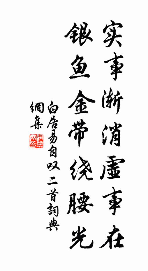 古詩文歷史字典書法欣賞書法字典國語詞典說文解字康熙字典古漢語字典實事漸消虛事在,銀魚金帶繞腰光白居易 《自嘆二首》名句出處出自唐代白居易的《自嘆二首》全文:形羸自覺朝餐減,睡少偏知夜漏長。實事漸消虛事在,銀魚金帶繞腰光。二毛曉落梳頭懶,兩眼春昏點藥頻。唯有閒行猶得在,心情未到不如人。名句書法欣賞實事漸消虛事在,銀魚金帶繞腰光書法作品白居易名句,自嘆二首名句名句推薦呼兒徑買北湖酒,澆吾瀾翻說詩口吳則禮《紅梅》野僧偶向花前定,滿樹狂風滿樹花元稹《定僧》止呼大義周王澤,蔽以無邪孔氏思項安世《又用韻酬贈潘楊二首》鄰家酒熟逆鼻香,一醉乾坤墮冥漠劉子翬《懷舊歌》楊花終日空飛舞,奈久長難駐秦觀《一落索·楊花終日空飛舞》深恩未報雲天施,弱質易驚蒲柳秋余靖《和王子元同歸曲江有感》詔旨已聞班郡紱,徵書看即動蒲輪趙蕃《呈郭峽州二首》崇福略無王事,自慚也費縣官吳則禮《寄介然二首》已惜落英鋪滿地,更憐幾片罥蛛絲樓鑰《海棠》東風先報上林春溫鏜《少年游》海域逍遙境,榮途淡泊心余靖《寄題廣州田諫議頤堂》絮花飛起雪漫漫,長得宮娥帶笑看。劉贊《句》便是全真苗裔尹志平《西江月》累劫從初地,為童憶聚沙孟浩然《登總持寺浮圖》擷露來山阿,斸煙去岩罅宋祁《九日藥市作》詩詞推薦年逾古希鬚髮並白惟眉玄如初艾性夫〔宋代〕種種閒愁先上眉,愁應白早不應遲。定知白了愁誰管,直到無愁是白時。送人歸吳齊己〔唐代〕比說歸耕釣,迢迢向海涯。春寒遊子路,村晚主人家。□□□□□,□山綠過茶。重尋舊鄰里,菱藕正開花。行軍雪後月夜宴王卿家岑參〔唐代〕子夜雪華餘,卿家月影初。酒香薰枕席,爐氣暖軒除。晚歲宦情薄,行軍歡宴疏。相逢剩取醉,身外盡空虛。題雁塔許玫〔唐代〕寶輪金地壓人寰,獨坐蒼冥啟玉關。北嶺風煙開魏闕,南軒氣象鎮商山。灞陵車馬垂楊里,京國城池落照間。暫放畫虎汪廣洋〔明代〕虎為百獸尊,罔敢觸其怒。惟有父子情,一步一回顧。戲足柳公權聯句蘇軾〔宋代〕人皆苦炎熱,我愛夏日長。薰風自南來,殿閣生微涼。一為居所移,苦樂永相忘。願言均此施,清陰分四方。峽中寓止二首鄭谷〔唐代〕荊州未解圍,小縣結茅茨。強對官人笑,甘為野鶴欺。江春鋪網闊,市晚鬻蔬遲。子美猶如此,翻然不敢悲。傳聞湖南雪中留別戎昱〔唐代〕草草還草草,湖東別離早。何處愁 * ,歸鞍雪中道。出門迷轍跡,雲水白浩浩。明日武陵西,相思鬢堪老。積雪未晴正旦朝賀大慶殿口號八章程公許〔宋代〕擾擾勞生祗自吧,依依鄉夢五更寒。臨流釣石應無恙,歸逐鄰翁整釣竿。蒼次山晚出聞汀寇之什利登〔宋代〕山齋無一事,步到白蘋洲。灘近溪聲夜,雲寒石氣秋。煙塵深冉冉,天地入悠悠。回首東南路,干戈半白頭。