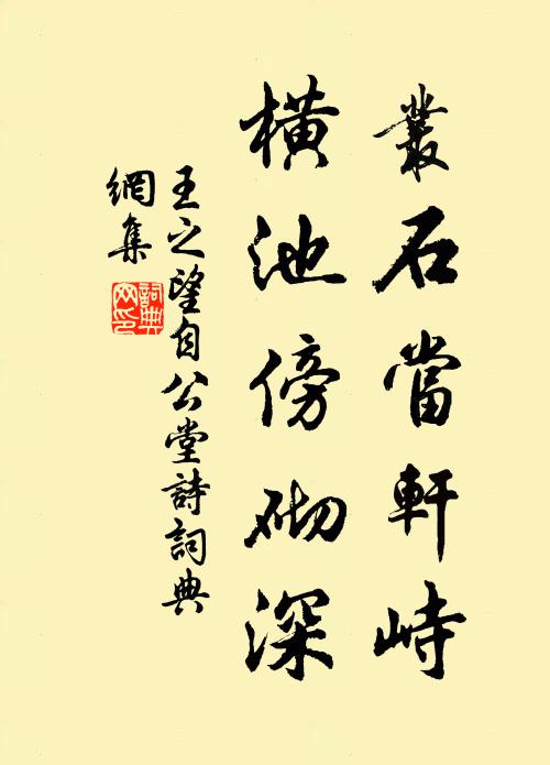 古詩文歷史字典書法欣賞書法字典國語詞典說文解字康熙字典古漢語字典叢石當軒峙,橫池傍砌深王之望 《自公堂詩》名句出處出自宋代王之望的《自公堂詩》全文:叢石當軒峙,橫池傍砌深。還將修竹繞,半入古榕陰。晝堂風瀾皺,宵憐月影侵。聊紓江海志,寄此小山林。王之望詩詞大全名句書法欣賞叢石當軒峙,橫池傍砌深書法作品王之望名句,自公堂詩名句名句推薦村酒沽來濁,溪魚釣得肥杜荀鶴《山中喜與故交宿話》難得玉人心下事劉克莊《玉樓春·戲林推》裁詩餞送雙旌行李流謙《送樊漕移帥瀘南》風前無奈倚欄乾,雪裡不堪聞杜宇白玉蟾《可惜》紅妝著處迎笑,遮路索踟躕丘崈《訴衷情(荊南重湖作)》三年黃州城,飲酒但飲濕蘇軾《岐亭五首》只應分付女,留與外孫傳白居易《題文集櫃》只看雲斷成飛雨,不道雲從底處來朱熹《偶題》攝衣升殿墀,龍瘢儼當位韓維《游漢高帝祠》夜宴設邏臣拜洗,兩朝厥荷情感勤余靖《胡語詩》冷坐松陰指顧誰,說無義語放憨痴釋紹曇《豐乾贊》結茅依翠微,伐木開蒙籠劉長卿《題蕭郎中開元寺新構幽寂亭》慨念同遊人,大半成異物釋文珦《冬日山中遣興》白石春泉上庾信《詠畫屏風詩 十七》路逢酒陸道士,知是千歲人蘇軾《陶驥子駿佚老堂二首》詩詞推薦雨花台王安石〔宋代〕盤互長乾有絕陘,並包佳麗入江亭。新霜浦漵綿綿淨,薄晚林巒往往青。南上欲窮牛渚怪,北尋難忘草堂靈。箯輿訪徐長史留題水閣李中〔唐代〕君家池閣靜,一到且淹留。坐聽蒹葭雨,如看島嶼秋。杯盤深有興,吟笑迥忘憂。更愛幽奇處,雙雙下野鷗。宿昔杜甫〔唐代〕宿昔青門裡,蓬萊仗數移。花嬌迎雜樹,龍喜出平池。落日留王母,微風倚少兒。宮中行樂秘,少有外人知。同張伯子威子季子雉聞子陸及之時子政家弟輔章甫〔宋代〕南城有隱居,靜退我所與。兩窮成邂逅,一笑同出處。翛然五畝園,耕種了寒暑。朱櫻前日栽,茂密已如許。今歲送陶少府赴選李群玉〔唐代〕陶君官興本蕭疏,長傍青山碧水居。久向三茅窮藝術,仍傳五柳舊琴書。跡同飛鳥栖高樹,心似閒雲在太虛。自是送趙僉判美任與輻二首姚勉〔宋代〕佐幕此三年,邦人盡說賢。吏寒清夜月,民暖小春天。祖帳旗交彩,歸裝石壓船。甘棠在何許,積粟市橋邊。陪晦翁游玉澗李呂〔宋代〕夜琴響空山,臨流水方折。老仙何處來,欣賞共清絕。不知盧仝家,還有許風月。離楚夜泊高麗館寄楊克一甥四首張耒〔宋代〕士師我自出,爽邁凌清秋。年少不飲酒,昏燈夜問囚。爾家外大父,聽獄代其憂。備飢朝煮飯,驅蚊夜張幬。獄成梁三朝雅樂歌 需雅 三沈約〔南北朝〕九州上腴非一族。玄芝碧樹壽華木。終朝采之不盈掬。用拂腥膻和九榖。既甘且飫致遐福。招山陽高徐二生飲二首袁說友〔宋代〕欲作山陰興盡回,良思與子把離杯。要須人境俱清絕,好抱瑤琴踏雪來。