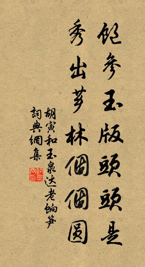 古詩文歷史字典書法欣賞書法字典國語詞典說文解字康熙字典古漢語字典飽參玉版頭頭是,秀出薌林個個圓胡寅 《和玉泉達老餉筍》名句出處出自宋代胡寅的《和玉泉達老餉筍》全文:籜龍孤介亦駢闐,不比花嫣與柳眠。雪裡頓超千佛地,風來應上西禪天。飽參玉版頭頭是,秀出薌林個個圓。知我遠庖薇蕨少,倒籠登俎共便娟。名句書法欣賞飽參玉版頭頭是,秀出薌林個個圓書法作品胡寅名句,和玉泉達老餉筍名句名句推薦善烹寒食茗,能變早春園李敬方《題黃山湯院》汝年故未耄,亢健侔霜鷹方回《讀放翁詩作》孰如吾二人,一見意軒豁林季仲《送真歇禪師》偶來恰值菊花時晁補之《臨江仙》梁王吹台側,五月多荷花梅堯臣《送李信臣尉節縣先歸湖州》喜聞韓古調,兼愛近詩篇元稹《見人詠韓舍人新律詩,因有戲贈》蝶殘蚍蜉喜,鼠腐鴟鴉集陸游《晨興》過了一年,又是添一歲佚名《掛金索》一旦敵兵來,萬民同隕濩蘇拯《經鶴台》老檜如憧翠接連,山茶作塔綠縈纏楊萬里《寒食雨中,同舍約游天竺,得十六絕句呈陸務》浩歌出門去,我亦歸瞢騰蘇軾《上元夜(惠州作)》為余勢負天工背,索取風雲際會身秦韜玉《仙掌》中山翠微仙子,滿目泛靈砂侯善淵《訴衷情》那知山村梅樣癯,肯向人言飯不足王義山《贈山村梅癯》船板鷺行乾有跡,菊花鹿踐曲生苗徐照《湘口》詩詞推薦少年游·楓林紅透晚煙青蔣捷〔宋代〕楓林紅透晚煙青,客思滿鷗汀。二十年來,無家種竹,猶借竹為名。春風未了秋風到,老去萬緣輕。只把平生,閒蝶戀花 錢塘燈夕 永樂大典卷二萬三百五十四貫雲石〔元代〕燈意留人云自列。六市輕簾,*露錢塘月。十二修鬟流翠結。東風搖落仙肌雪。淺淺銀壺催曉色。蘭影香中,總是吳太守醉道人〔宋代〕暫別蓬萊海上游,偶逢太守問緣由。身居北斗星杓下,劍掛南宮月角頭。道我醉來真箇醉,不知愁是怎生愁。相逢別蘄春王判官裴夷直〔唐代〕四十年來真久故,三千里外暫相逢。今日一杯成遠別,煙波眇眇恨重重。重九與劉學錄陳宓〔宋代〕休暇常難值,招邀愧已頻。暫辭霜際菊,終作雨來人。適意能迂訪,秋芳正錯陳。桂蘭供俯仰,況有拒霜新。鷓鴣天廖行之〔宋代〕飛盡林花綠葉絲。十分春色在荼。多情幾日風朝雨,留戀東風未許歸。天意好,與君期。如今且醉□蛾眉。明年上題蘇才翁草書壁後黃庭堅〔宋代〕老公不得千年壽,何況高材傲世人。唯有草書三昧法,龍蛇夭矯鎖黃塵。送客之潤赴時貴約武衍〔宋代〕折柳亭邊未問津,江山先入夢來頻。漕渠水足新逢雨,客路風光恰是春。莫論孫劉悲既往,原言賓主樂相親。曾留買雞姜特立〔宋代〕野處買雞專報曉,從今不問夜何其。老夫輾轉苦無寐,恰似度關初聽時。和王主簿陳宓〔宋代〕為問西來何處船,風餐霜宿更安眠。殘燈一點明於月,只傍前洲白鷺邊。