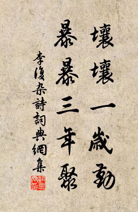 古詩文歷史字典書法欣賞書法字典國語詞典說文解字康熙字典古漢語字典壤壤一歲勤,暴暴三年聚李復 《雜詩》名句出處出自宋代李復的《雜詩》全文:先王急民事,分吏察壠畝。田荒宅無1一1毛,置法責粟布。壤壤一歲勤,暴暴三年聚。農政久不修,幾家有禾黍。李復詩詞大全名句書法欣賞壤壤一歲勤,暴暴三年聚書法作品李復名句,雜詩名句名句推薦相馬有伯樂,畫馬有伯時方回《為徐企題趙子昂所畫二馬》白團為我破,華燭蟠長煙杜甫《湘江宴餞裴二端公赴道州》酒到愁多破亦難趙長卿《南鄉子》燕山樂,又使符踵至,趣赴淇園佚名《沁園春》富貴如朝露,英雄幾曉星俞桂《性拙》箕潁元非爭奪場,瀟湘自古水雲鄉陸游《初夏喜事》南橘北為枳,古來豈虛言張彪《敕移橘栽》鏡里朱顏一寸埃,感時懷抱向誰開虞儔《和宋宰立春雨》一聲初起曉光浮,吟笛啼猿亦暗羞趙湘《聞曉角》頗聞蜀錦猶相待,去歲今朝已雪如范成大《病中聞西園新花已茂,及竹逕皆成,而海棠亦》但許一日澤,不得月與旬元稹《賽神》奈何於吾儕,一筆獨不與李處權《簡申甫求畫》星紀周天運,微陽氣候新寇準《早春》蟾苑蕭疏,雲岩芳馥黃公紹《踏莎行(同前)》如何十月天,復此連夜雨宋慶之《蘭溪道中》詩詞推薦題吳道人庵壁間米元暉畫吳則禮〔宋代〕阿暉戲拈禿筆,便與北苑爭雄。幻出幼輿丘壑,仍現一漚影中。物化劉克莊〔宋代〕今朝風物甚美,明日陰晴未知。夕陽無回照理,落花有上天時。題傅侍郎寒碧十五韻宜月陳宓〔宋代〕海底初上時,柳末清光發。滿窗璠歟映,我胸中月地。和雙溪三首曹勛〔宋代〕欲往雙溪積有年,病身須是履晴川。梅霏正作侵衣冷,余暖猶思烘火邊。陪董令升西湖閱競渡朱翌〔宋代〕馳波鬥艦疾輕鴻,歌鼓喧天保歲豐。直面北風吹雨過,捲簾斜日照樓紅。吳兒戲水用長技,太守行春如醉翁。社稷本宮投龍簡中使夏竦〔宋代〕醮罷層霄鶴吹分,夜壇香火鏤真文。羽人月筆封瑤檢,使者星馳下絳雲。蕊簡薦誠川後聳,金龍傳信洞天聞。再三送吳顯道五首王安石〔宋代〕臨川樓上柅園中,羅幃繡幕圍香風。觥船一棹百分空,看朱成碧顏始紅。杏花楊柳年年好,南去北來人自老。舊事句史達祖〔宋代〕遺像人猶思後主。再次前韻呈吳天游居士丘葵〔宋代〕心在江湖身在城,暫分禪座覺神清。秋深竹葉敲窗響,書靜蕉花照眼明。吟罷燈前窺佛偈,夢回枕上數鐘聲。未能和青溪山行衛宗武〔宋代〕北崦共幽尋,森森萬綠新。柳陰停雨棹,柏逕岸風巾。幸有寬閒野,堪娛老病身。只憐人事異,滄海亦揚塵。