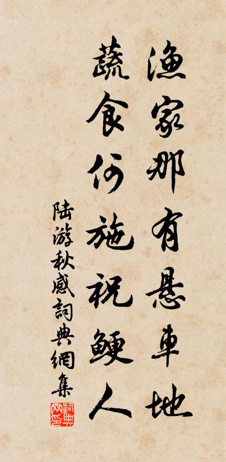 古詩文歷史字典書法欣賞書法字典國語詞典說文解字康熙字典古漢語字典漁家那有懸車地,蔬食何施祝鯁人陸游 《秋感》名句出處出自宋代陸游的《秋感》全文:聖世優容許乞身,歸來猶幸齒齊民。漁家那有懸車地,蔬食何施祝鯁人。獠婢臨溪漂衣絮,蠻童掃葉續炊薪。生涯如此仍秋暮,賴是從來慣處貧。陸游詩詞大全名句書法欣賞漁家那有懸車地,蔬食何施祝鯁人書法作品陸游名句,秋感名句名句推薦淮南奉道聞真跡,命使扁舟訪訊息李芬《送吳將軍元瑜》洞口得老翁,守死易一編劉宰《贈江西吳定夫》休心絕是非,滅意除人我馬鈺《遇仙槎 寄晏公》桃源定在深處,澗水浮來落花劉長卿《尋張逸人山居》人情容易隨流去,此道分明觸處逢魏了翁《次韻遂寧府宴貢士即席賦二首》捲簾紅袖莫相招賀鑄《浪淘沙(四之三)》想舊耘蘭蕙,依然蔥茜,新栽楊柳,亦已扶疏雷應春《沁園春》金聲兼振玉,絲緒遂成綸宋祁《哭中山公三十韻》嗟余學無窮,勺水淺可揚袁燮《和呂子約霜月感二首》我盤有枸杞,與子同一箸朱翌《與劉令食枸杞》須信情鍾易感,數良辰、佳期應誤黃機《水龍吟》水合百源爭一關,正須灩澦控奔湍鄧深《灩澦堆》壞佗臨濟一生禪,啞卻盤山三昧口釋慧遠《普化和尚贊》別來幾何如昨日,我老過前子非昔楊萬里《已酉上元後贈劉子才》客里光陰電抹袁去華《謁金門》詩詞推薦懷李商叟趙蕃〔宋代〕好在半村宅,竹添桐長枝。空餘相憶夢,不見寄來詩。苦節君耆舊,卑官我判司。因來貴溪水,一為洗塵緇。青玉峽王士禎〔清代〕廬南萬古峽,常有野雲封。朝來雷雨過,白日下飛龍。典午和尚贊釋慧遠〔宋代〕濯錦之源,怒濤洶湧吞三峽。合浦之淵,巨浪騰空接五湖。奪雙標隨手便擲,考丹霞復得賢無。顱頂方衣,踞死心秋夜有懷孟兄趙善傅〔宋代〕日落寒山剪剪風,一行雁字各西東。雖然顏面睽千里,料得相思兩地同。過郭代公故宅杜甫〔唐代〕豪俊初未遇,其跡或脫略。代公尉通泉,放意何自若。及夫登袞冕,直氣森噴薄。磊落見異人,豈伊常情度。定策幽居書事陸游〔宋代〕莫嘆人間苦不諧,清時有味是歸來。已因積毀成高臥,更借陽狂護散才。正欲清言聞客至,偶思小飲報花開。紛紛安樂公主移入新宅沈佺期〔唐代〕初聞衡漢來,移住斗城隈。錦帳迎風轉,瓊筵拂霧開。馬香遺舊埒,風吹繞新台。為問沈冥子,仙槎何處回。詠蟬李復〔宋代〕轉丸能升高,藏丸必穴深。么形感氣變,默得幽憩心。遇冬潛厚地,應暑登高林。仙術爾何知,動靜役陽陰。送懷古上人游錢塘魏野〔宋代〕正當搖落日,忽憶向江天。猿避經行路,鷗隨入定船。袖攜詩卷重,杖揭缽囊偏。約我湖心寺,相尋結白蓮。杭州雜詩和林石田汪元量〔宋代〕偶出西湖士,新蒲緣未齊。攜來鯿縮項,買得蟹團臍。問酒入新店,喚船行舊隄。亂離多殺戮,水畔幾人啼。