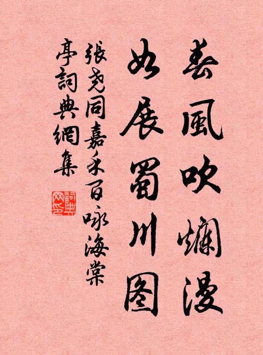 古詩文歷史字典書法欣賞書法字典國語詞典說文解字康熙字典古漢語字典春風吹爛漫,如展蜀川圖張堯同 《嘉禾百詠海棠亭》名句出處出自宋代張堯同的《嘉禾百詠海棠亭》全文:蘚砌迎煙渚,花開忽滿株。春風吹爛漫,如展蜀川圖。張堯同詩詞大全名句書法欣賞春風吹爛漫,如展蜀川圖書法作品張堯同名句,嘉禾百詠海棠亭名句名句推薦荷花永晝湘江靜,桂子西風陌路長馬之純《披香殿》豈無散木偏能壽,亦有名花不及春林泳《吟邊》貧女不知緯,幽人只此棲潘亥《社日》商量雪意未全成盧炳《鷓鴣天(題廣文官舍竹外梅花呈萬教)》蜀錦年來可作衣,西園春色故芳菲張九成《酴醿》住所真容膝,談間便解熙蘇泂《見放翁退》身名蹭蹬元無況,杯酒流行強自寬鄭剛中《偶書》相逢故人問訊,道劉郎去久無詩范成大《木蘭花慢(送鄭伯昌)》君不見昭陽夜靜玉欄邊,誰知漁陽萬騎橫戈鋋杜范《七夕歌》一身渠任黃茆里,千古名標青史間李元實《送胡季昭謫象州次王盧溪送澹庵眨新州韻》莫問調羹並止渴,枝枝且愜醉來簪白玉蟾《賦梅奉呈陳太博》家散萬金酬士死,身留一劍答君恩劉長卿《獻淮寧軍節度使李相公》深山道者家,門戶帶煙霞唐求《題楊山人隱居》俸廩雖雲薄,采菽水可啜趙蕃《題蔣伯玉作白玉山創亭於廨舍之後榜日望雲思》斗杓運轉初臨陣馬鈺《迎春樂 贈劉先生》詩詞推薦蘇武慢馮尊師〔元代〕絕粒停廚,餐霞飲露,返照自然相制。鉛生五彩,汞發三光,方顯大丹苗裔。開啟朱扉,躍出金烏,飛入玉蟾宮裡偈二十七首釋守淨〔宋代〕今朝十二,鼓聲動地。雪水上來,討甚巴鼻。直饒天雨四花,爭似歸堂打睡。至鷓鴣洞楊萬里〔宋代〕岸凍樹逾瘦,日高林始明。瑤草密如積,玉泉中暗鳴。初至心為動,欲歸腳還停。江洧千萬峰,穿儂兩鞋青。如何行香子劉志淵〔元代〕妙道勤求。樂以忘憂。要蝸名蠅利心休。六空罷對,一氣專柔。火無虧,水無缺,契添抽。百脈通流。四海週遊。贈浮梁汪易數錢時〔宋代〕君詩袞袞生蓍後,吾事昭昭未畫前。一笑相逢秋色裹,雙溪風月蜀溪邊。還琦公詩卷晁說之〔宋代〕孤山教體外,賦詩湯休上。後來數參寥,接手得宗匠。東遊四明山,懷人增惻愴。何言還老琦,二公論輩行。但欠風月陸游〔宋代〕老來苦無伴,風月獨見知。未嘗費招呼,到處相娛嬉。披襟萬里快,弄影三更奇。淋漓蜀苑酒,散落江樓詩。狂歌玉台體權德輿〔唐代〕昨夜裙帶解,今朝蟢子飛。鉛華不可棄,莫是藁砧歸。秋日寄滿子權王令〔宋代〕樓前暮靄暗平林,樓上人愁意思深。未必薄雲能作雨,從來秋日自多陰。三年客夢迷歸路,一夜西風老壯心。欲作解榻方岳〔宋代〕解榻留雲宿,山居事事幽。長貧吾道在,多病此生浮。野色連溪暝,蟲聲滿院秋。那知一丁守,蚤白十年頭。