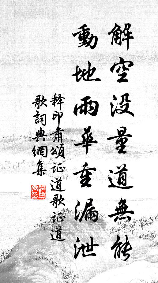 古詩文歷史字典書法欣賞書法字典國語詞典說文解字康熙字典古漢語字典解空沒量道無能,動地雨華重漏泄釋印肅 《頌證道歌證道歌》名句出處出自宋代釋印肅的《頌證道歌證道歌》全文:天龍寂聽生欣悅,來散仙花岩畔列。解空沒量道無能,動地雨華重漏泄。名句書法欣賞解空沒量道無能,動地雨華重漏泄書法作品釋印肅名句,頌證道歌證道歌名句名句推薦反秋尚百日,花葉隨風翻蘇轍《盆池白蓮》鐘聲已過,篆香才點,月到門時仲殊《訴衷情 寶月山作》去歲披雲自訪尋,交加綠玉已成林孔武仲《直舍之西植竹兩業經歲甚茂》鳴琴更不開李白《自溧水道哭王炎其三》野卉無名隨路滿,山禽著意傍人啼楊 * 《望江南》安眠夜至卯,休吏日加申陳傅良《簡友人二首》決繼海蟾的祖劉馬鈺《金蓮出玉花 贈劉公見惠鞋,以詞贈之》昔擁雕戈射鐵簾,可堪蓬鬢映冰髯劉克莊《同秘書弟賦三老各一首老兵》竇入布衫,著著便破釋道昌《自贊》琴中彈自譜,講外著詩聲顧逢《寄徐雪江珦潛山老友》白鳥迷幽浦,寒猿叫夕陽寇準《送人下第歸吳》唇口能緘,眉目如笑釋正覺《烏墩密印大師仁公真贊》咫尺不相聞,平生那可計韓愈《除官赴闕至江州寄鄂岳李大夫(李程也)》採藥知何處,柴門掩白雲唐寅《溪山翠圖》三聖重熙鴻業茂,百靈申錫寶符彰夏竦《奉和御製玉清昭應宮玉皇大殿告成》詩詞推薦和賈伯用架橋築堤韻程公許〔宋代〕策蹇僕僕忘寒溫,勞心惻惻桑棗村。長虹臥稱煙雨面,千金雨面子,千金屹障波濤痕。涉川利作初九益,括囊肯為觀春詹初〔宋代〕萬木春來花滿枝,忽來忽去迭無時。此中還有此中意,說向傍人人不知。贈梅谷高士何夢桂〔宋代〕去年無方老瞿曇,授我雲門一劄禪。今年羽衣梅谷仙,丹法葛翁口談玄。無方是兄仲梅谷,誤墮凡胎投母腹。豈非送元積弟赴永嘉酒官樓鑰〔宋代〕我家清白世相傳,工部真清更有年。百口未曾營活計,一生惟喜種心田。吾方奉母耕綿上,子更移封向酒泉。兄弟偶作二首曾協〔宋代〕世人言語盡君房,一一班聯玉殿香。解識逍遙渾一致,水鳧非短鶴非長。踏莎行·雪似梅花呂本中〔宋代〕雪似梅花,梅花似雪。似和不似都奇絕。惱人風味阿誰知?請君問取南樓月。記得去年,探梅時節。老來舊事無人西過渭州,見渭水思秦川岑參〔唐代〕渭水東流去,何時到雍州。憑添兩行淚,寄向故園流。夏日十二首張耒〔宋代〕謝守常搜句,陶潛亦效官。傍溪分水細,過巘得天寬。布種隨蔬隴,尋香到藥欄。野裝兒稚笑,繩屨鹿衣冠。再用韻賀計使高恥堂建台得雨趙汝騰〔宋代〕皇華都騎訪陳人,似灑仙瓢助守臣。亭午建台申大雨,作霖用汝澤先閩。物情是處皆忻吐,吏羽從今一洗新。陝事秋後得雨姜特立〔宋代〕亢夏書草木死,書旱火熾如書焚。秋深得雨涼,萬物生精神。庭蕉抽綠書。野草秀芳茵。風露洗芙蓉,艷質照商旻