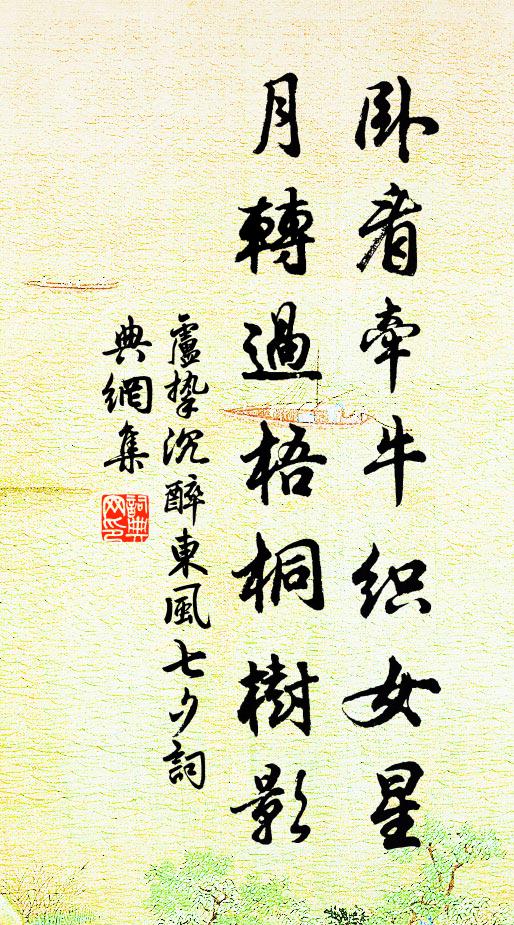 在這支小令中,作者化用唐杜牧《秋夕》,繪製成一幅靜夜(望天河)圖,並賦予新的內容、新的意境。七夕之夜,月明風清,人們焚起香來慶賀節日。渴望著心靈手巧的女子也拿出了針錢在梧桐樹影下乞巧,看牛郎織女相會。因此此曲具有一定的民俗學價值。盧摯名句,沉醉東風·七夕名句