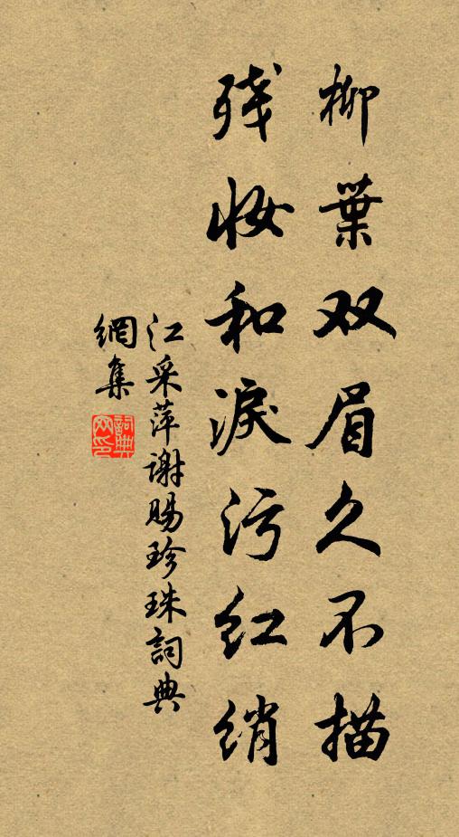 古詩文歷史字典書法欣賞書法字典國語詞典說文解字康熙字典古漢語字典柳葉雙眉久不描,殘妝和淚污紅綃。江采萍 《謝賜珍珠》名句出處出自唐代江采萍的《謝賜珍珠》柳葉雙眉久不描,殘妝和淚污紅綃。長門盡日無梳洗,何必珍珠慰寂寥。名句書法欣賞柳葉雙眉久不描,殘妝和淚污紅綃。書法作品譯文和注釋譯文我細細的柳葉眉很久不描了,面上的殘妝和著眼淚打濕了我的紅色綢衣。我自是很久沒有梳洗過了,你也不必送一斛珍珠來安慰我的寂寥之心。 注釋紅綃:紅色薄綢寂寥:寂寞空虛。簡評江采萍風韻神采,無可描畫,精通詩文,曾深受玄宗寵幸。只是楊玉環的到來使得清高孤傲的梅妃漸漸失寵。楊貴妃設法貶梅妃入冷宮上陽東宮。梅妃得寵時,各地爭相進獻梅花。但如今,大家都是忙著給楊貴妃送荔枝,誰還記得曾經專寵一時的梅妃江采萍呢?江采萍名句,謝賜珍珠名句名句推薦盡道隋亡為此河,至今千里賴通波。皮日休《汴河懷古二首》欲加之罪,其無辭乎?左丘明《左傳·僖公·僖公十年》砧杵敲殘深巷月,井梧搖落故園秋。陸游《秋思》秋草六朝寒,花雨空壇。更無人處一憑闌。朱彝尊《賣花聲·雨花台》知者不博,博者不知。老子《老子·德經·第八十一章》喜得故人同待詔,擬沽春酒醉京華。高啟《清明呈館中諸公》零淚向誰道,雞鳴徒嘆息。沈約《夜夜曲》一霎荷塘過雨,明朝便是秋聲。項鴻祚《清平樂·池上納涼》馬穿山徑菊初黃,信馬悠悠野興長。王禹偁《村行·馬穿山徑菊初黃》漠漠梨花爛漫,紛紛柳絮飛殘。陳允平《紅林擒近·壽詞·滿路花》知之曰明哲,明哲實作則。佚名《尚書·商書·說命上》處大無患者恆多慢,處小有憂者恆思善陳壽《三國志·蜀書·杜周杜許孟來尹李譙郤傳》明月照積雪,朔風勁且哀。謝靈運《歲暮》壽酒還嘗藥,晨餐不薦魚。錢起《送外甥懷素上人歸鄉侍奉》唯願當歌對酒時,月光長照金樽里。李白《把酒問月·故人賈淳令予問之》詩詞推薦浣溪沙吳禮之〔宋代〕南國風流是故鄉。紅鹽落子不因霜。於中小底最珍藏。薦酒薦茶些子澀,透心透頂十分香。可人回味越思量。滿庭芳(生日)張綱〔宋代〕十月風光,小春時候,宴堂初啟朱筵。博山雲潤,風細裊晴煙。坐有文章公子,爭吟唱、詩滿花箋。簾帷里,時聞虞美人草陳師道〔宋代〕幽草默通神,舊題虞美人。長言方度曲,應節若翻身。律呂聲相召,雲龍氣自親。無情猶感會,不獨在君臣。訪客至北門抵暮乃歸陸游〔宋代〕北郭那辭十里遙,上車且用慰無聊。九衢浩浩市聲合,四野酣酣雪意驕。清鏡新磨臨綠浦,長虹橫絕度朱橋。歸來謁墓五首劉克莊〔宋代〕庵里僧應行腳去,龕中佛也為眉嚬。炎炎昔有□□者,寂寂今無上冢人。西台詩二十四韻司馬光〔宋代〕翰苑昔陪侍,天光辱顧瞻。寵雖承渙汗,功不立毫織。山鹿纓頻頓,鉛刀礪不銛。拭花眸子缺,撚雪頷髭添。跼影即夕王初〔唐代〕風幌涼生白袷衣,星榆才亂絳河低。月明休近相思樹,恐有韓憑一處棲。酹江月(同舍延平林府教制新詞祝我初度,依聲依韻,還祝當家)劉辰翁〔宋代〕西風處士,例一枝團月,鹹平印印。千古詩宗傳不絕,至竟被渠道盡。雪返香魂,霜吹曉怨,肯受東君聘。羅浮夢西囿盧橘數株方窮秋蕭索間詫然敷榮薿薿可愛廖行之〔宋代〕寂寂園林秋暮時,可人盧橘玉英胎。祗應籬菊返魂在,滿慰金行得意歸。僵立凍峰攢翅白,霏微繁李綴枝稀。天公夏日送崔秀才游南無可〔唐代〕南方山水地,念子為貧游。縱是逢佳景,那能緩旅愁。夕陽行遠道,煩暑在孤舟。莫向巴江過,猿啼促淚流。