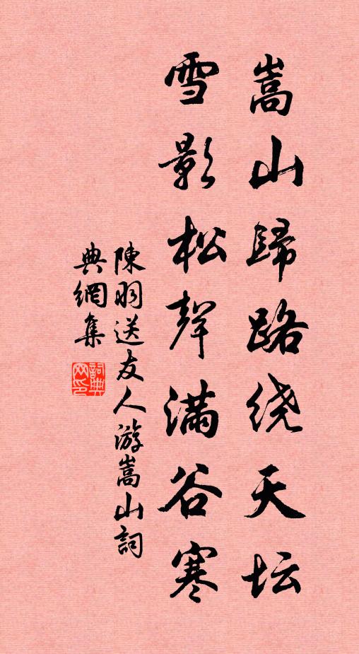 古詩文歷史字典書法欣賞書法字典國語詞典說文解字康熙字典古漢語字典嵩山歸路繞天壇,雪影松聲滿谷寒陳羽 《送友人游嵩山》名句出處出自唐代陳羽的《送友人游嵩山》全文:嵩山歸路繞天壇,雪影松聲滿谷寒。君見九龍潭上月,莫辭清夜訪袁安。陳羽詩詞大全名句書法欣賞嵩山歸路繞天壇,雪影松聲滿谷寒書法作品陳羽名句,送友人游嵩山名句名句推薦青雲直上非逾分,占上聲名五十年張鎡《陸嚴州赴召喜成三詩》窮侈勿度,宄猾相肩趙湘《送駕部劉侯赴厥詩》何事今宵景,無人解與同謝生《聯句》把滄溟倒卷,天瓢滿吸,須拼了,為君醉張野《水龍吟 和馬西麓韻》綠波北潭花影,又一年、春好是清明王惲《木蘭花慢 奉送節使賢侯分帥譙軍,兼簡仲季》革命風雲新樂府,翻身日月大文章老舍《贈河北省歌舞劇院》勝跡若猶在,雲澗清且深王徵《題謝康樂石門作》自笑詩思慳,企山才抵麓戴埴《和王教暮春出遊》人生勝事惟行樂,休問黃梁一爨間麻台文《游連山湧泉觀次文與可韻》融夜春冰泮,清甘曉露涓陳宓《和李艮翁延平山泉韻》一室何勞掃,三章自不冤杜牧《奉送中丞姊夫儔自大理卿出鎮江西敘事書懷因成十二韻》門外有田聊伏臘,望中無處不煙霞楊萬里《上巳日周丞相少保來訪敝廬,留詩為贈》紅燭剪還明,綠尊添又滿裴夷直《席上夜別張主簿》過夏功勞眠與食,誰能展卷看楞伽朱繼芳《溪寺》紫綬金章寧復戀,黃冠野服自相宜樓鑰《適齋掛冠次韻》詩詞推薦寄薛侍御楊巨源〔唐代〕世上無窮事,生涯莫廢詩。何曾好風月,不是憶君時。清夜辭十首白玉蟾〔宋代〕月明兮星稀,煙漠漠兮風悲。空階兮竹影,悄無人兮螢飛。送詹尊師歸廬山揭傒斯〔元代〕香爐峰色紫生煙,一入京華路杳然。雲碓秋閒舂藥水,雨犁春臥種芝田。書憑海鶴來時寄,劍自潭蚊去後懸。忽報小桃紅/連理枝余桂英〔宋代〕芳草連天暮。斜日明汀渚。懊恨東風,恍如春夢,匆匆又去。早知人、酒病更詩愁,鎮輕隨飛絮。寶鏡空留恨,箏題邵武熙春台呈王子文使君戴復古〔宋代〕步到風煙上上頭,恍如造物與同游。千山表里重圍過,一水中間自在流。近郭樓台隔雲見,鄰峰鐘磬出林幽。風流送司勛子才丈赴梓州蘇軾〔宋代〕別日已苦迫,見日未可期。曷不惜此日,相從把酒卮。人生初甚樂,譬若枰上棋。縱橫聽汝手,聚散豈吾知。胡為補樂歌十首五莖元結〔唐代〕植植萬物兮,滔滔根莖;五德涵柔兮,渢渢而生。其生如何兮秞秞,天下皆自我君兮化成。假守晉康出郊勸農二首曾豐〔宋代〕笑下籃輿上畫船,百千詩具已遮前。川通諸海滔滔是,魚躍於淵圉圉然。雲出山頭猶閣雨,風行水面不停煙。囊中野芳亭偶書張鎡〔宋代〕歲歲閒為福,今朝命最通。看蒲逢紫燕,弄柳得青蟲。但願詩妥帖,何心技拙工。山林過軒紱,誰謂只相同。節後赴傳岩叟之招望日同游棲隱庵華嚴寺吳岩陳文蔚〔宋代〕乘興聯翩渡小溪,輕車不怕日斜西。擬來古寺觀新扁,且向山齋讀舊題。茆屋起煙歸路暝,秋雲閣雨暮天低。人生