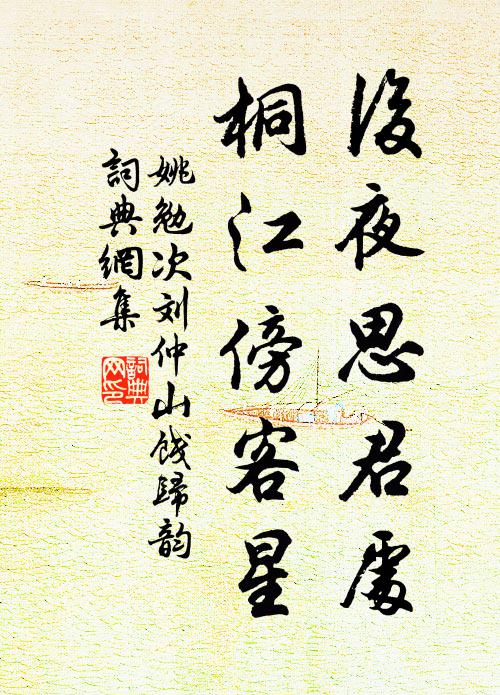 古詩文歷史字典書法欣賞書法字典國語詞典說文解字康熙字典古漢語字典後夜思君處,桐江傍客星姚勉 《次劉仲山餞歸韻》名句出處出自宋代姚勉的《次劉仲山餞歸韻》全文:幾同湖上飲,俱愛晚山青。雅趣方泉寺,離舟又浙亭。贈行詩自好,愁別酒休醒。後夜思君處,桐江傍客星。姚勉詩詞大全名句書法欣賞後夜思君處,桐江傍客星書法作品姚勉名句,次劉仲山餞歸韻名句名句推薦必欲去心垢,須彈無弦琴邵雍《洗心吟》齋前兩柏樹,其大皆十圍王洋《枯柏》遙夜宿東林,蟲聲階草深耿湋《雨中宿義興寺》只今意何有,思食故溪魚黃庭堅《以同心之言其臭如蘭為韻寄李子先》前登澳梁坂,極望溫泉分儲光羲《行次田家澳梁作》鑿鑿復濺濺,晝夜流不已白居易《李盧二中丞各創山居,俱夸勝絕,然去城稍遠》壺籌投盡無人拾,澹坐藤床風掩扉樓鑰《次仲舅韻寄拙庵》聞道將軍破海門,如何遠謫渡湘沅王昌齡《寄陶副使》世紛不可耐,道根日以淺程公許《和江平叔游無為山詩韻》此舟聊寓意,之子免乘危潘璵《橫舟亭》道衰朋友散,斯文凜將墬陸游《雜興十首以貧堅志士節病長高人情為韻》袞袞春愁無處著,試拚一飲醉如泥王邁《山郭檢踏途中聞杜鵑》枌社有誰藏舊牒,賓雲無處問遺聲楊時《和李倅游武夷》孤蓬逐吹無時定,倦鳥逢林只自休宋祁《去年十月赴淮陽今實周一歲歲中三遷遂直內禁》堪笑東坡痴鈍老,區區猶記刻舟痕蘇軾《王中父哀詞(並敘)》詩詞推薦題庵壁陸游〔宋代〕竹間僅有屋三楹,雖號吾廬實客亭。已斷雨聲重點滴,欲殘燈影更晶熒。酒惟排悶難中聖,茶卻名家可作經。頭眩勉詩僧齊己〔唐代〕莫把毛生刺,低佪謁李膺。須防知佛者,解笑愛名僧。道性宜如水,詩情合似冰。還同蓮社客,聯唱繞香燈。和漁翁四絕劉黻〔宋代〕收綱移舟月上時,西風吹當膾鱸肥。任渠官買高聲叫,醉臥蘆花別處磯。游靈岩張俞〔宋代〕玉文山後靈岩寺,四百年來選佛場。滿地白雲關不住,石泉流出落花香。西齋秋感二十首方回〔宋代〕靈運永嘉日,玄暉宣城時。池草既清唱,窗岫亦妍辭。郡勝山水媚,心賞良足怡。廟廊有顏沈,味合深己知。桐瀨趙玿赴成都府廣都縣尉以送君南浦傷如之何為李廌〔宋代〕吾生常羇旅,送客情更重。嗟哉平生交,今復萬里送。愁端寓心目,往感接魂夢。窮途獨棲遲,直道竟何用。送熊退齋歸武夷丘葵〔宋代〕穆穆朱夫子,於道集大成。嗟予亦私淑,奧義終難明。退翁獨何幸,而乃同鄉生。雖後百餘載,玄機若親承。斯人宿包山楊明府宅方回〔宋代〕今日到桐廬,登堂拜壽母。□□□□□,□□□□□。人間富豪兒,吾事弗如汝。汝縱□□□,□□□□□。□□到南昌呈宋願父伯仲黃子魯諸丈戴復古〔宋代〕一秋無便寄平安,新雁聲聲報早寒。昨夜檢衣開故篋,去年家信把來看。贈益府裴錄事盧照鄰〔唐代〕忽忽歲雲暮,相望限風煙。長歌欲對酒,危坐遂停弦。停弦變霜露,對酒懷朋故。朝看佳贍晚,夜間鴻雁度。鴻度