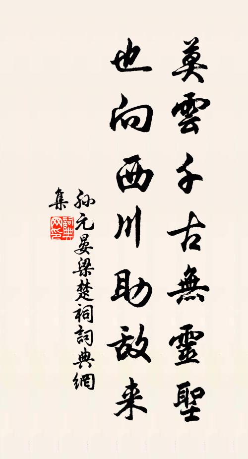 古詩文歷史字典書法欣賞書法字典國語詞典說文解字康熙字典古漢語字典莫雲千古無靈聖,也向西川助敵來孫元晏 《梁楚祠》名句出處出自唐代孫元晏的《梁楚祠》全文:曾與蕭侯醉玉杯,此時神影盡傾頹。莫雲千古無靈聖,也向西川助敵來。孫元晏詩詞大全名句書法欣賞莫雲千古無靈聖,也向西川助敵來書法作品孫元晏名句,梁楚祠名句名句推薦任令埋蠟屐,直欲鼓蘭橈朱長文《雪夕林亭小酌因成拙詩四十韻以貽坐客昔歐陽》荷鍤疏余浸,腰鐮候小晴姜特立《歌豐年》舊歲枝頭新歲景,十分好處一分花鄭清之《圃中問訊梅友老榦疏花有足喜者》低唱芙蓉菊趙必《賀新郎(生朝新淥用前韻見贈,再依調答之)》冀枝葉之峻茂兮,願俟時乎吾將刈。屈原《離騷》摘筍復盈檐,緡魚新出水梅堯臣《弟得臣殿丞簽判越州》拳拳依帝力,餘潤冀昭蘇宋庠《謁龍門無畏師塔祈雨作》今朝好,把一家和氣,散在千門王野《沁園春(子壽母)》使君祈禱走阡陌,汝切勿啼泥滑滑劉學箕《七禽詠泥滑滑》一丁不識望台官,獬豸如何可並冠徐鈞《侯思止》人疑五柳先生宅,消得攜觴與賦詩史鑄《 * 二十首》胡騎卻長嘯,晉史徒清言許翰《艤舟大藤峽口武陵使至忽奉福唐珍牘附以古風》骨肉萍蓬各天末,十度附書九不達李群玉《寄短書歌》雖無桃李園,石老松柏直方岳《山中作人名詩》適時非履險,足分不憂貧王洋《寄題韓勉夫枝巢》詩詞推薦臨江仙 偶成舒遜〔元代〕銀燭光搖秋夜永,一天涼侵詩脾。鳴蟲唧唧漏遲遲。半生春夢裡,彷佛是耶非。萬事破除惟有酒,當歌不飲何如。飲馬長城窟鄭起〔宋代〕飲馬長城窟,下見征人骨。長城窟雖深,見骨不見心。誰知征人心,怨殺秦至今。北邊風打山,草地荒漫漫。五月和李司錄喜雨詩庾信〔南北朝〕純陽實久亢。雲漢乃昭回。臨河沉璧玉。夾道畫龍媒。離光初繞電。震氣始乘雷。海童還碣石。神女向陽台。雲逐頌古十八首釋師一〔宋代〕一著機先用得親,可憐窮子眼無筋。須知八 * 書處,前箭猶輕後箭深。浣溪沙·紅橋王士禎〔清代〕北郭清溪一帶流,紅橋風物眼中秋,綠楊城郭是揚州。西望雷塘何處是?香魂零落使人愁,淡煙芳草舊迷樓。與趙智叔嶬弟泛舟回燈下張嵲〔宋代〕西風今日寒,細雨濕青嶂。微江水淥波,大石牽舟上。岸菊猶未芳,山木先後黃。滿灘圓石淨,兩岸鳴寒螿。回舟糖多令/唐多令吳潛〔宋代〕鷗鷺水中洲。夕陽天際流。倚西風、底處危樓。若使中秋無好月,虛過了、一年秋。舉眼望雲頭。蟾光一線不。想清平樂·風鬟雨鬢納蘭性德〔清代〕風鬟雨鬢,偏是來無準。倦倚玉闌看月暈,容易語低香近。軟風吹遍窗紗,心期便隔天涯。從此傷春傷別,黃昏只北齋葉適〔宋代〕人情無終極,匪陋則求佳。寢處既少安,游燕豈不懷。惟思舊酒務,糟酵茺榛埋。破瓶聚隆垤,新甃連長階。種竹嘉泰三年皇后冊寶十三首佚名〔宋代〕天臨黼扆,雲集弁纓。金石遞奏,典禮德成。玉趾緩步,龍駕翼行。言旋北極,永燕西清。