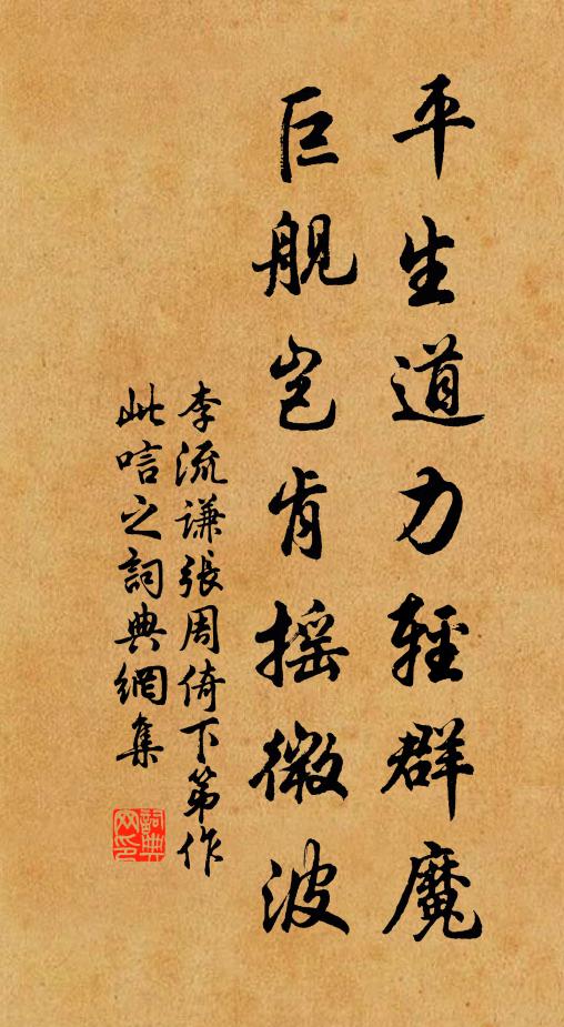 古詩文歷史字典書法欣賞書法字典國語詞典說文解字康熙字典古漢語字典平生道力輕群魔,巨艦豈肯搖微波李流謙 《張周倚下第作此唁之》名句出處出自宋代李流謙的《張周倚下第作此唁之》全文:將軍百占摧驕虜,向來射石如射虎。分封不得一丸土,晚歲功名成夢語。古來志士窮者多,星壺擊碎奈命何。平生道力輕群魔,巨艦豈肯搖微波。大千與我俱幻爾,是中無處容悲喜。西方仙人不可詆,破除憂患正須此。名句書法欣賞平生道力輕群魔,巨艦豈肯搖微波書法作品李流謙名句,張周倚下第作此唁之名句名句推薦玄冥在休許,而使威令收葛洪《癸丑臘大暖志之》朝朝來報喜,誤妾畫雙眉趙崇嶓《閨詞》才智為人謀,何事丘中麻蘇籀《大塢山寺》正江妃月姊,斗理明妝馮取洽《金菊對芙蓉》羞見關城吏,還從舊路歸岑參《戲題關門》蕭蕭打葉雖堪聽,爭似時時瀉水聲陳宓《廬山愛蓮堂觀雨》君如天上雨,我如屋下井張籍《懷別》我詩雖老竟無工,君句能佳更不窮趙蕃《簡徐季益》增卑以為高,培薄使之堅,坐復千載利,名托亡窮傳陸游《鏡湖》光暝侵燈暗,聲繁拂竹斜王禹偁《次韻和仲鹹對雪散吟三十韻》清溪瀉出瀑泉鳴,記得昌黎語不平王柏《宿寧庵聞溪聲》小池寒綠欲生漪,雨晴還日西。秦觀《阮郎歸·春風吹雨繞殘枝》逕取渠帥眾共戕,氛霾卷剝清風颺李若水《贈陳承務》一點青燈人千里,錦字憑誰寄商挺《潘妃曲·一點青燈人千里》敢勇率子弟,肆殺力弗支曹安《杜貴墓》詩詞推薦閒行至西山民家陸游〔宋代〕秋林半丹葉,秋草多碧花。隔山五六里,臨水兩三家。罾魚與伐荻,各自有生涯。平池散雁鶩,繞舍栽桑麻。客至清夜施樞〔宋代〕客身隨取止,一室冷如冰。景遠吟何托,情疏夢不曾。雨粘初蘚壁,風謝欲花燈。豈是無家者,甘為有發僧。岷山萬松圖張元乾〔宋代〕疊嶂連娟入翠微,喬松蔽日有孫枝。江流不盡松聲遠,雪棧行人力困時。送張秀才陳師道〔宋代〕學又三年積,功收一日長。擅場推老手,附尾續諸郎。度鳥界晴碧,過雲回夕黃。熟知詩有驗,莫慍路無糧。次韻十詩樓鑰〔宋代〕大率舟行岸自移,機緘何必更深思。雨余坐見水三尺,雲淨喜看天四垂。荷沼已殘霜後蓋,桂林初綻月邊枝。閒中鵲橋仙 贈相師周可山許有壬〔元代〕春秋七*,江湖萬里。老子閱人多矣。兩朝名勝一囊詩,道渾似、當時袁李。紅塵陌上,白雲堆里。擾擾浮生行止答維溪趙崇鉘〔宋代〕維溪插架三千軸,葺茝紉蘭得自娛。會須握手論活法,靜看碧水生玄珠。送客之蜀楊凌〔唐代〕西蜀三千里,巴南水一方。曉雲天際斷,夜月峽中長。詠水駱賓王〔唐代〕列名通地紀,疏派合天津。波隨月色淨,態逐桃花春。照霞如隱石,映柳似沉鱗。終當挹上善,屬意澹交人。重到西湖蘇泂〔宋代〕都下重來百事非,故人相見少相知。絕憐水減西湖瘦,更喜兵強北虜衰。