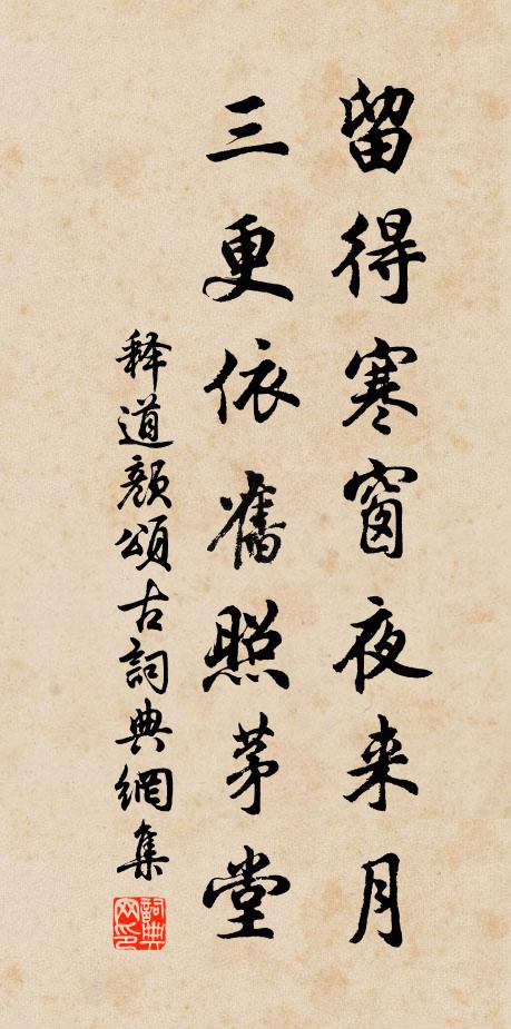古詩文歷史字典書法欣賞書法字典國語詞典說文解字康熙字典古漢語字典留得寒窗夜來月,三更依舊照茅堂釋道顏 《頌古》名句出處出自宋代釋道顏的《頌古》全文:眼中見慣是尋常,又不驚人又久長。留得寒窗夜來月,三更依舊照茅堂。釋道顏詩詞大全名句書法欣賞留得寒窗夜來月,三更依舊照茅堂書法作品釋道顏名句,頌古名句名句推薦有志未伸,有求不獲 * 《四言詩祭母文》檻前燕雁棲,枕上巴帆去杜牧《題池州弄水亭》靜觀棋得趣,閒坐石忘憂趙崇森《隱逸》扁舟小泊花溪側趙善括《醉落魄/一斛珠》雲滿長空雨漲沙,金焦一望去非賒李流謙《連日陰雨未及一到金焦二山病中得梁文佳句枕》諸生試罷書如積,劇縣歸時訟正嘩蘇轍《試院唱酬十一首其八次前韻三首之二》記芳腮妒李,細腰束素楊 * 《掃花游/掃地游》鳥催青帝馭,人重子推錢謝景初《禁菸即事》數枝開與短牆平,見雪萼,紅跗相映孫光憲《望梅花》峩峩雙髻山,瀑布瀉雲間周朴《贈雙峯山和尚》佩此八字元,傳為子孫寶五邁《寄浙漕王子文野以思君令人老五字為韻得詩五》須知所甚卑,勿謂天之高舒元輿《坊州按獄》昔母肉未寒,委身墮寇讎文天祥《先兩國初忌》傳宣賜酒飲杯巡佚名《鷓鴣天·月滿蓬壺燦爛》曼衍山川環故國,昇平歌吹沸高樓韓琦《安陽好/憶江南》詩詞推薦緣識宋太宗〔宋代〕莫問仙家不死鄉,泥丸秘密隱身光。華池積潤無拘束,勤習通流看上方。古意宋祁〔宋代〕虎嘯雲岩下,風生林嶺隅。須防威可假,慎勿逐城狐。賀新郎程正同〔宋代〕久矣無循吏。自當年、弘寬去後,風流誰繼。律令喜為鷹擊勇,無復柔桑馴雉。何幸見、真儒小試。手種海棠三百次韻因上人晚菊簡魏定父王之道〔宋代〕荊棘困松柏,風雨亂昏曉。干戈幾時息,年來費天討。孤芳如謝安,端恐非小草。此意誰人知,伊余相自保。勿願壽呂南公〔宋代〕勿願壽,壽不利貧只利富。君不見生平齷齪南鄰翁,綺紈合雜歌鼓雄,子孫奢華百事便,死後祭葬如王公;西家老贈蜀中相士范思齊往全州見萬先之教授楊萬里〔宋代〕兩腳那解上金鑾,兩手只合把釣竿。比身管樂兒時態,已翻九河洗我肝。范生來自浣花里,眼中之人定誰貴。百鍊同張公望湖上避暑到四聖觀招柏堂月潭二道士姚勉〔宋代〕清晨琴有客來,畏暑畏避地。涼多獨湖上,一棹拍空翠。長堤舞楊柳,余雨在荷芰。炎蒸俱已失,滿抱足清意。頗瞻彼洛矣佚名〔先秦〕瞻彼洛矣,維水泱泱。君子至止,福祿如茨。韎韐有奭,以作六師。瞻彼洛矣,維水泱泱。君子至止,鞸琫有珌。寄縣學方晦之強至〔宋代〕素志青雲已貼然,風霜苦處涉層巔。不知未第方夫子,獨抱遺經議聖賢。舟過嚴陵灘將謁祠登台舟人夜解及明已遠至桐蘇轍〔宋代〕扁舟匆草出山來,慚愧嚴公舊釣台。舟子未應知此恨,夢中飛楫定誰催。嚴公釣瀨不容看,猶喜桐君有故山。多病