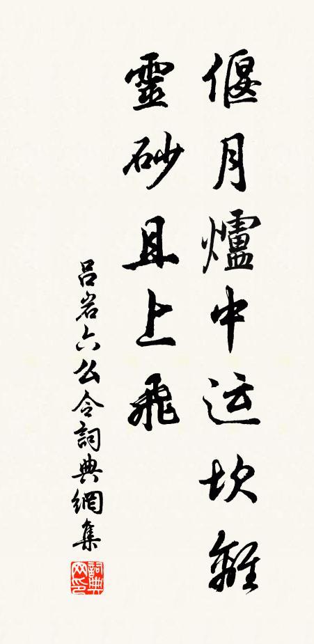 古詩文歷史字典書法欣賞書法字典國語詞典說文解字康熙字典古漢語字典偃月爐中運坎離,靈砂且上飛呂岩 《六么令》名句出處出自唐代呂岩的《六么令》全文:東與西,眼與眉。偃月爐中運坎離,靈砂且上飛。最幽微,是天機,你休痴,你不知。呂岩詩詞大全名句書法欣賞偃月爐中運坎離,靈砂且上飛書法作品呂岩名句,六么令名句名句推薦何處離群鳥,孤飛深夜鳴張耒《春暮有感二首》上馬與聯轡,下馬與飲酒楊維楨《王氏女》風回山火斷,朝落岸冰高。名終埋不得,骨任朽何妨。裴諧《句》水色本正白,積深自成綠楊萬里《江水》西來祖意實無意,妄想狂心歇便休釋如珙《頌古四十五首》我本人間有胡僧,只堪林下續傳燈史彌寧《再入湖南境》波濤漏網魚龍活,日月無光螮蝀昏呂夏卿《謁張相公祠》清嘯穿林鸞鳳吟,草書落紙龍蛇走陸游《醉中作》聖有中庸訓,時時著意看李覯《送黃介夫》金沙灘上月,五欲浪中翻釋大觀《馬郎婦贊》萬里蜀山險,難似上青天魏了翁《水調歌頭(趙運判師屷生日)》嘗聞雅樂與政通,乃知此語非顓蒙釋文珦《月夜聽琴歌》橫山煙雨洗秋骨,掠面溪風吹暑痕釋正覺《拜芭蕉情禪師》留君良為此,憶別鼻休酸袁甫《詠丹桂贈周純甫馮德厚》從今夜夜月,伴我照庭戶李流謙《送李司戶之官臨邛》詩詞推薦奉別堯夫先生承見留數刻漬梅酒磨瀋水飲別聊李中師〔宋代〕磨湯漬酒重分攜,景霽風和二月時。莫忘天津別君處,黃梅庭下半離披。截樹白居易〔唐代〕種樹當前軒,樹高柯葉繁。惜哉遠山色,隱此蒙籠間。一朝持斧斤,手自截其端。萬葉落頭上,千峰來面前。忽似緣識宋太宗〔宋代〕早起階前雪,縈叢壓竹欹。行人迷失路,粉壁晃書幃。初過潼疳值雨石介〔宋代〕二十年來憶華山,揚鞭西笑入秦川。浮云何苦深遮閉,豈是三峰不好賢。百字謠/念奴嬌佚名〔宋代〕太真姑女,問新來、誰與歡傳玉鏡。莫恨無人伸好語,人在藍橋仙境。一笑樽前,歡然相與,便勝瓊漿飲。殷勤客登丹陽樓(一作郎士元詩)張繼〔唐代〕寒皋那可望,旅客又初還。迢遞高樓上,蕭疏涼野間。暮晴依遠水,秋興屬連山。浮客時相見,霜凋朱翠顏。思王逢原王安石〔宋代〕自吾熊失逢原,熊觸事輒愁熊思。豈獨熊為故人,撫心良自悲。我善孰相我,孰知我瑕疵。我思誰能謀,我語聽者早春魚亭山薛稷〔唐代〕春氣動百草,紛榮時斷續。白雲自高妙,裴回空山曲。陽林花已紅,寒澗苔未綠。伊余息人事,蕭寂無營欲。客行亞尹黃侯慮囚溫處婺三州戴表元〔宋代〕金華環秀抵仙都,雁宕石門天下無。眼見朱幡出雲霧,手提丹筆洗焦枯。海魚味爽休多食,嶺馬程艱合緩驅。定有題趙坦之唐人所畫二馬陳長方〔宋代〕前身道林後曹覊,筆下馬生非可畫。心賞神駿今繪神,戲弄丹青疑造化。風鬃霧鬣何足雲,電行山立更逼真。脫遺