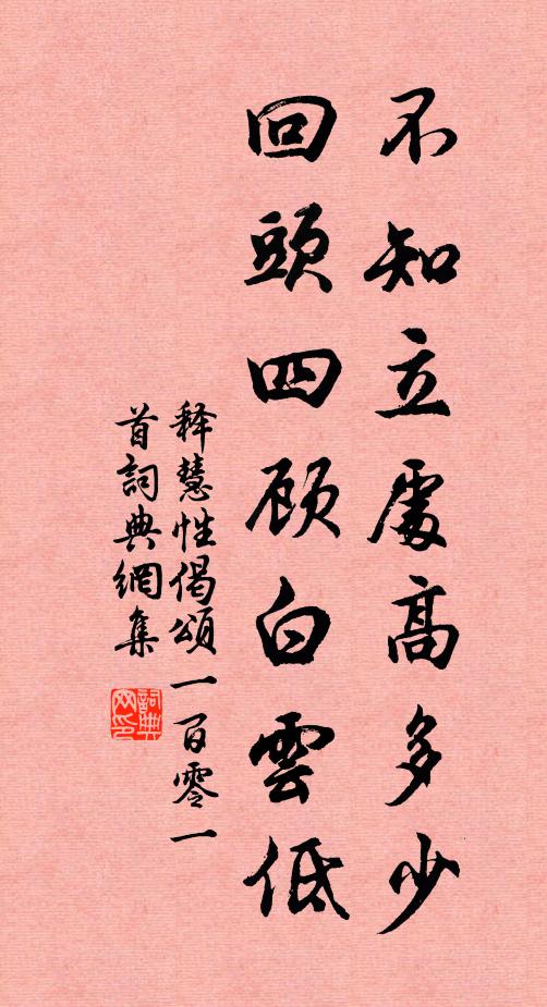 古詩文歷史字典書法欣賞書法字典國語詞典說文解字康熙字典古漢語字典不知立處高多少,回頭四顧白雲低釋慧性 《偈頌一百零一首》名句出處出自宋代釋慧性的《偈頌一百零一首》全文:不知立處高多少,回頭四顧白雲低。等閒移步毗顱頂,拽轉南辰安向西。釋慧性詩詞大全名句書法欣賞不知立處高多少,回頭四顧白雲低書法作品釋慧性名句,偈頌一百零一首名句名句推薦霜風驚度雁,月露皓疏林皇甫冉《同李三月夜作》平原草枯矣,重陽後,黃葉樹騷騷納蘭性德《風流子 秋郊射獵》寒清漾微波,暖翠團層嶂陸九淵《應天山》約靈澈共游林下,愛涅槃常坐塔中劉克莊《與林中書李禮部同宿囊山三首》陳家宅廢桑畦暗,馬道冠亡羽觀空楊諄《馬冠山》思其平生事,豈忍棄路歧蘇洵《顏書》又不見睢陽將軍怒切齒,三十六人同日死文天祥《去年十月九日余至燕城今周星不報為賦長句》日下有丹能變白,青山休恨早華顛朱翌《冬前雪珠夜下早聞遠山皆白》五月西湖涼似秋,新荷吐蕊暗香浮釋道濟《湖中夕泛歸南屏四絕》吾生如寄耳,何者為禍福蘇軾《和王晉卿》白髮又經秋,端居海上洲吳融《新秋》高懷日蕭散,外物久驅除宋祁《九日》誰家田萬頃,綠到海西頭丘葵《田間行樂》書生本欲輩莘渭,蹭蹬乃去為詩人陸游《初冬雜詠》深簫吹斷月滿堂,夢中恍惚侍玉皇熊克《葛仙山》詩詞推薦僧問四賓主因而有頌頌之釋重顯〔宋代〕如何是賓中賓。雲滿面埃塵,又曰噫。〔頌〕賓中之賓,少喜多瞋。丈夫壯志,當付何人。小樓方回〔宋代〕乾坤今古事,盡在倚欄間。初上似登塔,忽高都見山。醉眸天共遠,吟思暮忘還。城市如岩壑,誰能共此閒。題開元天寶遺事范成大〔宋代〕謝蠻舞袖貴妃弦,秦國如花虢國妍。不賞纏頭三百萬,阿姨何處費金錢?此景陳襄〔宋代〕晚崿殘霞斷,晴空宿靄收。綠鞠天夫遠,明月水同流。落葉填秋望,孤碪答旅愁。提壺伴詩筆,獨醉庚公樓。松翁承贊〔唐代〕倚澗臨溪自屈蟠,雪花銷盡蘚花乾。幽枝好折為談柄,入手方知有歲寒。代賀崇清陳侍朗正種讜誕辰王邁〔宋代〕曾夢乖槎泛銀潢,不遇張騫遇樂方。為言神仙事渺茫,仙府不在白雲鄉。丹台幻作儒珍閣,蓬島飛來雙筆堂。鶴車送李補闕知韶州徐鉉〔唐代〕南國求良牧,中朝輟諫官。君思偏念遠,臣節豈辭難。騎影過梅嶺,溪聲上贛灘。曲江宜訪古,韶石好憑欄。詩影宿機關報喻縣戲為俳禮黃彥平〔宋代〕短短長長柳,疏疏密密杉。秧深先熟稻,葉貴再眠蠶。御暑烏油傘,傷春白貯衫。鄉風盡江右,魂夢莫湘南。歸興方回〔宋代〕投老深知萬事難,骨骸熬暑又煎寒。暗量已覺窮無敵,退省猶須強自寬。稚子能吟青玉案,異人初付紫金丹。先生搖落杜甫〔唐代〕搖落巫山暮,寒江東北流。煙塵多戰鼓,風浪少行舟。鵝費羲之墨,貂餘季子裘。長懷報明主,臥病復高秋。