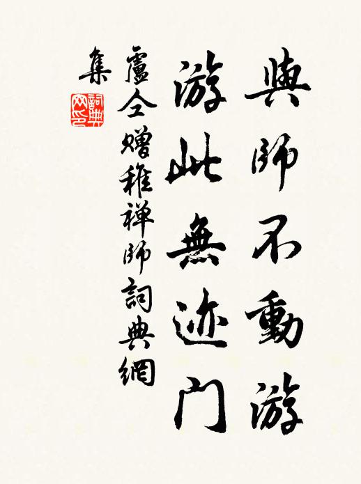 古詩文歷史字典書法欣賞書法字典國語詞典說文解字康熙字典古漢語字典與師不動游,游此無跡門盧仝 《贈稚禪師》名句出處出自唐代盧仝的《贈稚禪師》全文:春風滿禪院,師獨坐南軒。萬化見中盡,始覺靜性尊。我來契平生,目擊道自存。與師不動游,游此無跡門。盧仝詩詞大全名句書法欣賞與師不動游,游此無跡門書法作品盧仝名句,贈稚禪師名句名句推薦東圃旋移花百本,西軒恨斫竹千根蘇轍《九日獨酌三首》我年二十無朋儔,當時四海一子由蘇軾《送晁美叔發運右司年兄赴闕》任彼聲勢徒,得志方誇毗顧況《擬古三首(第一首一作長安古意)》石橋虹霓斷,馳道鹿麋游梅堯臣《依韻和唐彥猷華亭十詠秦始皇馳道》在昔無酒飲,今但湛空觴陶淵明《擬輓歌辭 其二》傅業只今惟董祀,愛人於古似鄱君項安世《送董煟歸鄱陽》夢裡遇奇士,高樓酣且歌陸游《二月一日夜夢》白日霧昏張夜燭,窮冬氣暖著春衣張蠙《喜友人日南回》冰顏未生髭,老氣欲冠古蔡肇《寄題君山亭送呂天衢秀才》著論貶臨川,談經抑老泉劉克莊《雜記十首》雨余不遣濃雲散,猶向前山擁翠微楊載《宿浚儀公湖亭》欲歌當陽春,似覺天下秋元結《閔荒詩》既有四海名,何慚萬鍾樂李賈《題式之詩卷後》天涯作客壯年事,老馬長途幾日休袁說友《過故郡渡》臨流我亦忘歸興,晴翠撲人生紫煙汪灝《錦鏡池》詩詞推薦為圃二首劉克莊〔宋代〕衰病歸來占把茅,譬如僧葺退居寮。因存橘樹斜通徑,伯礙荷花小著橋。古有功名興釣築,今無物色到漁樵。可憐縱筆陸游〔宋代〕薙草除枯葉,勞人亦動心。無愁疏把酒,習嬾罷彈琴。濯垢臨溪水,追涼就木陰。常尋省力處,外物孰能侵!和公辟轉運江西王安石〔宋代〕江西一節鑄黃金,最慰章濱父老心。長孺向來真強予,次公今不異重臨。餘風尚有歡謠在,陳跡非無勝事尋。豫想游西山蔡權〔宋代〕洞天杳杳白雲低,古木叢陰路欲迷。晝永並無人跡混,夜學惟有鳥聲啼。雨昏草色寒侵院,風入松聲響亂溪。隔宿元英先生家鸕鶿步當文正其裔孫楷全登進士贈方岳〔宋代〕唐人猶有故家存,山裹鸕鶿步下村。宗派儻容詩嗣續,橫枝吾亦是兒孫。聞嚴坦叔入朝再用前韻戴復古〔宋代〕我本江湖客,歸來二月春。居多閉門日,未卜賞花辰。繞樹鵲聲喜,隔簾鶯語新。可憐垂白叟,卻羨踏青人。宣召赴龍圖閣觀太宗御書應製楊億〔宋代〕非煙蔥蔚蒼龍闕,紫府深沈大帝居。群玉中天開策府,神龜溫洛薦圖書。珠宮岑寂經行處,金簡熒煌拭目初。曾是桂枝香柴望〔宋代〕今宵月色。嘆暗水流花,年事非昨。瀟灑江南似畫,舞楓飄柞。誰家又唱江南曲,一番聽、一番離索。孤鴻飛去,策杖尋隱士王績〔唐代〕策杖尋隱士,行行路漸賒。石樑橫澗斷,土室映山斜。孝然縱有舍,威輦遂無家。置酒燒枯葉,披書坐落花。新垂獨坐視老奴灌園陸游〔宋代〕東窗日晚獨愁予,眼闇年來頗廢書。賴有吾家老阿對,相從引水灌園蔬。