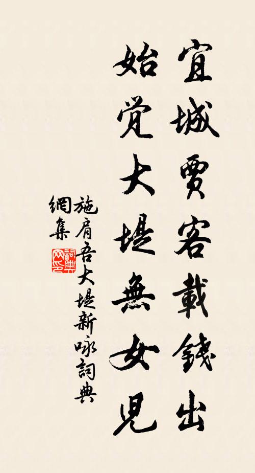 古詩文歷史字典書法欣賞書法字典國語詞典說文解字康熙字典古漢語字典宜城賈客載錢出,始覺大堤無女兒施肩吾 《大堤新詠》名句出處出自唐代施肩吾的《大堤新詠》全文:行路少年知不知,襄陽全欠舊來時。宜城賈客載錢出,始覺大堤無女兒。施肩吾詩詞大全名句書法欣賞宜城賈客載錢出,始覺大堤無女兒書法作品施肩吾名句,大堤新詠名句名句推薦先生具眼此結廬,收拾溪山入詩里韋奇《題倪文昌玉湖書院》茶洞幽窅兮懸崖飛瀑布,桃源深邃兮沿流得徑蹊白玉蟾《武夷歌》便索些別花祗待,又怎不遇偎花映月黃庭堅《望遠行》徒想嵊頂期,於今沒遺記顏真卿《贈僧皎然》鳥烏啼松行,雁鴇下沙磧陳造《繁昌早發》依然斗酒詩百篇,鎪剔造化供清妍項安世《次韻孫司戶黃堂觀醮遇雪》吾閩天下選,人傑聖時蕃敖陶孫《上鄭參政四十韻》誰將春霰天然巧,來伴寒梅別樣標袁說友《誠齋指檐頭雪為詩材二首》謹毋失己毋失人,贈人以言豈吾能樓鑰《送袁和叔尉江陰》正念有冰壺,日日如此涼陳耆卿《以新涼入郊墟為韻簡葉孟我丈》天朴非外假,至人常晏如錢起《送沈仲》霜清潦淨榮名薄,棗熟花香道力肥吳泳《壽崔侍郎三首》可憐嬌舞曹家女,不嫁春風嫁白雲釋紹曇《疏山塔》石小難鐫志,庵荒少送車劉克莊《瀾湍送葬一首》昔聞生澗底,今見起毫端崔峒《詠門下畫小松上元王杜三相公(一作錢起詩)》詩詞推薦贈趙伯魚韓駒〔宋代〕學詩當如學參禪,未悟且遍參諸方,一朝悟罷 * 眼,信手拈出皆成章。蟾宮曲 夢中作鄭光祖〔元代〕敝裘塵土壓征鞍,鞭倦裊蘆花,弓箭蕭蕭,一逕入煙霞,動羈懷,西風禾黍,秋水蒹葭,千點萬點,老樹寒鴉,三上灘葉適〔宋代〕篙師上灘時,面作石皤樣。及其進尺寸,乃在一偃仰。神禹不到地,狂流終播盪。逆順本天力,人謀不相讓。苦戰送楊少府赴選李白〔唐代〕大國置衡鏡,準平天地心。群賢無邪人,朗鑒窮情深。吾君詠南風,袞冕彈鳴琴。時泰多美士,京國會纓簪。山苗中秋旅懷釋尚能〔宋代〕所畜惟騷雅,兼之得固窮。望鄉連北斗,聽雨帶西風。稼穡村坊遠,煙波路逕通。冥搜清絕句,恰似有神功。病癒簡劉小村文天祥〔宋代〕秋光沁人骨,意氣曉來新。古鼎龍團雪,虛檐麈尾春。商山弈棋老,赤壁洞簫賓。風月真倉扁,招呼入屋頻。和兒咨夔夜坐韻洪鉞〔宋代〕樓底雪知峰,樓頭著寓翁。梅方開萼綠,桃已亞枝紅。斟淺偏勞勸,眠遲不受烘。錦城春在眼,何暇問蠶叢。和潁川公秋夜詩庾信〔南北朝〕泬寥空色遠。葉黃淒序變。洞浦落遵鴻。長飈送巢燕。千秋流夕景。百籟含宵囀。峻雉聆金柝。曾台切銀箭。謁翰林劉學士不遇李山甫〔唐代〕夢繞清華宴地深,洞宮橫鎖曉沈沈。鵬飛碧海終難見,鶴入青霄豈易尋。六尺羈魂迷定止,兩行愁血謝知音。平生浣溪沙(人日過靈泉寺次韻少壯)李壁〔宋代〕祗記梅花破臘前。惱人春色又薰然。山頭井似陸公泉。上客長謠追楚些,嬌娃短舞看胡旋。崇桃積李自年年。