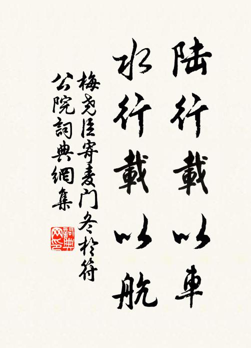 古詩文歷史字典書法欣賞書法字典國語詞典說文解字康熙字典古漢語字典陸行載以車,水行載以航梅堯臣 《寄麥門冬於符公院》名句出處出自宋代梅堯臣的《寄麥門冬於符公院》全文:佳人種碧草,所愛凌風霜。佳人昔已歿,草色尚蒼蒼。陸行載以車,水行載以航。於今五六年,與我道路長。思人不忍棄,期植寒冢傍。我嗟復北去,安得畢此喪。留植精舍中,遠挈防根傷。他時京峴下,不比野蒿黃。名句書法欣賞陸行載以車,水行載以航書法作品梅堯臣名句,寄麥門冬於符公院名句名句推薦鳴儔嘯匹侶,列坐竟長筵曹植《名都篇》香焚金鴨鼎,閒傍小紅樓關漢卿《【正宮】白鶴子》算何似、向時風景邵亨貞《氏州第一 丙申初冬次錢素奄韻》溪橋買酒經過熟,鄰舍分茶笑語間連文鳳《送沈伯儁回霅》少壯欲及物,老閒余此心蘇軾《次韻定慧欽長老見寄八首》鳳頂孤峰聳絕奇,仙家雲馭久棲遲何群《降真岩》送君匹馬別河橋,汝南山郭寒蕭條劉長卿《送姨子弟往南郊》夢往謂知路,佶屈迷晻暖汪炎昶《次韻王子植見寄》寒林人靜每歸鴉朱雍《浣溪沙》澗壑雖雲深,蕭艾寧廢諸趙蕃《與蘇運使詡四首》村旆詫酒美,賒來滿鋞程陸龜蒙《奉酬襲美先輩初夏見寄次韻》憤敵常旁午,憂時半孔壬曾豐《別陸德隆黃叔萬》高亭新建礙煙霞,暮景能留是可嘉邵雍《晚暉亭》一慟旁人莫相笑,知音衰盡路行難羅隱《重過三衢哭孫員外》龍音終不死,鳳實尚餘甘石介《竹書筒二首》詩詞推薦心老得法天柱修靜能道黃龍會中諸耆舊及他宗張嵲〔宋代〕口如布穀本無語,身似虛空何所還。觀音岩迥出雲雨,好住幽窗望小山。桂枝香 壽馬宣差詠桂朱唏顏〔元代〕何年月地。有白鳳飛來,與秋遊戲。碎屑黃金馥馥,暗熏沉水。如來粟界開全未,直著得、許多清氣。飽諳風露,廣孝寺王洋〔宋代〕前朝締結梵王宮,秘咒長因乞歲豐。隆報自惟追廣孝,修除真可效臣忠。春日有感孟郊〔唐代〕雨滴草芽出,一日長一日。風吹柳線垂,一枝連一枝。獨有愁人顏,經春如等閒。且持酒滿杯,狂歌狂笑來。冬至稱賀紫辰殿及德壽宮楊萬里〔宋代〕宮燭奔忙下玉除,晨曦拂掠麗儲胥。東西班動雲開合,警蹕聲來電卷舒。隆準衣裳紅一點,御香菸霧碧千廬。勛華因賦風箏與黃郎偶李曾伯〔宋代〕竹君為骨楮君身,學得飛鳶羽樣輕。出手能施千丈縷,舉頭可問九霄程。高窮寥曠寧無力,少假扶搖即有聲。所惜偶作寄李良甫仇遠〔宋代〕閒官長日無公事,靜室焚香讀好書。飲水飯蔬差可樂,妻兒休嘆食無魚。錄漢唐事六言五首劉克莊〔宋代〕二聖已重勸了,西京無一塵飛。白衣山人辭去,青袍拾貴步歸。酬海宗二侍者釋重顯〔宋代〕蘭之得蓀,其道必存。扶吾病起,古風入門,二兮一兮,且論勿論。三堂東湖作韋莊〔唐代〕滿塘秋水碧泓澄,十畝菱花晚鏡清。景動新橋橫螮蝀,岸鋪芳草睡??。蟾投夜魄當湖落,岳倒秋蓮入浪生。何處