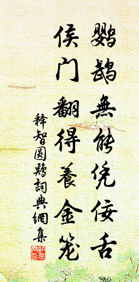 古詩文歷史字典書法欣賞書法字典國語詞典說文解字康熙字典古漢語字典鸚鵡無能憑佞舌,侯門翻得養金籠釋智圓 《雞》名句出處出自宋代釋智圓的《雞》全文:簷前棲息傍蒿叢,風雨司晨爾有功。鸚鵡無能憑佞舌,侯門翻得養金籠。釋智圓詩詞大全名句書法欣賞鸚鵡無能憑佞舌,侯門翻得養金籠書法作品釋智圓名句,雞名句名句推薦全我天真,休問白魚,且醉白雲李致遠《【雙調】折桂令 春閨》母是了翁孫,身為寄庵適王遂《送李兄謁揚州帥》悲思戀光景鮑照《送從弟道秀別詩》清吹解撩叢竹嘯,高山如客群峰衙陳造《次日再鎰韻三首》老夫歡喜見,舊與兩家游陳藻《贈陳伯融夫婦》小益提封重試可,定膺鋒召入堯庭郭印《上鄭漕二首》天資權譎性圓通,相業開元治效中徐鈞《姚崇》此理難致詰,吾其賦歸休楊冠卿《懷古》再傳至斯荒,曠望逝水悲董嗣杲《趙南康可齋築屋武康孟保園池喬木極有思致東》一世雖屈九原伸,所以絕筆於獲麟趙蕃《跋韓澗泉詩》好把青衫送酒媼,從教人識御眯香鄭猷《詠生子安應試新亭二詩》桂宮耽耽,藻們穆穆真宗《寧宗郊前朝獻景靈宮二十四首》宣之為姓世所稀,暇日試為君家推樓鑰《送宣宗禹保寧事掌書記》熙寧十年二月,始復會於澶濮之間,相從來徐,留百餘日蘇轍《逍遙堂會宿二首〈並引〉》果迷丹橘熟,洞訝赤城通王禹偁《西暉亭》詩詞推薦訪薛道士不值游九言〔宋代〕三茅俯千山,杖藜山氣佳。來尋薛道士,空房鎖煙霞。微霜染紅葉,晞露浥黃花。舞逐西風去,湖水夕陽斜。稚川約晚過進叔次前韻贈稚川並呈進叔黃庭堅〔宋代〕人騎一馬鈍如蛙,行向城東小隱家。道上風埃迷皂白,堂前水竹湛清華。春歸河曲定寒食,公到江南應削瓜。樽酒十絕句呈章茂深安撫陳造〔宋代〕經綸術業向來優,千騎東方恐未儔。他日應攜報恩子,還朝看拜富民侯。留題安州朱氏草堂歐陽修〔宋代〕俯檻臨流蕙徑深,平泉花木繞陰森。蛙鳴鼓吹春喧耳,草暖池塘夢費吟。賭墅乞甥賓對弈,驚鴻送目手揮琴。嗟予呈齡叟二首陳著〔宋代〕老師神用笑談中,不但能降大小空。自謂我心頑似鐵,也隨柳絮舞春風。【越調】小桃紅_磕瓜木胎氈荊乾臣〔元代〕磕瓜木胎氈觀要柔和,用最軟的皮兒裹。手內無他煞難過,得來呵,普天下好淨也應難躲。兀的般砌末,守著個粉浮香閣釋普濟〔宋代〕江城夜雨滿樓台,池上殘紅撥不開。慈氏家風都漏泄,善財南去未回來。好事近·分手柳花天陳維崧〔清代〕夏日,史蘧庵先生招飲,即用先生《喜余歸自吳閶》過訪原韻。分手柳花天,雪向晴窗飄落。轉眼葵肌初繡,又紅次韻李參政見寄三首魏了翁〔宋代〕湖畔三頃秫,釀成聊獨斟。積薪傷汲直,求舊感遲任。夢裡牛山峻,吟邊雁泊深。兩鄉明月夜,應照舊登臨。詩一首王拱辰〔宋代〕聖神深意念遐方,前後皆馳諭蜀郎。從此郵亭為盛事,乘軺相繼有三王。