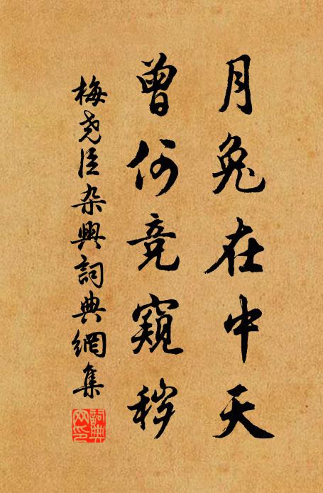 古詩文歷史字典書法欣賞書法字典國語詞典說文解字康熙字典古漢語字典月兔在中天,曾何競窺穢梅堯臣 《雜興》名句出處出自宋代梅堯臣的《雜興》全文:苦楝樹,青鵓鴣。啄鹽土,鳴嗚嗚。老鴉銜茶子,爭噪落嶺隅。不覺茶滿山,漁利入江湖。鹽由鵓鴣起,茶由老鴉趨。誘以觸禁網,二鳥誰與誅。東家月吐明,西家犬爭吠。月兔在中天,曾何競窺穢。姮娥雖夜行,莫比淫奔廢。呶呶籬下音,胡不鈐其喙。名句書法欣賞月兔在中天,曾何競窺穢書法作品梅堯臣名句,雜興名句名句推薦寶柱惜離弦,流黃悲赤縣溫庭筠《獵騎辭》心源本澄靜,皎月懸晴空真德秀《司理弟之官岳陽相別於定王台悽然有感為賦五》此客俱不心,灑落同襟期虞億《中秋同諸子九曲泛月》天低舉手挼斗倆,挹彼鉅海傾蠡杯陳宓《重九招許真諸友登高和許韻》願作貞松千歲古,誰論芳槿一朝新劉希夷《公子行》書惟見多在互解,食要良田宜廣買葉適《陳伯明建讀書堂於內戰都岩蓋縉縉雲最勝特處》第惟公輩流,自應留日邊樓鑰《分韻送孫從之司業使湖南得千字》我欲買山居其間,囊中不靳金滿籯金履祥《代張起岩和清塘詩》欲落荷花先自愁,如何落後免沉浮楊萬里《雲際院小池荷花才落,一葉急》近峰何鬱郁,平湖渺瀰漫清遠道士《同沈恭子游虎丘寺有作》重明麗宸極,萬國熙王春袁燮《上中書陳舍人三首》故國無書久,孤峰入夢頻寇準《早春》香掃塗,相公歸李賀《古鄴城童子謠效王粲刺曹操》布政莫為三載計,清朝台閣整搜人李防《送陳瞻知永州》莫將閒禍福,容易托僧伽張堯同《嘉禾百詠泗洲庵》詩詞推薦迎仙道中二首李彌遜〔宋代〕壺山孤秀似西山,道上歸人洗眼看。到我西山山有伴,不知誰伴此山閒。四絕秦觀〔宋代〕天風吹月入欄乾,烏鵲無聲子夜闌。織女明星來枕上,了知身不在人間。送家連父解綿竹丞李流謙〔宋代〕猿臂將軍數自奇,白頭州縣竟何為。斲墁未盡成風巧,測管才窺澤霧姿。流水繞除空日日,西山拄笏謾時時。一杯句潘慎修〔宋代〕如今縱得仙翁術,也怯君王四路饒。蘇幕遮馬鈺〔元代〕鬧角兒,梳得好。妙手奇功,悟後呈些巧。個個疏來無倚靠。各各惺惺,蟣虱須教少。張打油,李*老。見我風狂觀音畫贊林之奇〔宋代〕稽首補陀聞思修,千手千眼普供應。世人兩手及兩眼,眼見手捉各隨心。手一手眼無用處,即與駢拇枝指等。菩薩端午帖子溫成合四首歐陽修〔宋代〕香黍筒為棕,靈苗艾作人。芳音邈已遠,節物自常新。渡江雲 題鄭天趣三湘集朱唏顏〔元代〕渺寒雲萬里,孤*載雪,逐雁渡三湘。倦遊頻選勝,撫劍延平,貰酒過滕王。清泉自酹,秋草合、賈傳祠荒。算都晚書二首趙蕃〔宋代〕春晚苦多風,花殘不見紅。問花寧自覺,愁殺白頭翁。及瓜將行留別南山方希覺〔宋代〕南山陳跡遍搜尋,好景森羅直萬金。別後不知誰念我,經營偏費主人心。