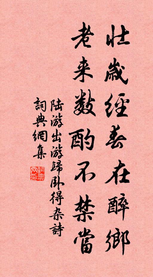 古詩文歷史字典書法欣賞書法字典國語詞典說文解字康熙字典古漢語字典壯歲經春在醉鄉,老來數酌不禁當陸游 《出遊歸臥得雜詩》名句出處出自宋代陸游的《出遊歸臥得雜詩》全文:壯歲經春在醉鄉,老來數酌不禁當。正須獨倚蒲1一1團坐,領略明窗半篆香。陸游詩詞大全名句書法欣賞壯歲經春在醉鄉,老來數酌不禁當書法作品陸游名句,出遊歸臥得雜詩名句名句推薦匣鏡頻開聊自玩,庭蕪不掃欲何圖李壁《季允用韻各賦兩章予亦再賦四首》漢錯削七國,禍生東南陬司馬光《陪同年吳沖卿登宿州北樓望梁楚之郊訪古作是》林靜有集鳥,水濶多潛魚李石《蓋公堂》北禁詔墨香,昌熾頌魯侯陳起《壽大丞相安晚先生》權量巧心計,悖道忘君父李呂《贈上官法師》催人步屧吹笙徑張炎《踏莎行》向者望望君不來,談舌攢棘胸填埃陳造《次韻解禹玉》金陵往事已成虛,江水清清只見魚高彥竹《送胡彥龍過金陵》君看孔孟氏,遇世何如哉方岳《讀折詩效其體》外家文采惟君在,笑我冰髭跨曉鞍袁桷《寄史允叟》舊與清泉白石盟,身閒方作洞霄行吳泳《嘉熙丁酉七月上游大滌題住山龔沖妙艮泓軒》平生學古胸,非為次身計崔與之《柴秘書分符章貢同舍餞別用蔡君謨世閒萬事皆》黃州不到六十里,白浪俄生百萬重蘇轍《舟次磁湖以風浪留二日不得進子瞻以詩見寄作》夜深稍稍到竹屋,曉起涓涓行瓦溝項安世《久旱得雨》江上樓高暝樹連,壯遊空慨禹山川董嗣杲《欲附蒲海雲制乾舟歸》詩詞推薦送張簽判游開先釋真淨〔宋代〕步入青松裹,迢迢一徑通。漸分華藏界,深隱法王官。道與神仙別,人非世俗同。欲知西祖意,庭柏老春風。卻到金陵登北固亭李紳〔唐代〕龍形江影隔雲深,虎勢山光入浪沈。潮蹙海風驅萬里,日浮天塹洞千尋。眾峰作限橫空碧,一柱中維徹底金。還叱天驥呈材盧征〔唐代〕異產應堯年,龍媒順制牽。權奇初得地,躞蹀欲行天。詎假調金埒,寧須動玉鞭。嘶風深有戀,逐日定無前。周滿野逕文同〔宋代〕山圃饒秋色,林亭近晚晴。禽蟲依月令,藥草帶人名。排石鋪衣坐,看雲緩帶行。官閒惟此樂,與世欲無營。次韻張錄攜書見過方岳〔宋代〕家在屏山東復東,高軒肯過白雲中。石橋自是神仙處,竹屋相傳工律工。日暮春江愁李白,山寒秋菊老龜蒙。時平留題澹岩張滉〔宋代〕偷閒切欲訪岩扃,恍若桃源洞裡春。平世自無憂國事,徘徊愁見避秦人。寄清源寺僧溫庭筠〔唐代〕石路無塵竹徑開,昔年曾伴戴顒來。窗間半偈聞鍾後,松下殘棋送客回。簾向玉峰藏夜雪,砌因藍水長秋苔。白蓮西江月(詠冬十首)張掄〔宋代〕有限光陰過隙,無情日月飛梭。春花秋月暗消磨。一歲相看又過。逢酒須成痛飲,臨風莫厭高歌。虛名微利兩如何郊行釋紹嵩〔宋代〕花落江堤簇曉煙,遊人柳外蹙秋韃。直須分付丹青手,畫出清明二月天。和范景仁王景彝殿中雜題三十八首並次韻其十梅堯臣〔宋代〕重說已經旬,應懷獨寢人。通宵彈玉枕,白晝拂床塵。幾想迎雕輦,何當快倦身。門前車馬立,疑是角生輪。