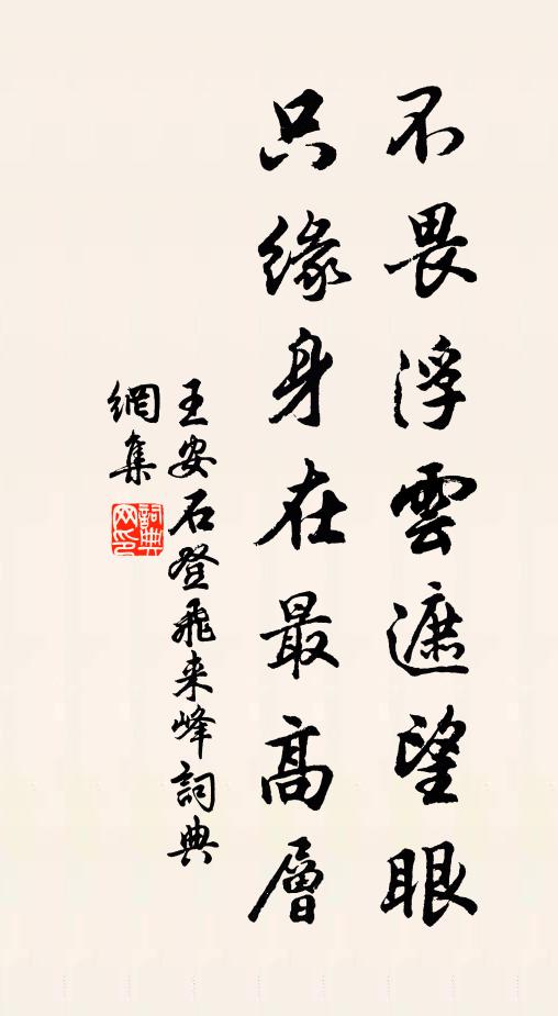 古詩文歷史字典書法欣賞書法字典國語詞典說文解字康熙字典古漢語字典不畏浮雲遮望眼,只緣身在最高層王安石 《登飛來峰》名句出處出自宋朝王安石的《登飛來峰》原文賞析:飛來山上千尋塔,聞說雞鳴見日升。不畏浮雲遮望眼,自緣身在最高層。王安石詩詞大全名句書法欣賞不畏浮雲遮望眼,只緣身在最高層書法作品王安石名句,登飛來峰名句名句推薦愁望春歸,春到更無緒文廷式《祝英台近·剪鮫綃》落花夜雨辭寒食。塵香明日城南陌。吳文英《菩薩蠻·落花夜雨辭寒食》言而當、知也;默而當,亦知也荀子《荀子·非十二子》綠鬢能供多少恨,未肯無情比斷弦晏幾道《破陣子·柳下笙歌庭院》長驅入,歌台舞榭,風卷落花愁徐君寶妻《滿庭芳·漢上繁華》秋冬雪月,千里一色;蘇軾《放鶴亭記》讀書不覺已春深,一寸光陰一寸金。王貞白《白鹿洞二首·其一》玉爐香,紅蠟淚,偏照畫堂秋思。溫庭筠《更漏子·玉爐香》以言取士,士飾其言,以行取人,人竭其行。姚察、姚思廉《梁書·本紀·卷一》渭城朝雨浥輕塵,客舍青青柳色新。王維《渭城曲 / 送元二使安西》香幃風動花入樓,高調鳴箏緩夜愁。王昌齡《青樓怨》萬樹寒無色,南枝獨有花。道源《早梅》滴不盡相思血淚拋紅豆,開不完春柳春花滿畫樓,睡不穩紗窗風雨黃昏後,忘不了新愁與舊愁。曹雪芹《紅樓夢·第二十八回》父兄有善行,子弟學之或不肖王永彬《圍爐夜話·第三三則》言不中,行不謹,辱也。王通《中說·卷一·王道篇》詩詞推薦題白鹿蘭若李涉〔唐代〕只去都門十里強,竹陰流水繞迴廊。滿城車馬皆知有,每喚同游盡道忙。頌古二十四首釋宗演〔宋代〕今朝三月初十,大野和風襲襲。不用轉腦回頭,向此一時證人。冬日張耒〔宋代〕忽忽新冬無一旬,自憐憔悴楚江濱。滿前魑魅何曾御,尚愧無功作逐臣。花落(一作沈佺期詩。題雲梅花落)宋之問〔唐代〕鐵騎幾時回,金閨怨早梅。雪寒花已落,風暖葉還開。夕逐新春管,香迎小歲杯。盛時何足貴,書里報輪台。左綿席上呈知郡王虞部石介〔宋代〕何事相逢悲喜並,倏然相別二周星。主人鬢髮無多白,幕客襤衫依舊青。目極同思故山斷,涕危共在異鄉零。階前登西樓呈桑彥周李新〔宋代〕獨自行藏莫倚欄,市廛野色不相干。是中門戶也羅雀,何處身心更夢棺。錦水背人朝暮去,雪山隨我久長寒。一生李審言相招與刁景純周仲章裴如晦馮當世沈文梅堯臣〔宋代〕自君命我飲,朝暮雨傾瓦。城東與城北,大道泥沒馬。敢忘主人勤,顛撲困馭者。眾客亦如期,陳餚藉蘭若。馮裴庚午春觀新進士錫宴瓊林苑因書所見宋庠〔宋代〕秘苑儀星地,群英得雋年。飛綏鯨浦右,供帳斗城偏。表道槐陰直,凌氛柞影圓。叢楹開玉宇,華組會瓊筵。湛湛次韻虞永康十月海棠魏了翁〔宋代〕春意何曾間四時,芸芸靜處錦成帷。非關造化呈新巧,鈞播無心自不知。扇子詩李石〔宋代〕葉葉深雲湛碧,花花晴日搖紅。當是身薰成種,不乾秋水香風。